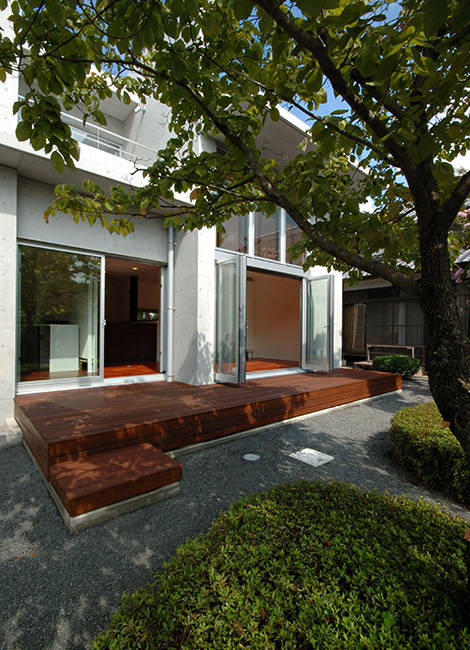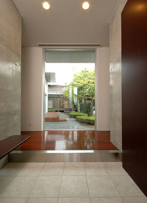 敷地はご実家の広い庭だった場所で、南側と東側が道路に面した角地となっています。配置計画としては、生活道路として人の行き来が多い南側道路面をできるだけ閉ざし、北側に建っているご両親の住宅に向って開く形としています。また敷地に沿って建物をL型にし、西日を遮りながら中庭をつくり、新旧の住宅でコートハウス的な空間を創ろうと考えています。既存樹木であるハナミズキを中心とした中庭を囲んで、家族がいままで以上に仲良く幸せに暮らすことを期待しています。