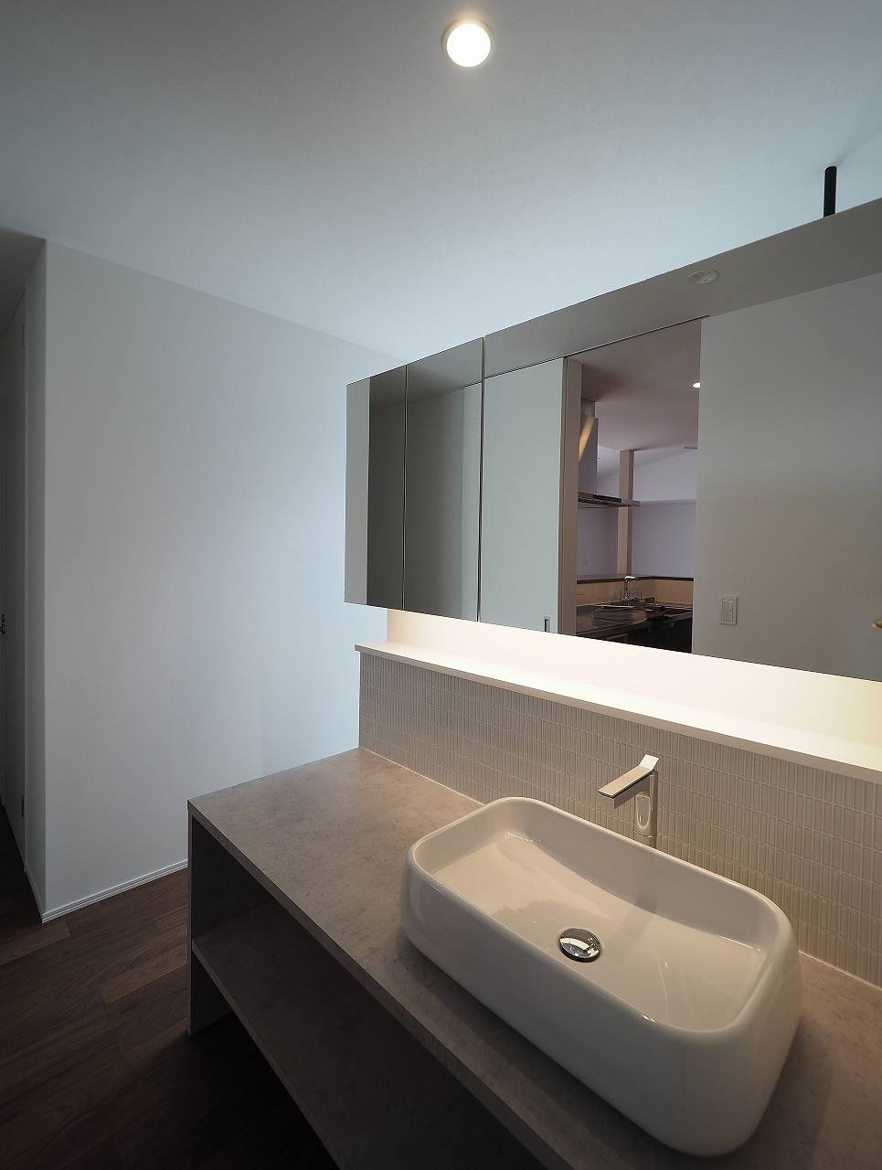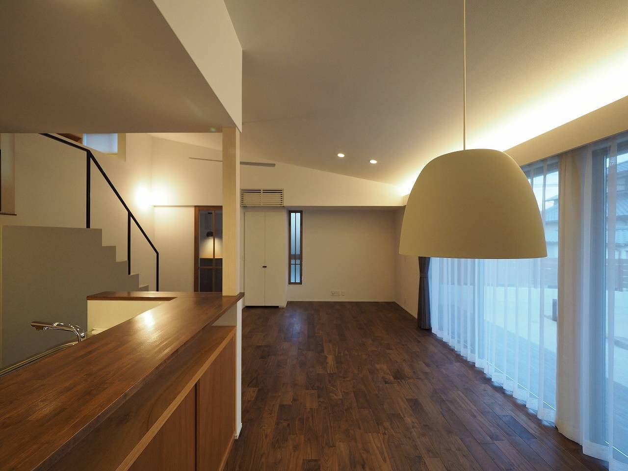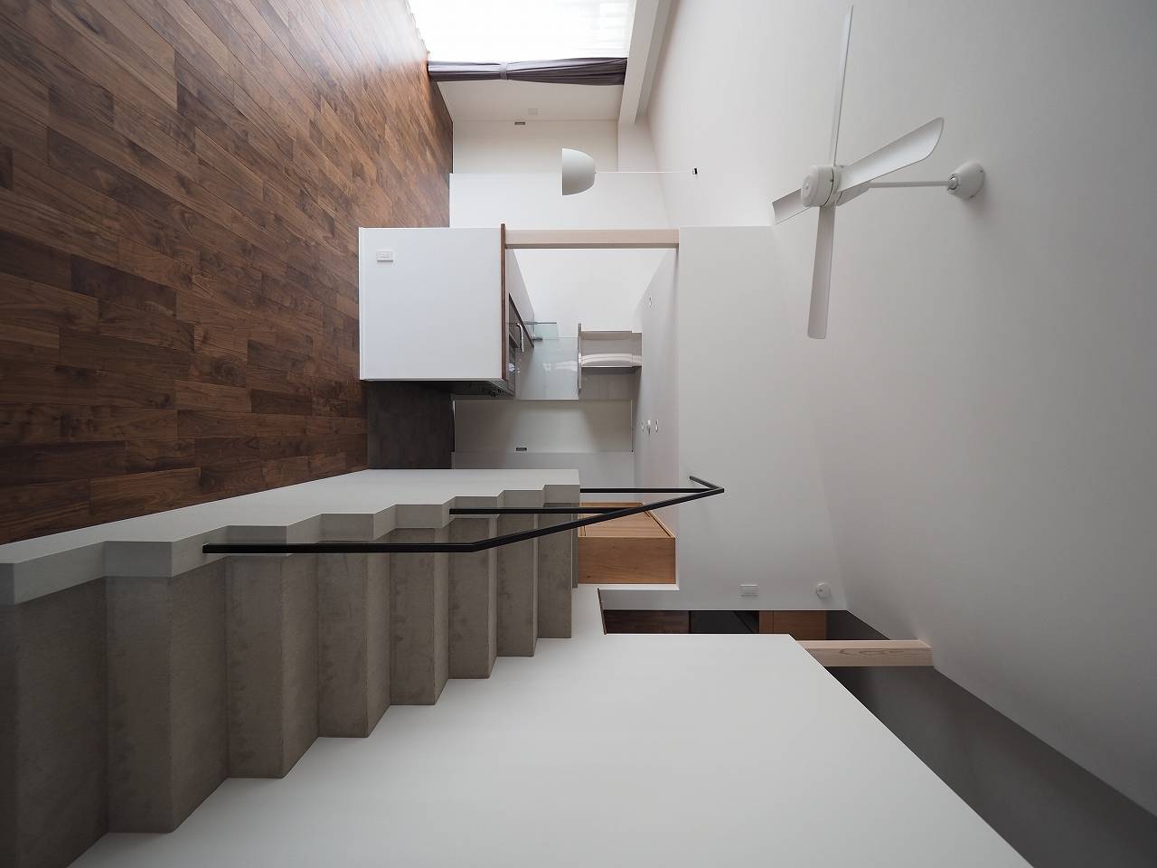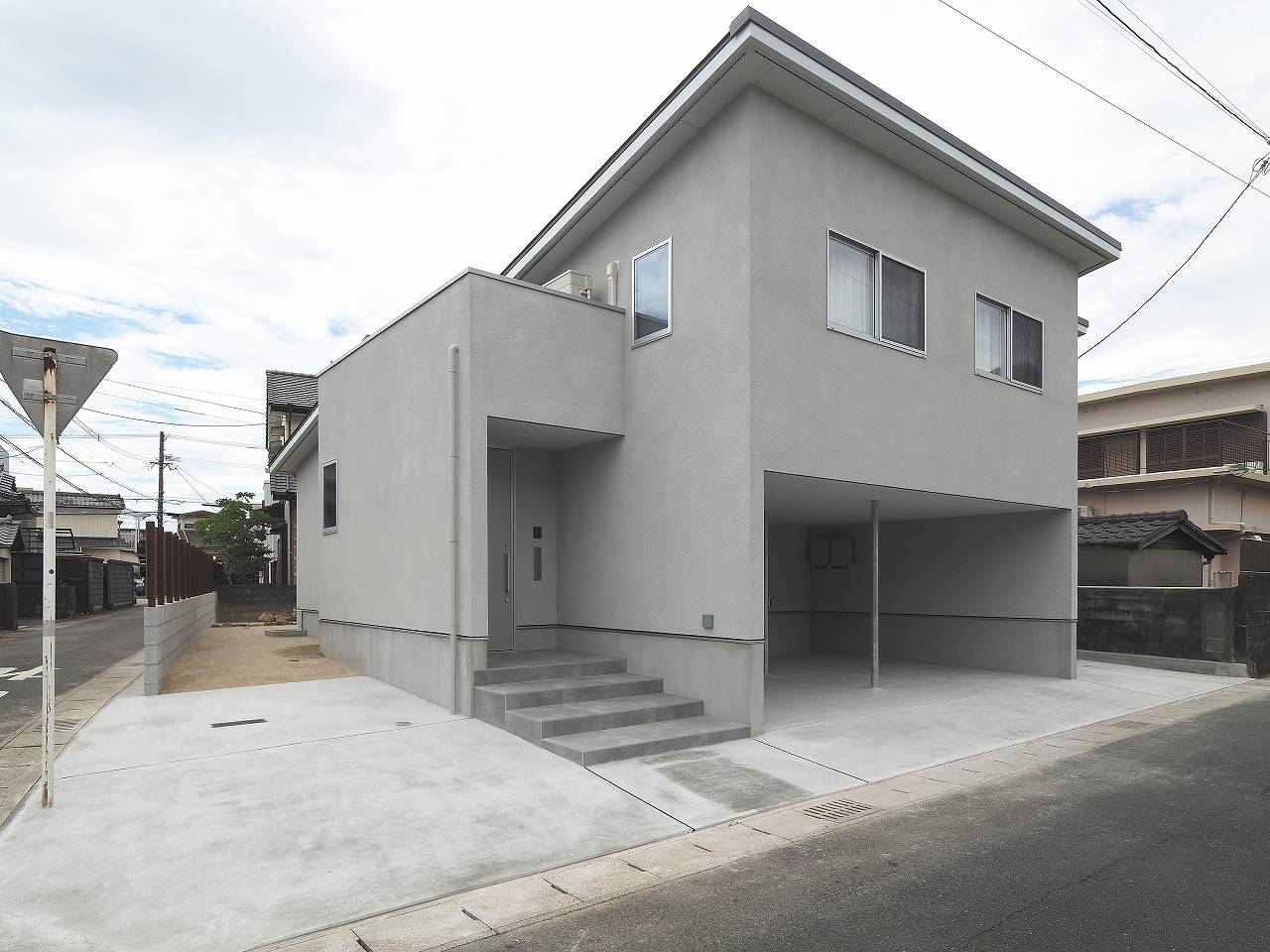 北東の角地。建替前は高いブロック塀が立ち、見通しが悪かった交差点部分を開放し、予備の駐車スペースとしても使えるようにしました。 地盤の高低差を利用して、1階車庫の上に部屋を載せたスキップフロアのプランとしました。