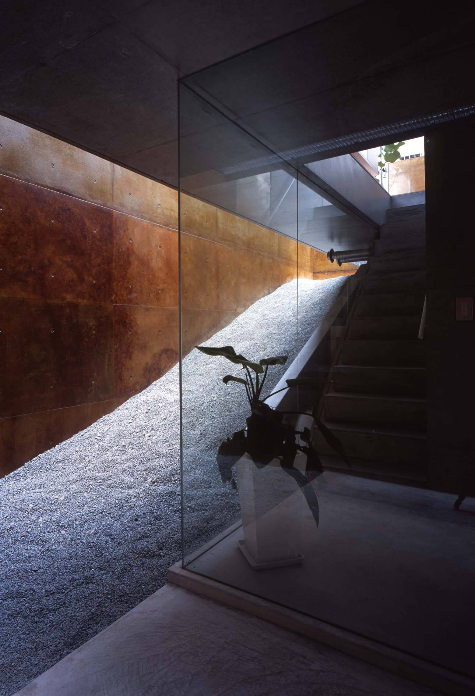 1階と地下はガラスとサッシュのみで内部化され、本来あるべき外壁がここには存在しない。隣地境界壁とガラスがその機能を分担しながら配置されているのみである。