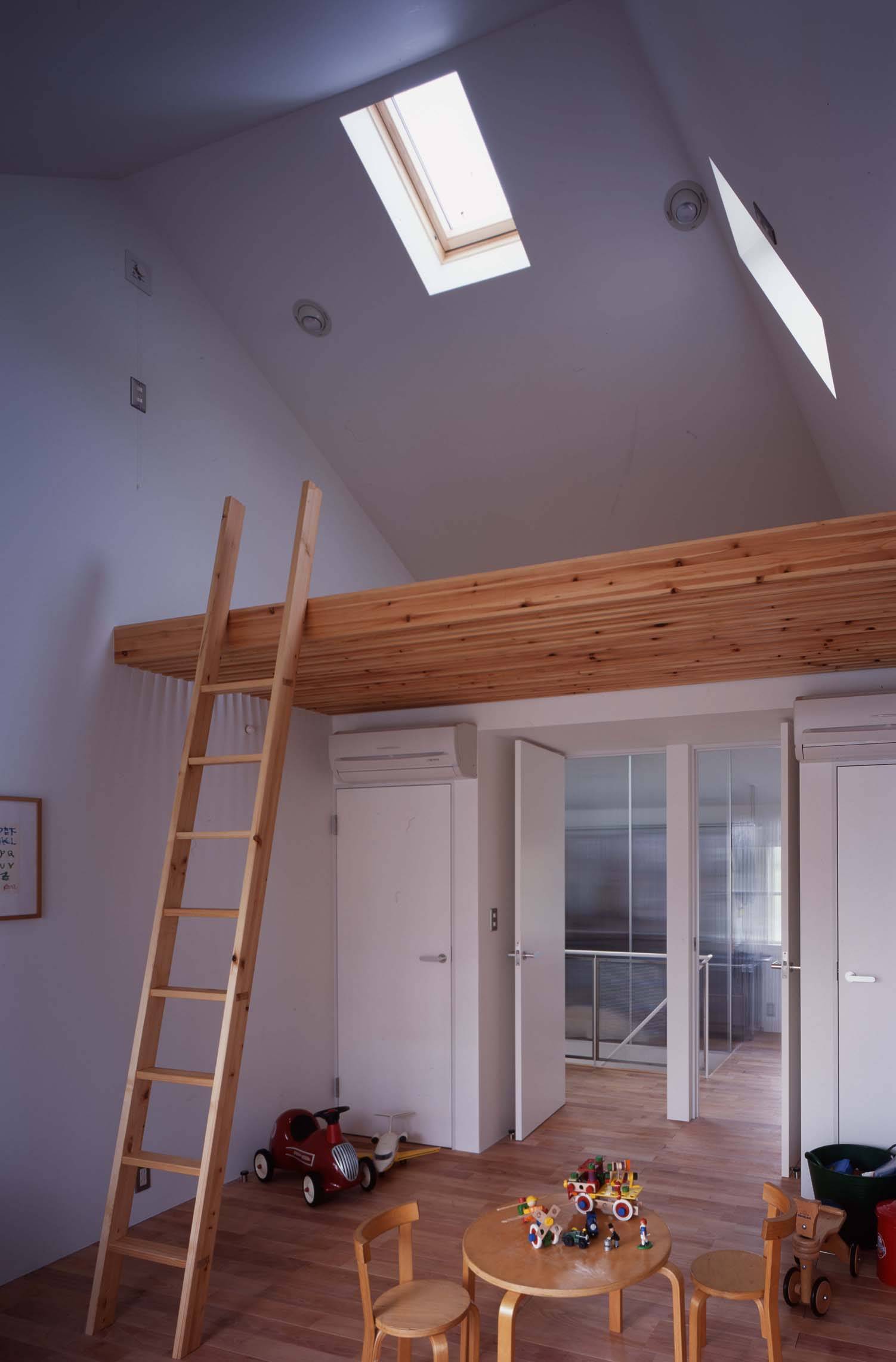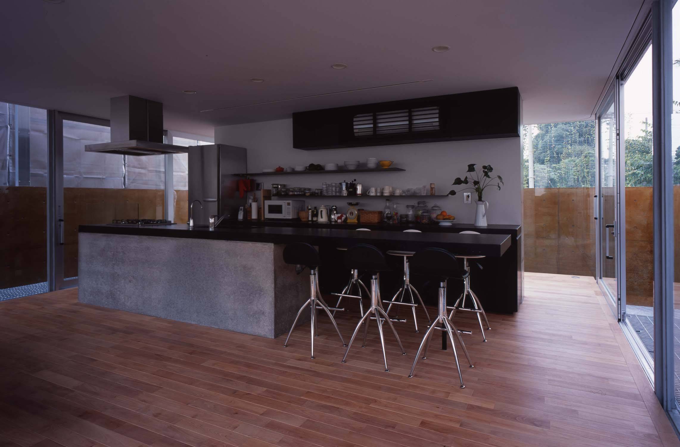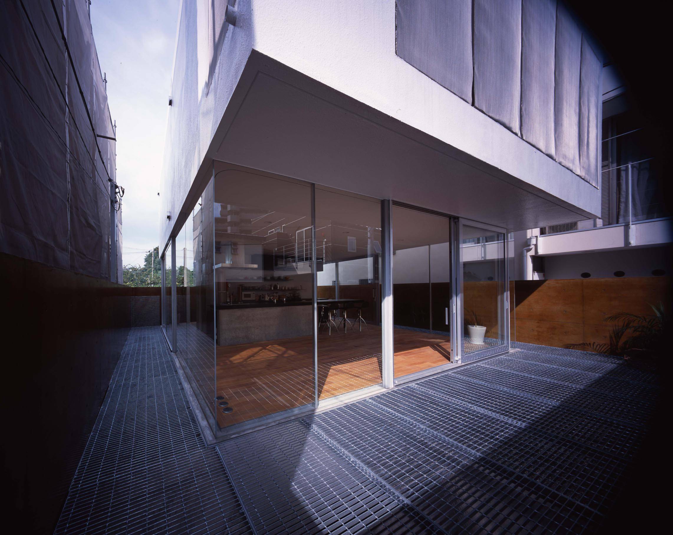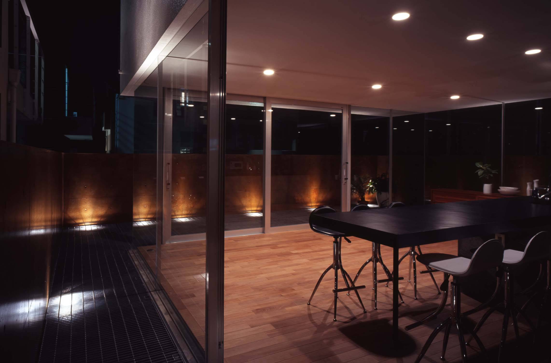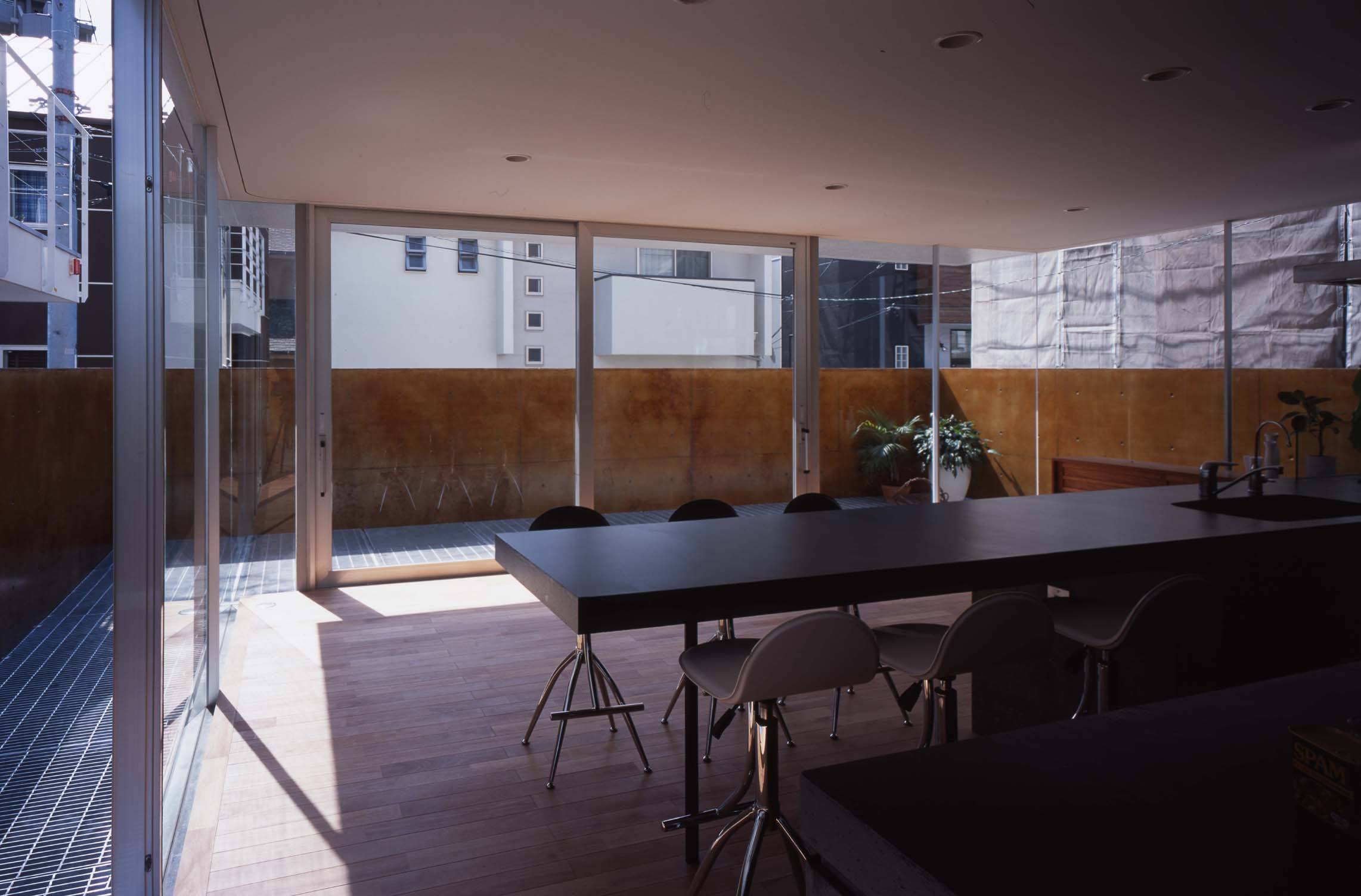 地下の空間はそのまま地表レベルにスロープで連続し、内部・外部とも回遊性・隣接性を保ちながら上方へと連続する。寄棟の2階のヴォリュームは住宅(建物)としての形状を表出すると共に隣地から1m~2.4mセットバックすることで下階への通風と光を与え、周辺への配慮を行っている。1階の地表レベル+500mmにグレーチングのテラスが境界壁際まで張られ、30坪全てをLDKと連続する住空間として有効化すると共に、建築と敷地の平面的な関係に加えて断面的な関係を与えることで敷地と建物の積極的な関係をより強めている。