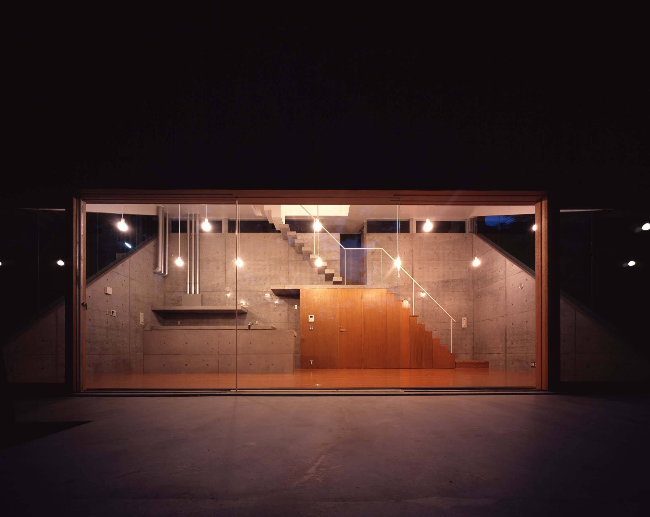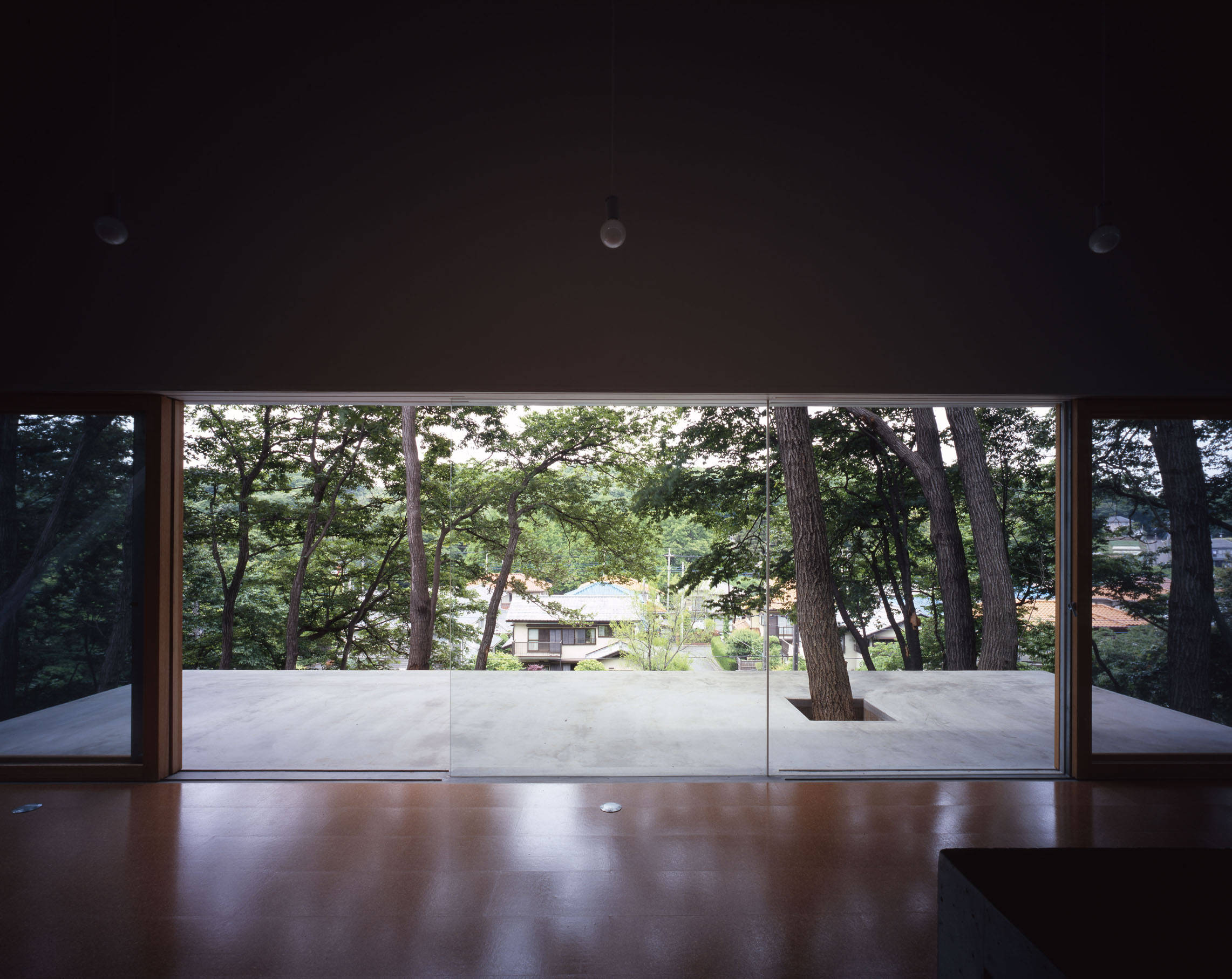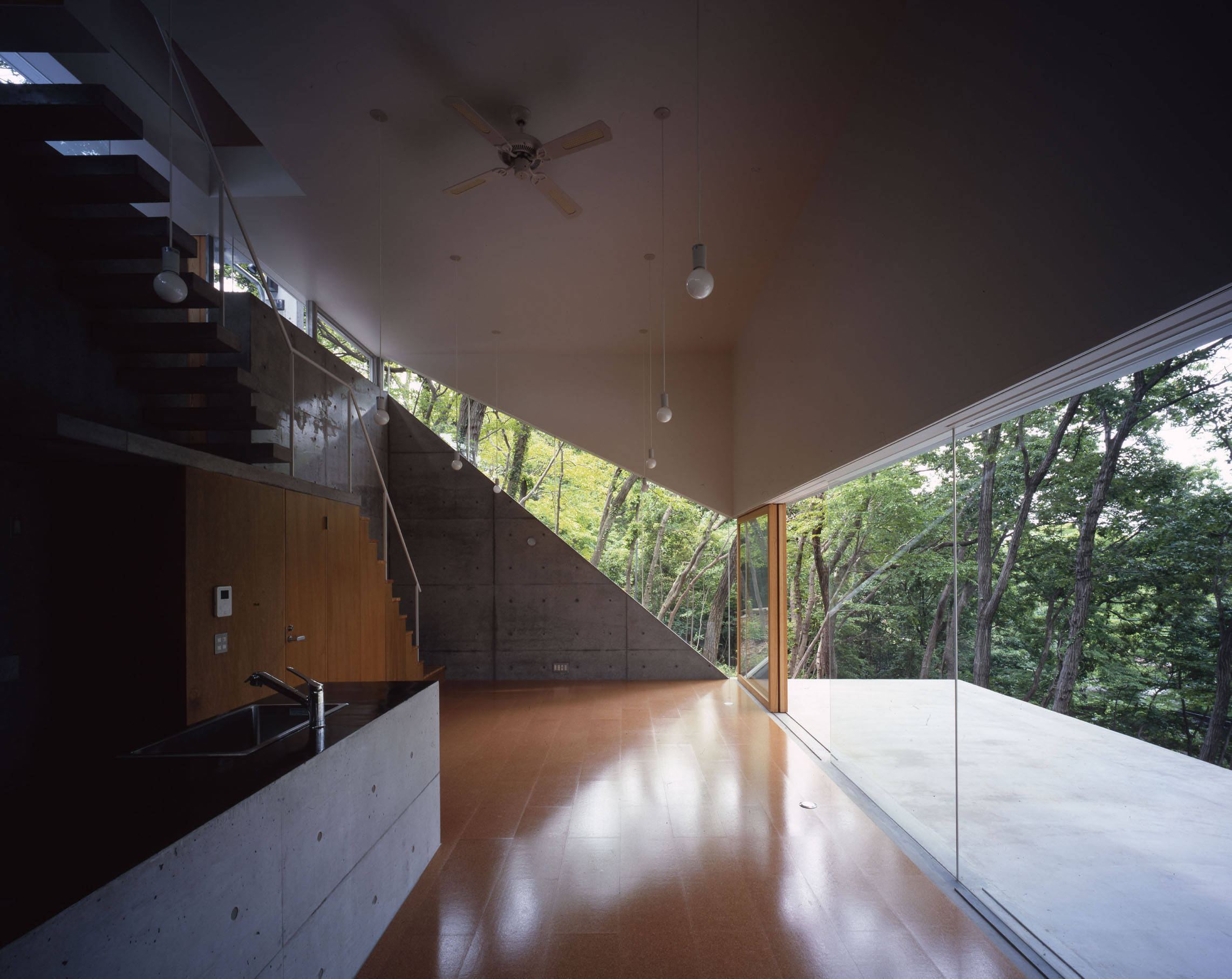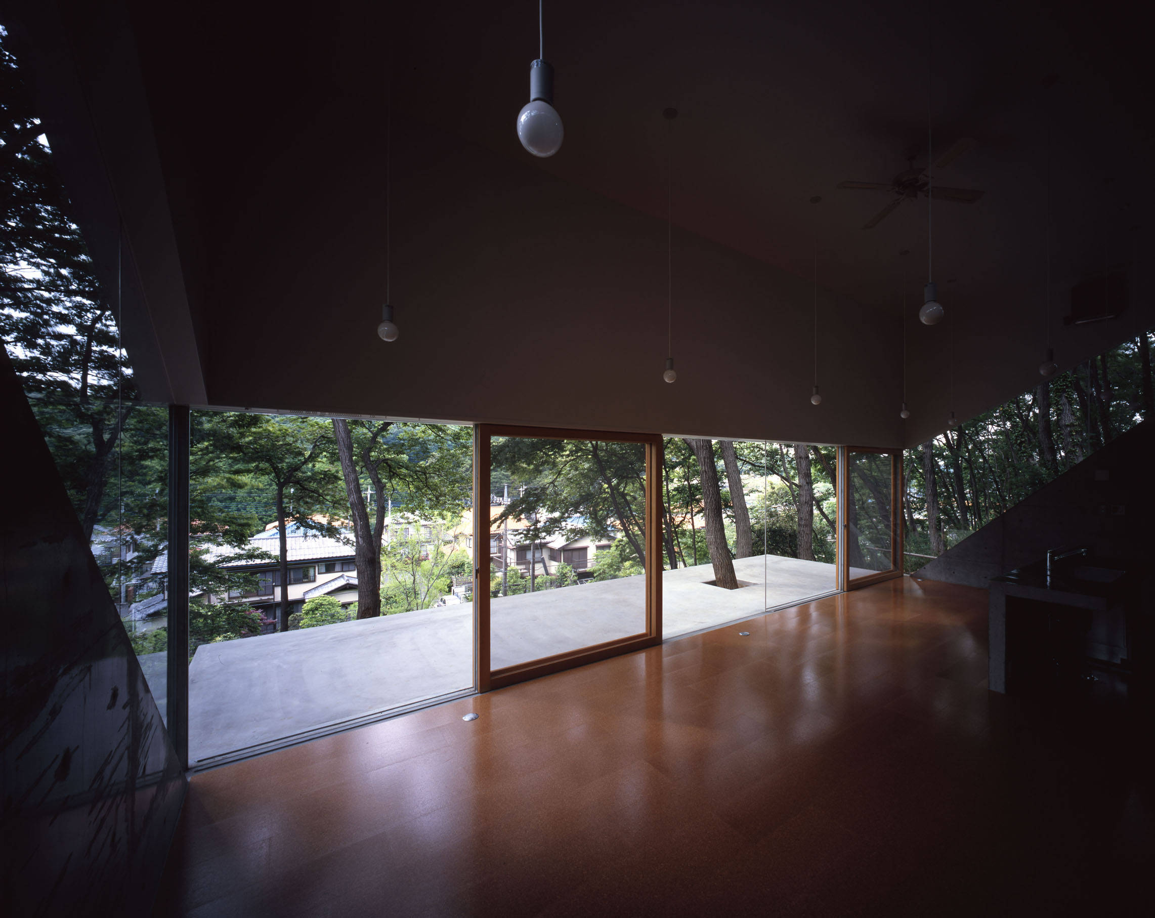 基礎の上部に持ち上げられたヴォリュームはコストと重量の面から木造としており、こちらは家族構成の変化に建具と可動収納で対応したワンルームとなっている。また、下階の基礎部分における周囲との視覚的な連続性とは異なりピクチャーウィンドーとして周辺を切り取っている。