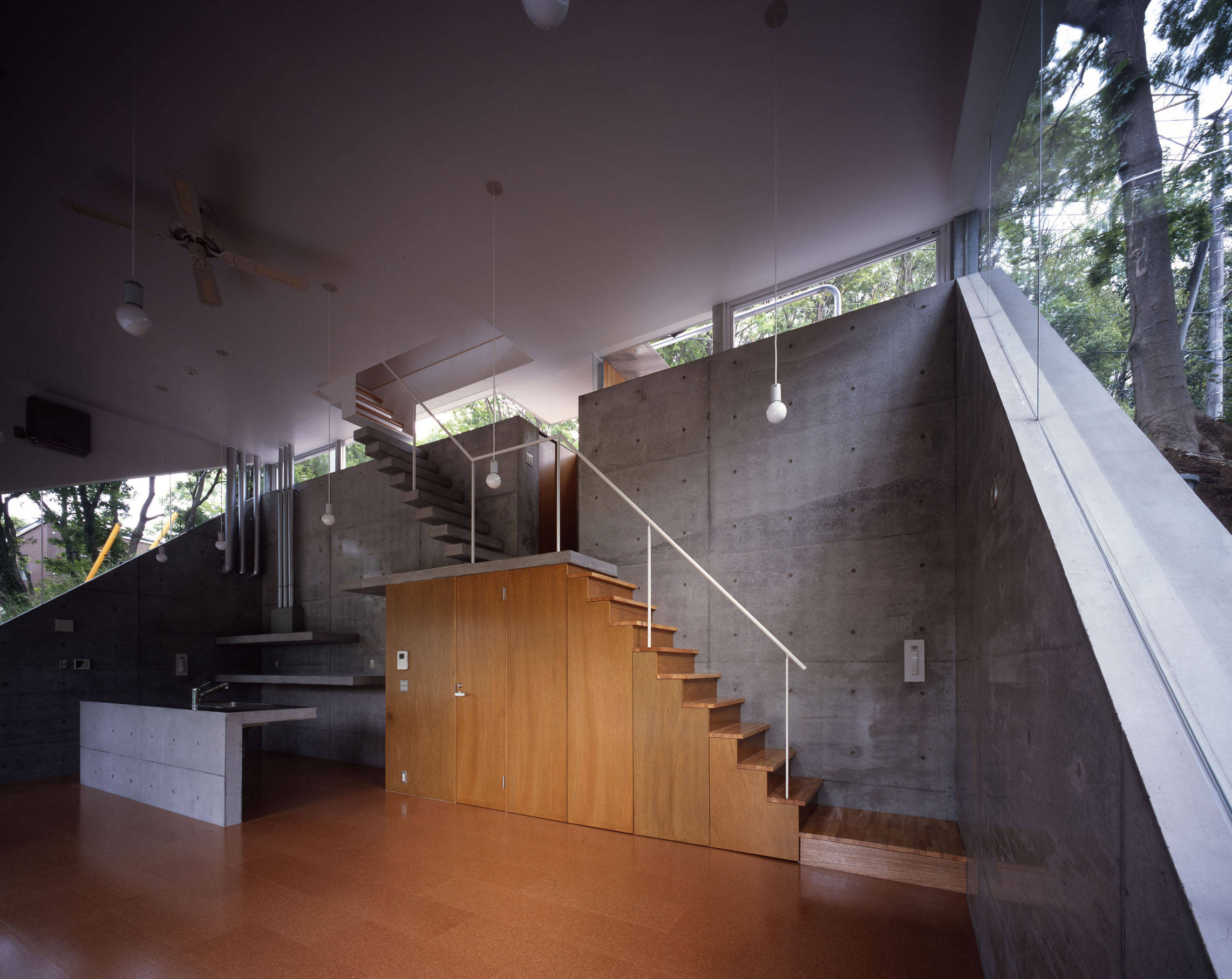 基礎と土留めを居住空間とすることで、ローコストを実現しながら、広い傾斜地や周囲と連続する敷地と一体となった小さな戸建て住宅が実現した。