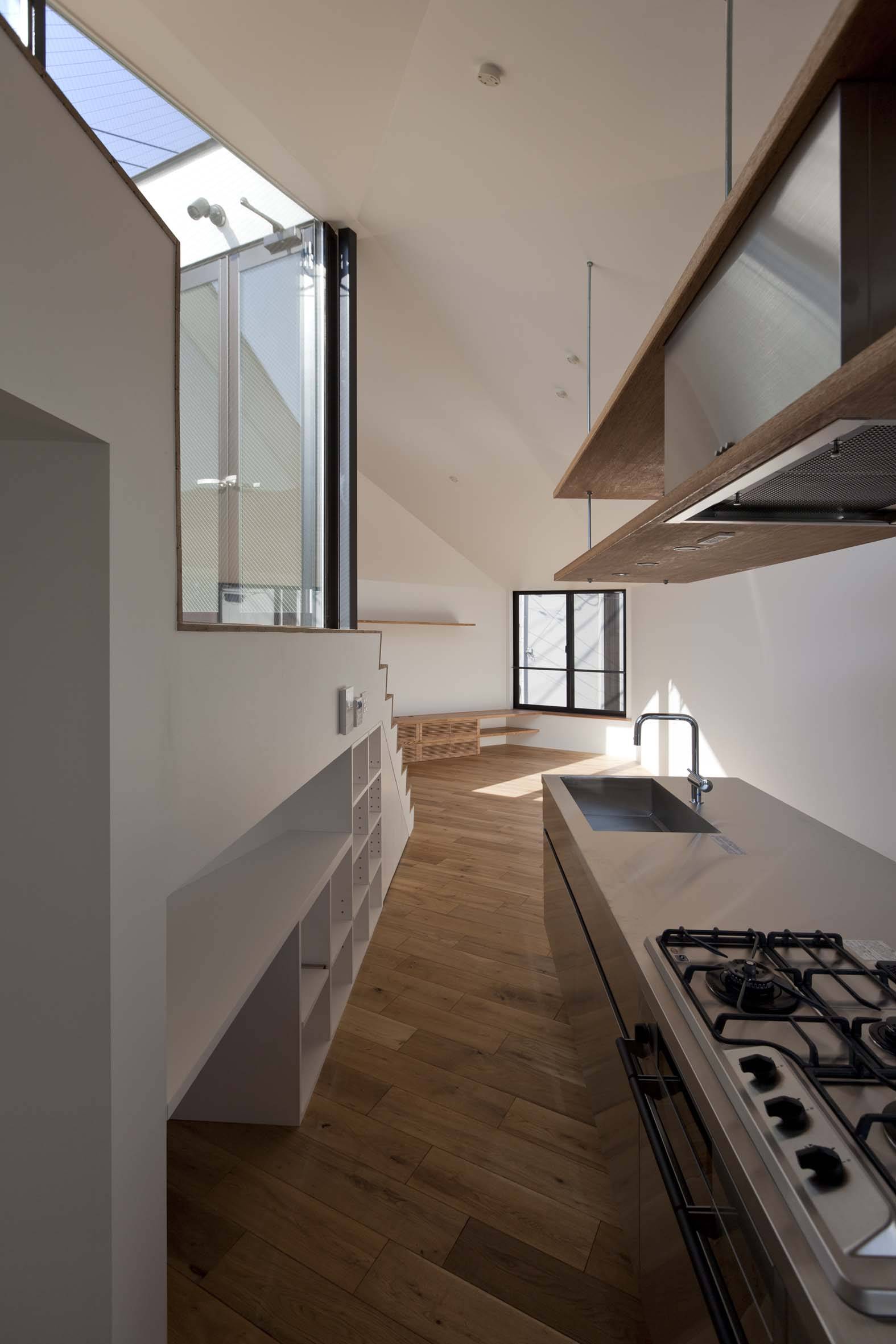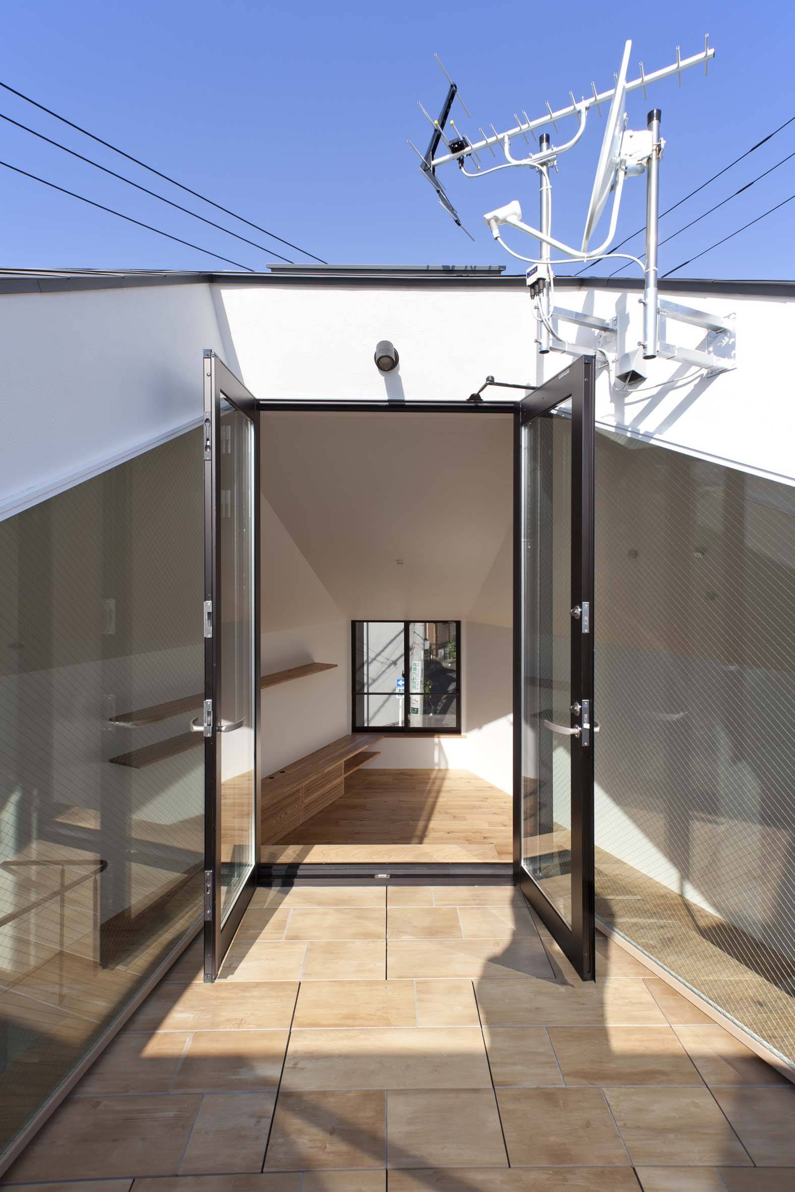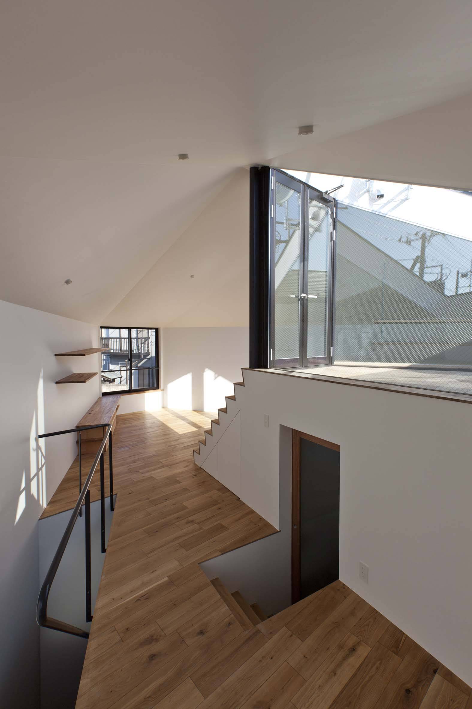 斜線制限等の法規的な制約の中で最大限のヴォリュームを立ち上げ、三角形の頂点をそれぞれが面する周辺環境を考慮してカットすることで三つ又の道路へ視界が抜ける開口部とし、その開口部から1、2階双方へ光と風を供給することで、人通りの多い道路からのプライバシーを確保しつつ、光と風に溢れた開放的な住環境を獲得している。