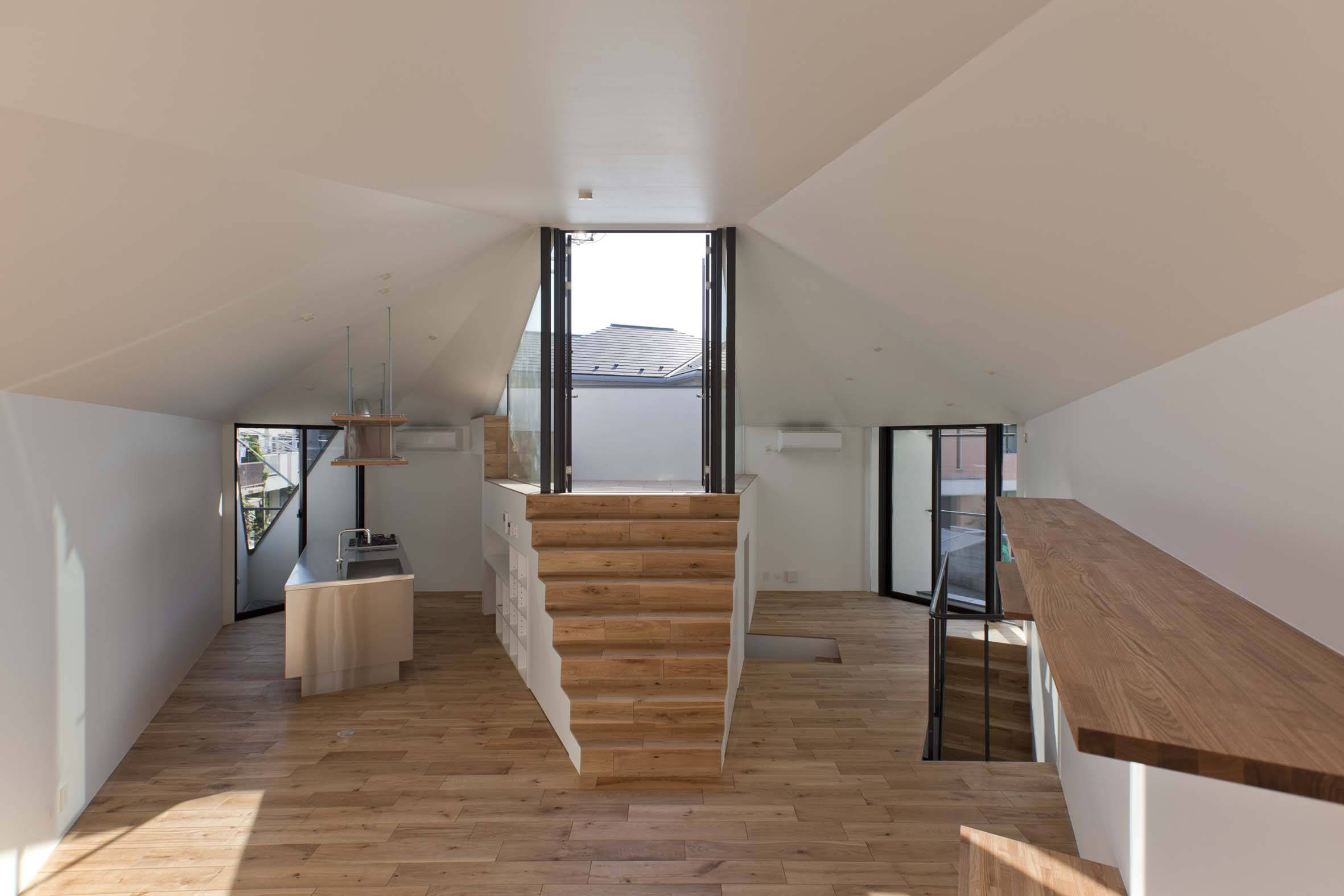 三つ又道路と敷地の関係を住宅内部においてオフセットして立体的に構成することで、敷地特性がそのまま、建物内部において豊かな環境としてランドスケープ的に立体化している。