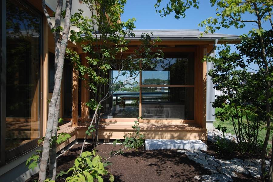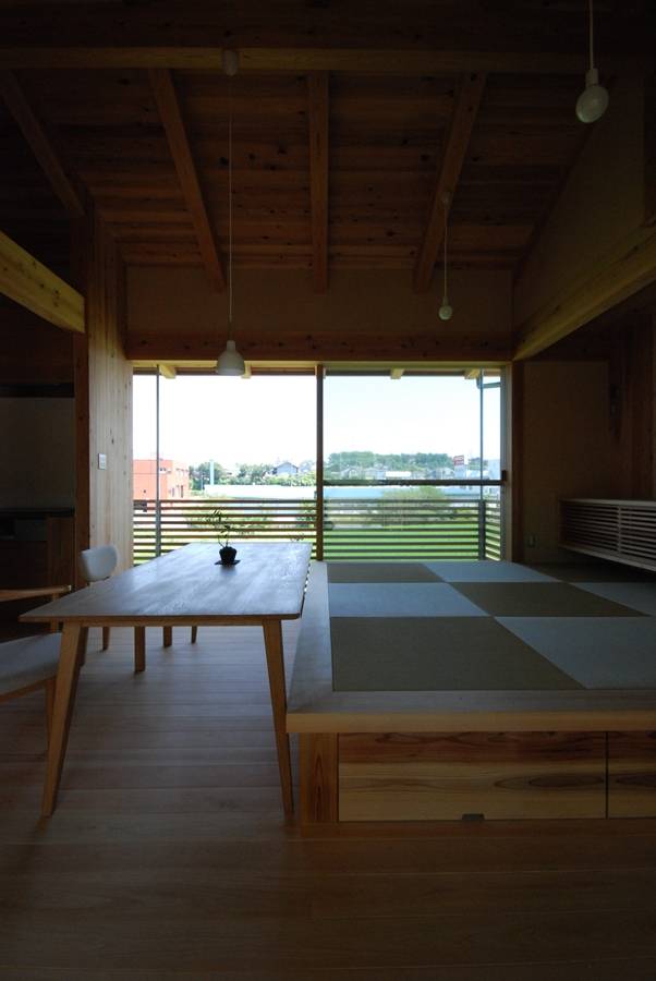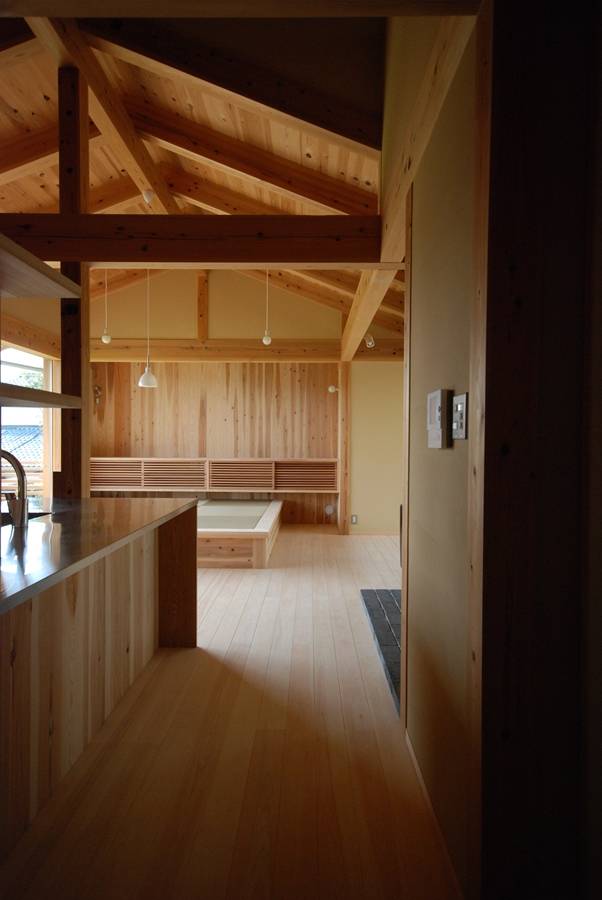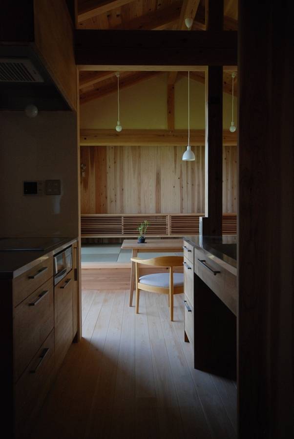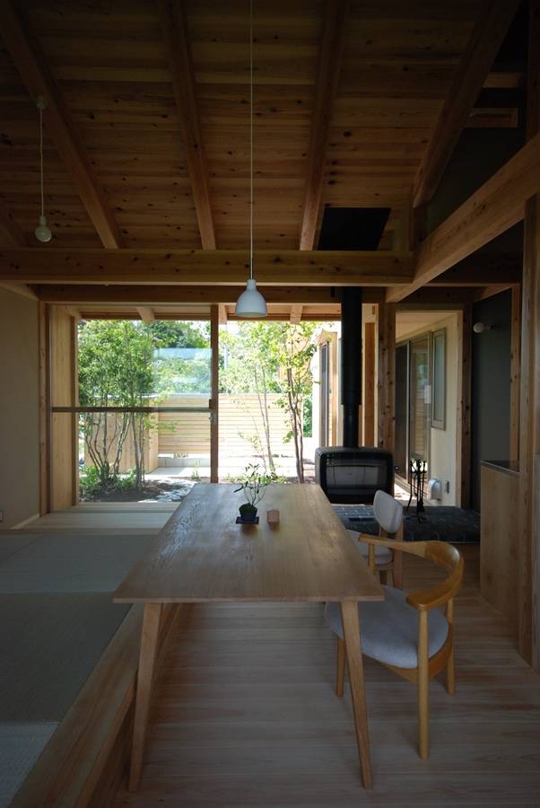 内部は寝室、水廻り以外は一室空間となっています。夏は居間替わりの畳の小上がりでゴロゴロしながら抜けていく風に涼感を感じ、冬は薪ストーブのやさしい暖かさを享受する。気持ちのいい日は縁側や庭に出て七輪で魚を焼き・・・そんな自然な暮らしを受け止めてくれる木の住まいです。