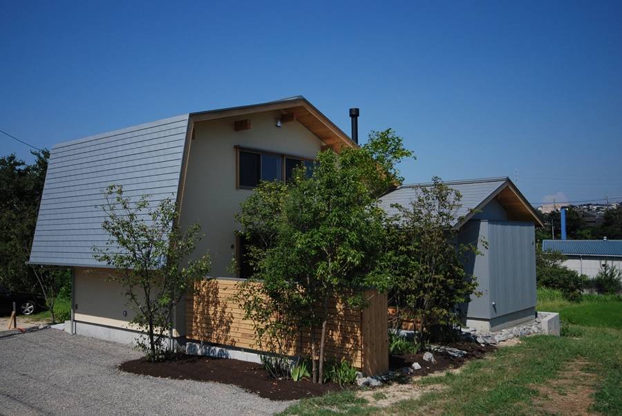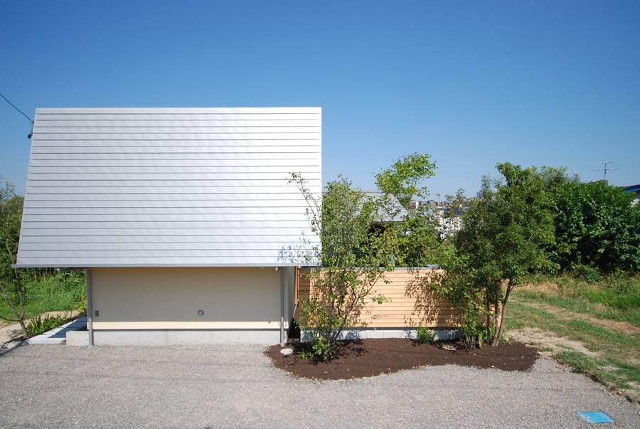 敷地東側には生産緑地である田園が広がり、夏場に風をうんでくれます。田園からふいてきた風は居間・食堂に導かれ、吹抜けを介して2階を抜けていきます。また西側には高い建物がないため、西日が容赦なく照りつけます。そこで屋根を折下げ、西日を遮蔽しています。この家の特徴的な屋根形状・ファサードは敷地条件によって導き出された形となっています。