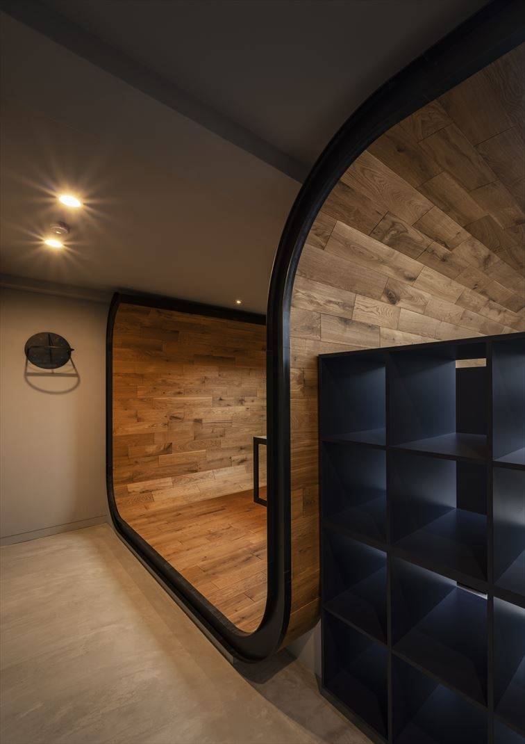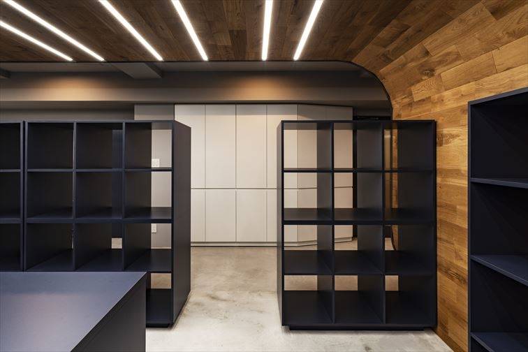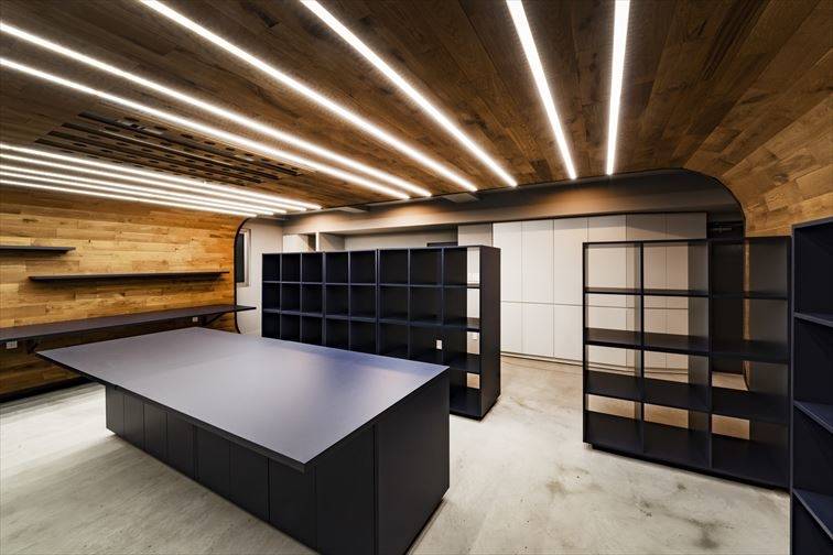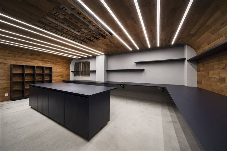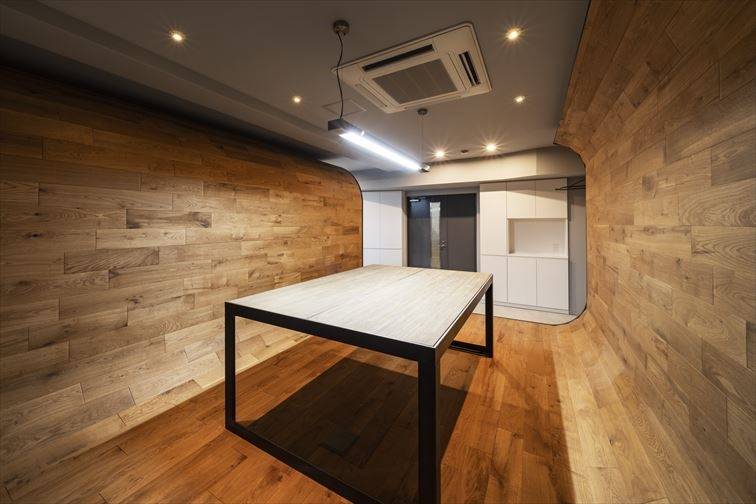 某デザイン事務所スペースの改修工事です。煩雑になりがちな事務所空間に対して、床~壁~天井と繋がる一続きの無垢材のラインによって引き締めるとともに、レベル差を与えながら接客エリアと執務エリアを分節しています。