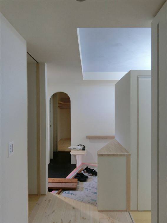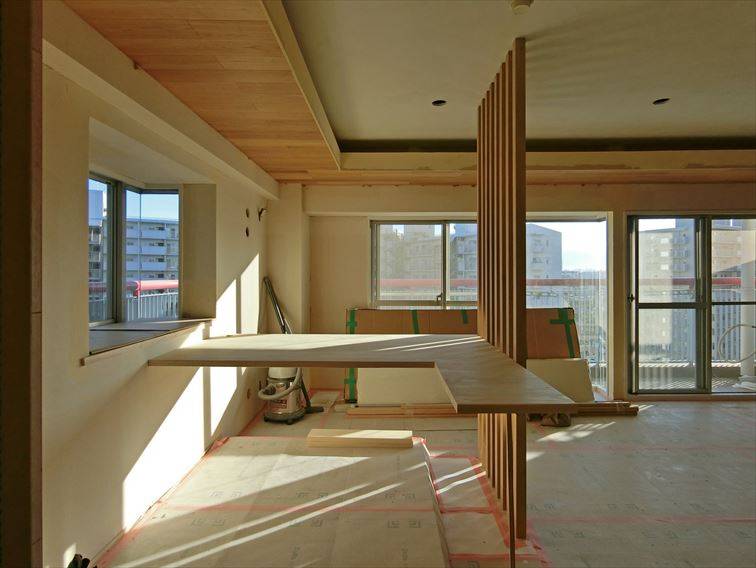 南側の居住空間は住戸の最大幅が得られるように既存間仕切りを取り払うことで眺望を生かし、窓が望めない北側は身長高程度に抑えたパントリーを中心に回遊する動線を設け、南側のエリアと北側のエリアに2つの特徴的な折り上げ天井を設けました。