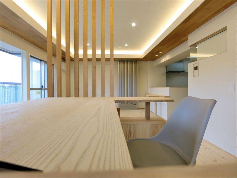良好な景観が望める東側の出窓の位置に、一番長い時間を過ごす執筆スペースを設け、座位の視線高でも景観が得られるように床高を調整するとともに、段差により日常生活と仕事の気持の切り替えが行えるようにしました。