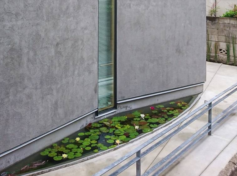 雨水も積極的に有効活用しており、内樋形状を生かして降雨時は屋根全体の受ける雨水のおよそ半分の量を建物正面のガラス開口部に伝わせて睡蓮池まで落とす仕組みとし、雨天時には室内よりその様相を楽しめるようにした。