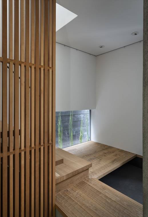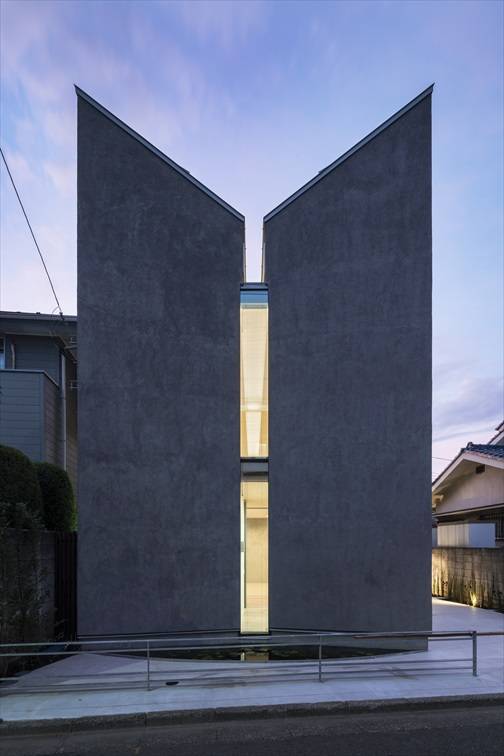 一般的に街中での住宅の設計は周辺の建物や環境に配慮しつつ、特に秋~春にかけての季節では直射日光を室内に導く事を考えるが、ここでは絵を描く行為に対して、季節や時間や天候にとらわれずに均質な光で満たされた安定した採光が主題となり、直射日光を敢えて抑える必要があった。