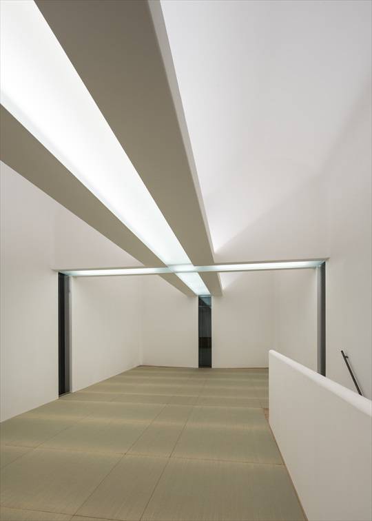 具体的には一般的な切妻屋根を逆勾配としたV字(バタフライ)型の屋根形状に、平面的には十字型のスリットを切った内樋形状の部分より光をとりこむと共に、アトリエ内部の壁と天井の境目のない漆喰仕上げの曲面によって、開口部からの光が均一な拡散光となって、アトリエ空間全体が均一な光で包まれるようにした。これらによって日中の自然採光時も日没後の照明点灯時も、アトリエ内部のどのエリアで創作をしていても影が生じない空間が実現した。