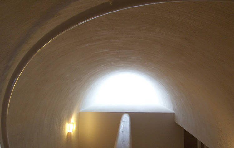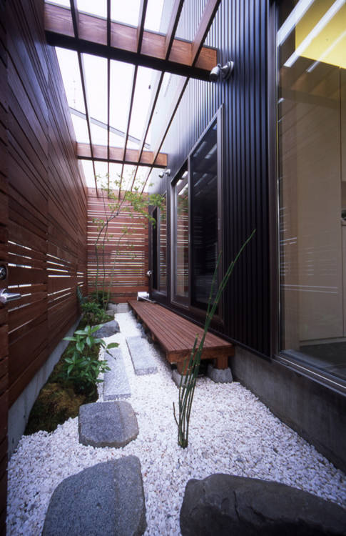 北側に設けた坪庭はプライバシーを確保する工夫を施しているため、狭いながらも光と風を建築に呼び込むのに優れた効果を持っています。また、北側の坪庭から南側の畑まで、トンネル状に風がながれるように開放的な間取りとすることで、夏場は1階の空調は不要となり爽やかな外気と共に暮らすことが出来ます。 冬場は1階の蓄熱暖房からの暖気が上階まで煙突状に行き渡る断面設計です。