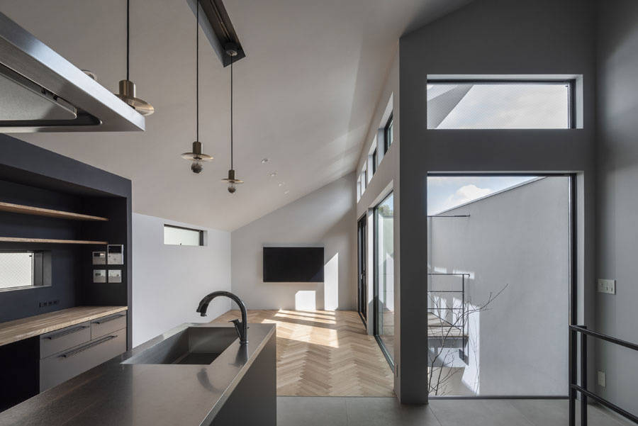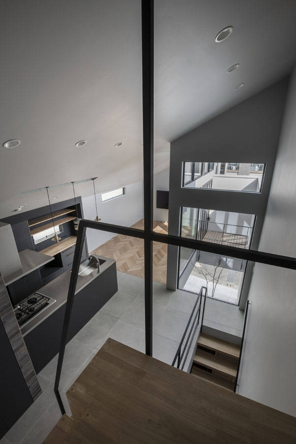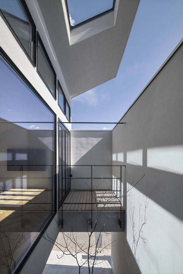 この住宅では、周囲の環境から、外部を閉じ緩衝地帯となる中庭空間に対して内部を開く構成とすることでプライバシーを確保しようと考えた。