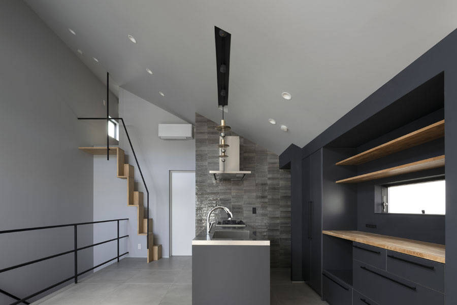 また、低層住宅地域として厳しい高度斜線の影響を受け勾配屋根にする必要があったが、その勾配を外部まで延長し、