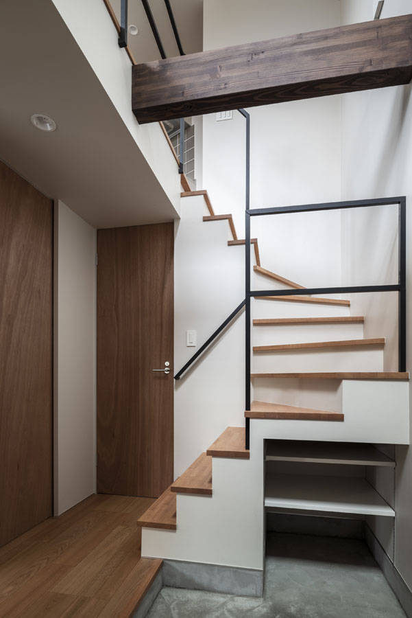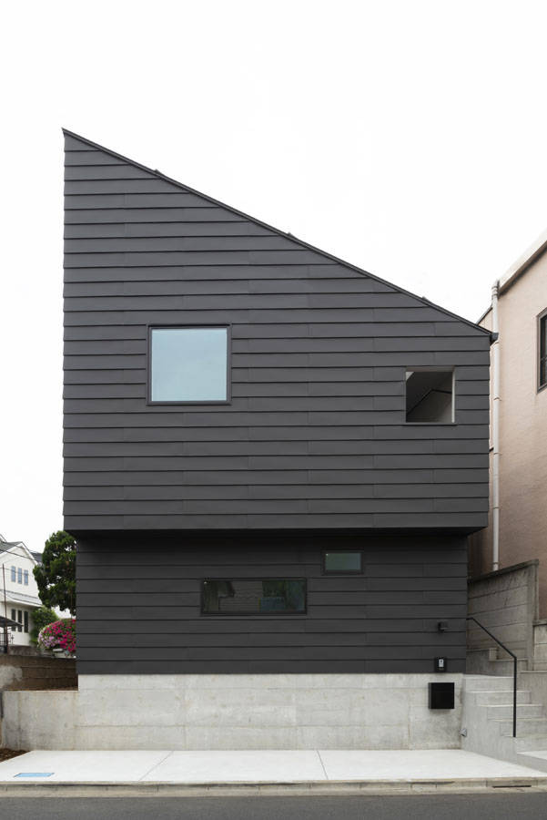 「道路から2メートル高い地盤」、「変形した土地形状」という、一見デメリットのような土地の特徴をメリットに転換した住宅が完成した。