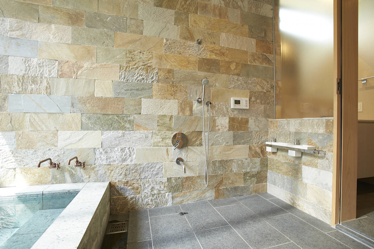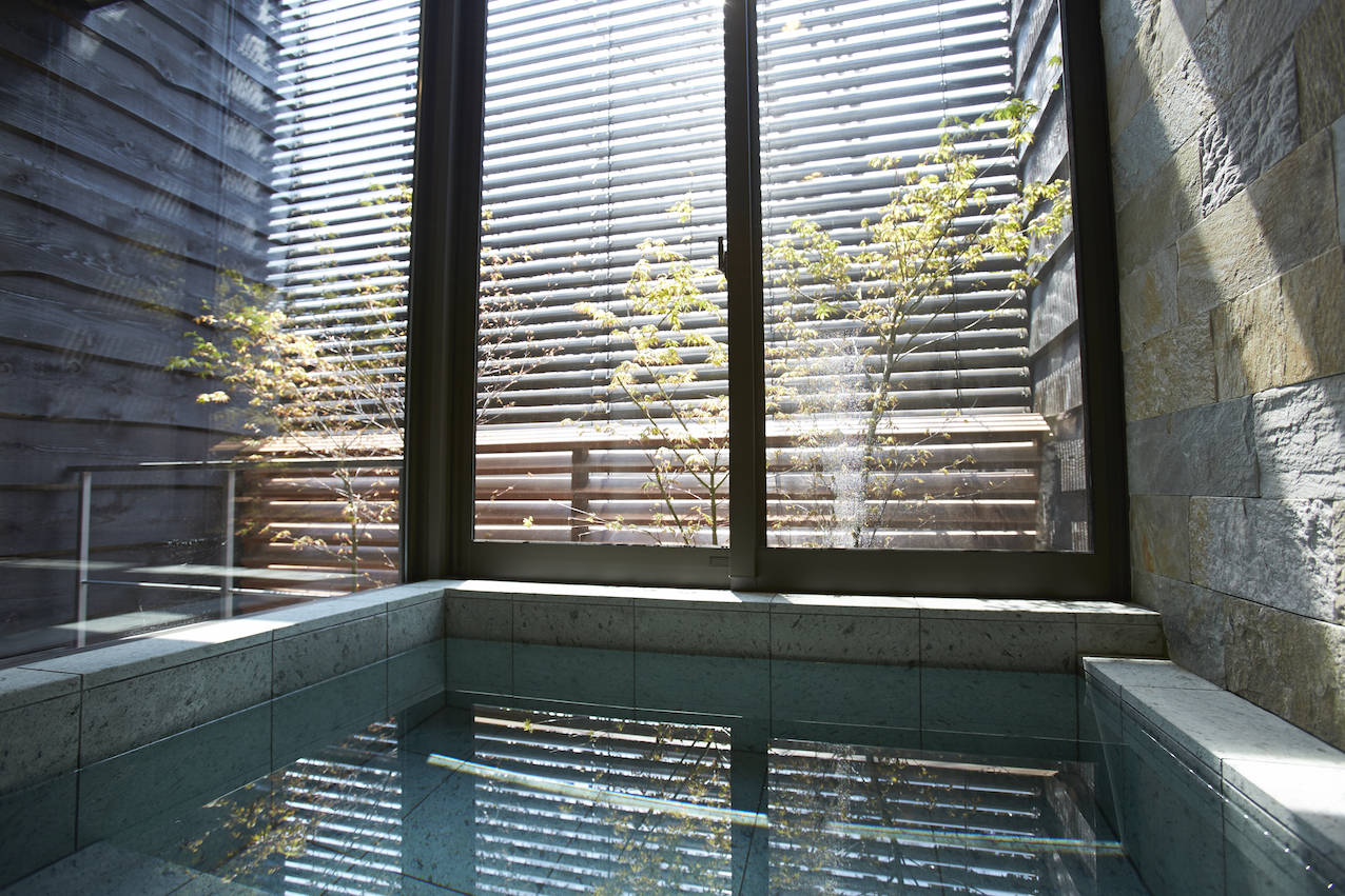南面の庭に植栽を施し、西面は坪庭付きオープンタイプの温泉浴室のボリュームを作る。東は車路兼アプローチを配置し北側にゆったりと駐車場をとることにより開放的な居間のプライバシーを確保してあります。