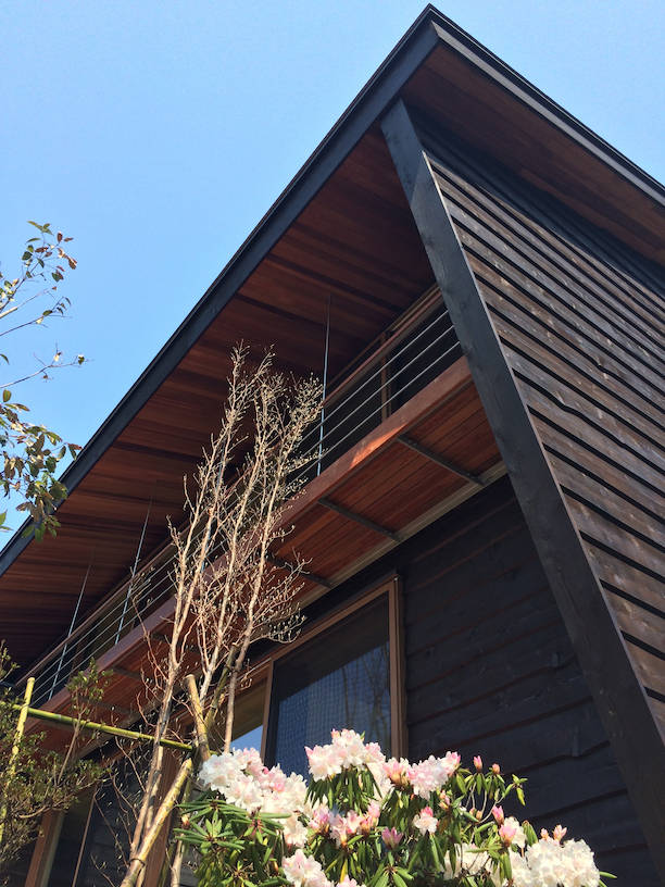 外装には耳付きのレッドシダー材を濃褐色に塗装し自然の中での建築の存在を控えめにしています。