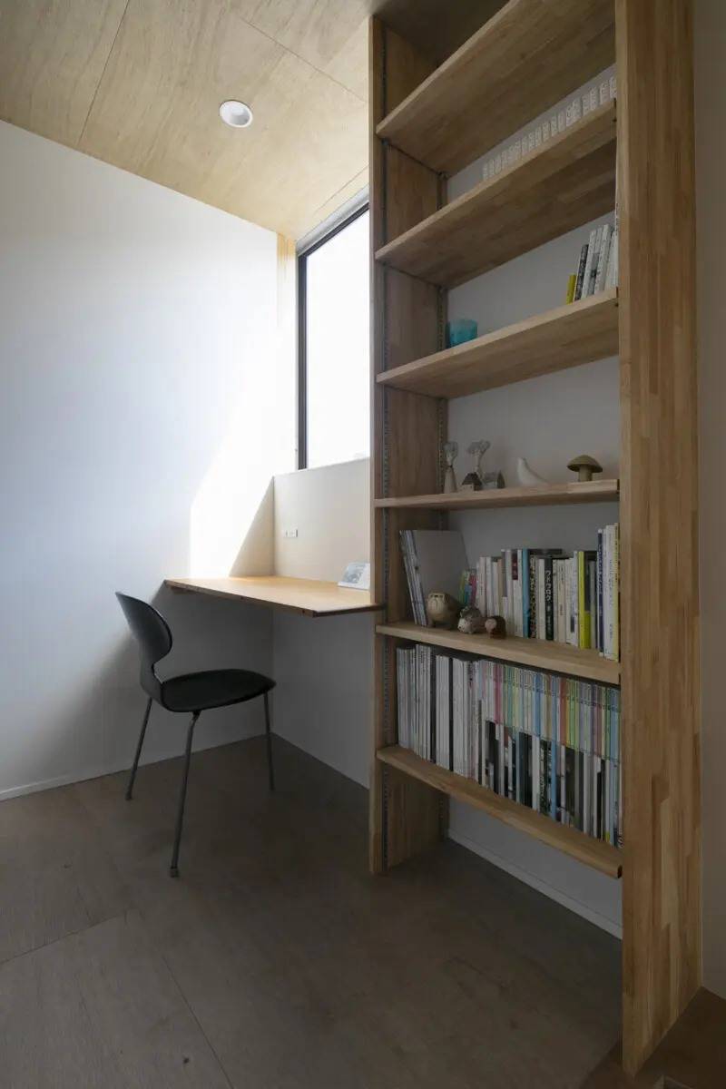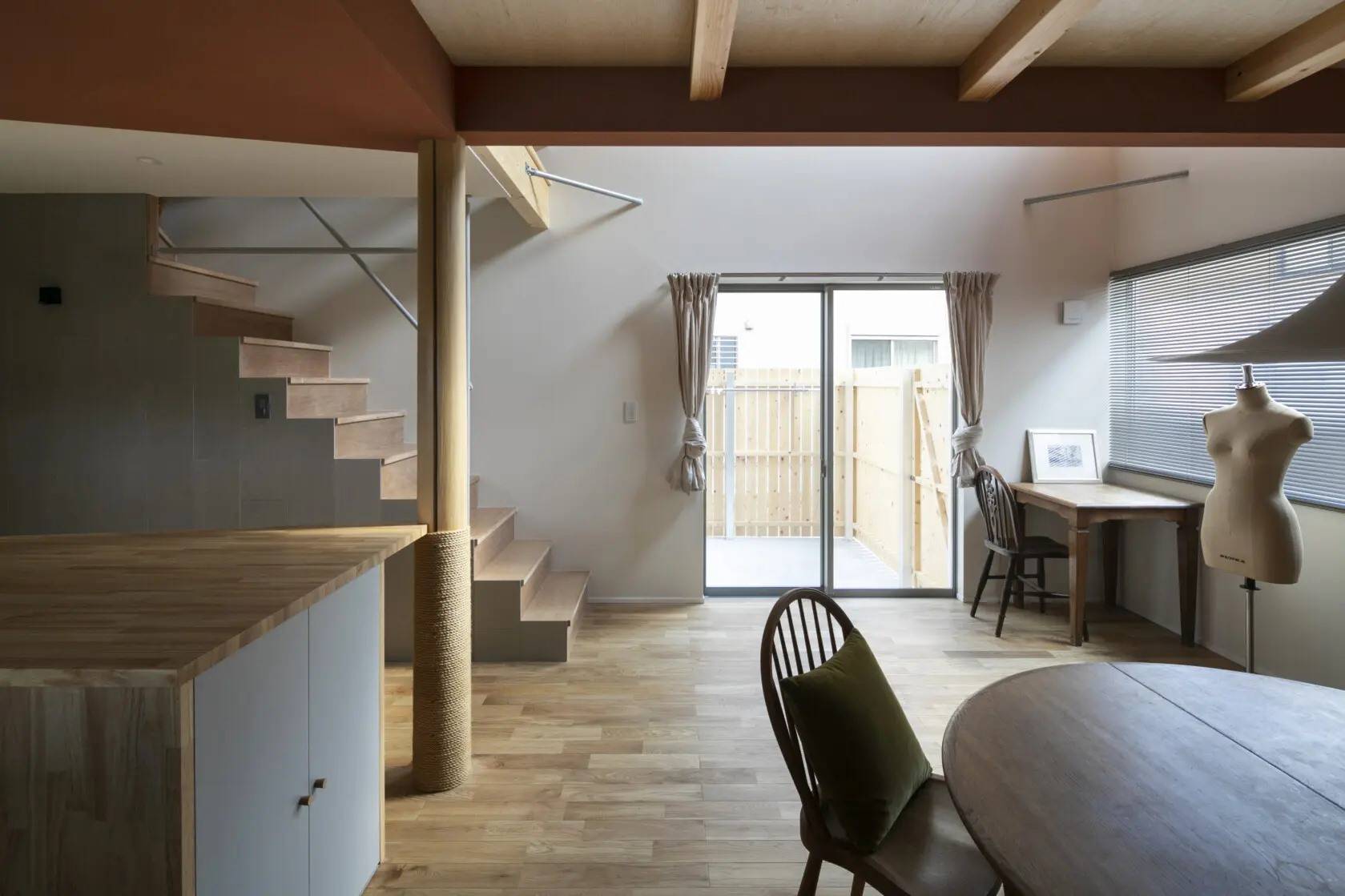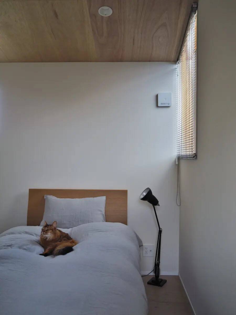 また、猫が快適に過ごせるように、猫の爪研ぎスペースや猫用トイレ置場を配置し、キャットウォークや猫が落ち着く狭いスペースも計画しました。テラスは猫が外に出でも逃げ出さないように、背の高い板塀で囲んでいます。