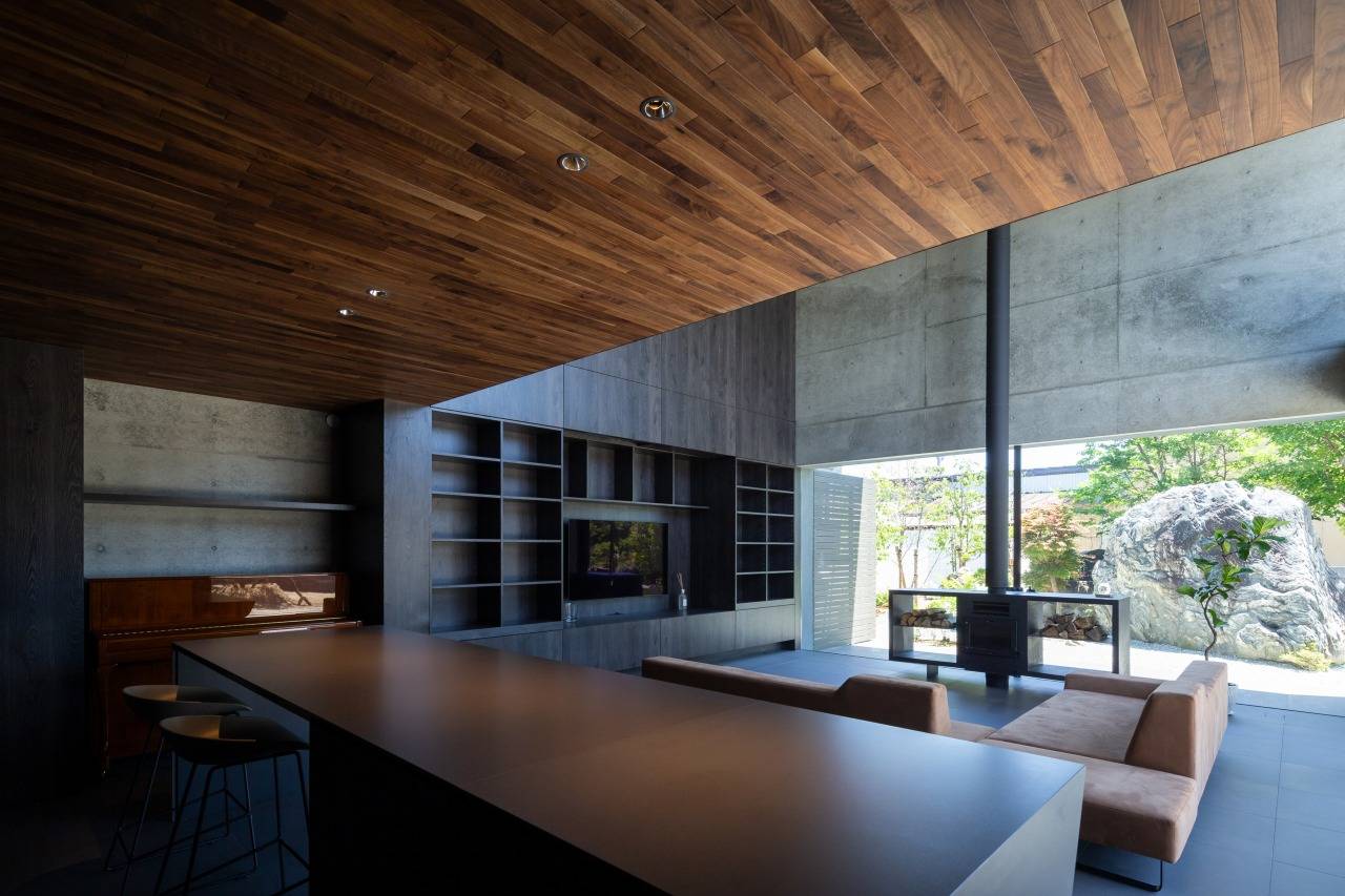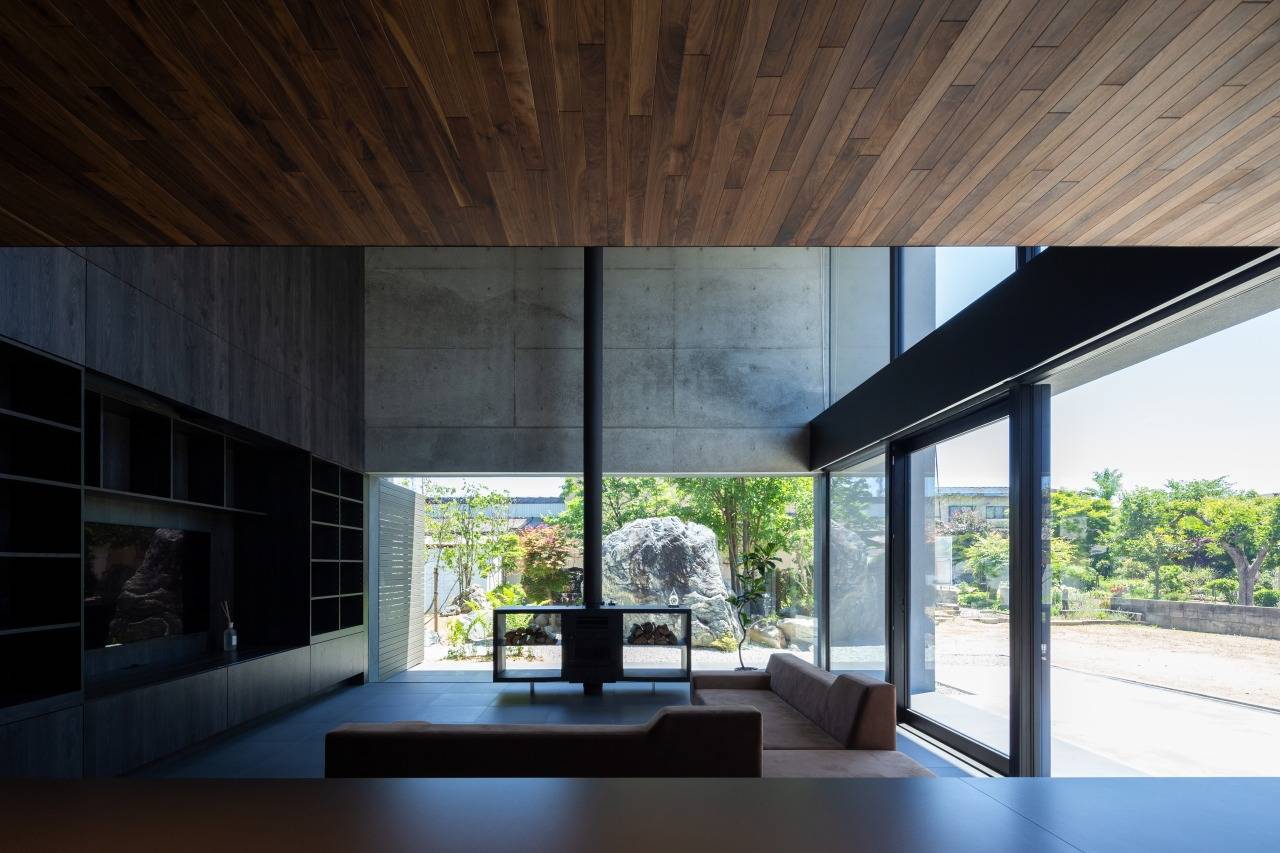 シンボルとなる大きな岩と木々のコントラストが美しい庭が印象的で、庭の四季を楽しめる住まいをと考えて大きな窓を設け、外と内が自然な距離感でつながるように吹き抜け空間を創りました。