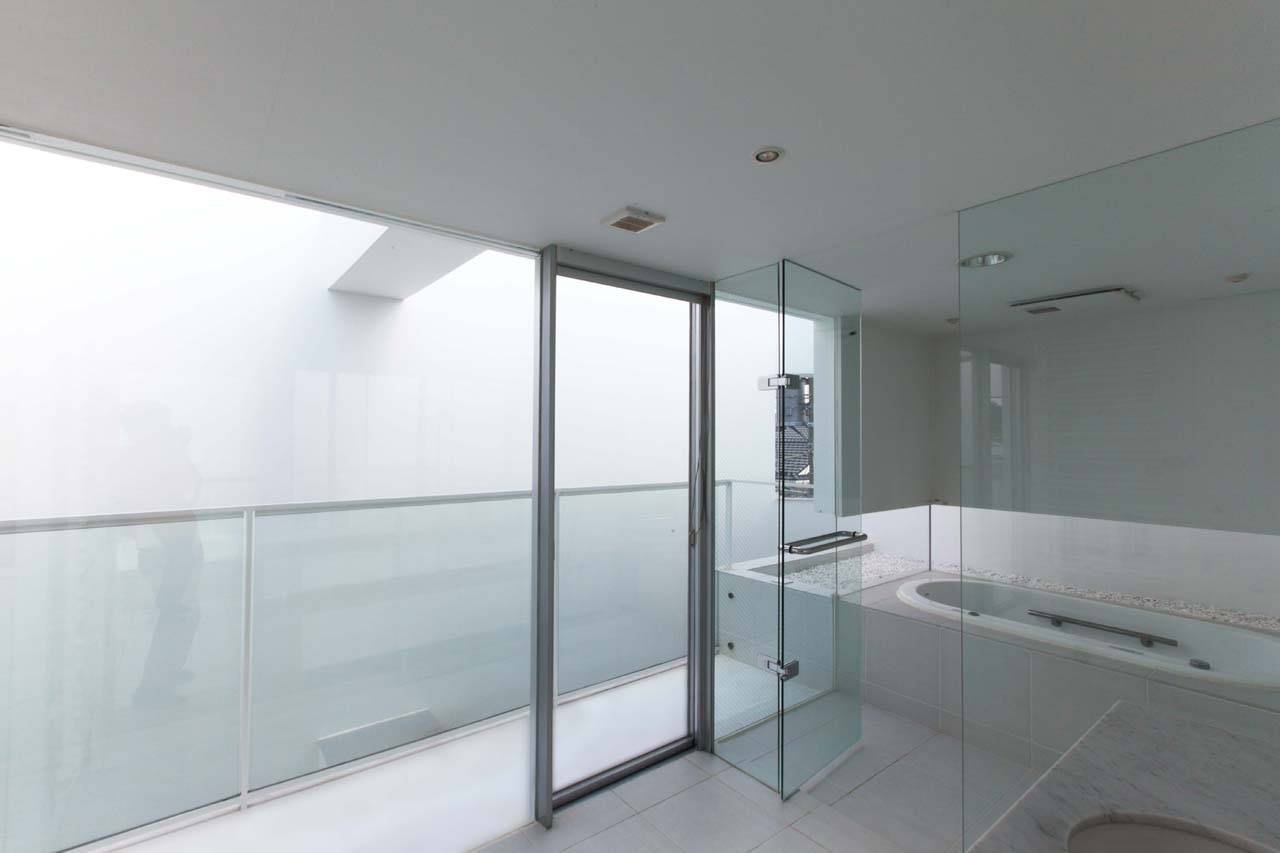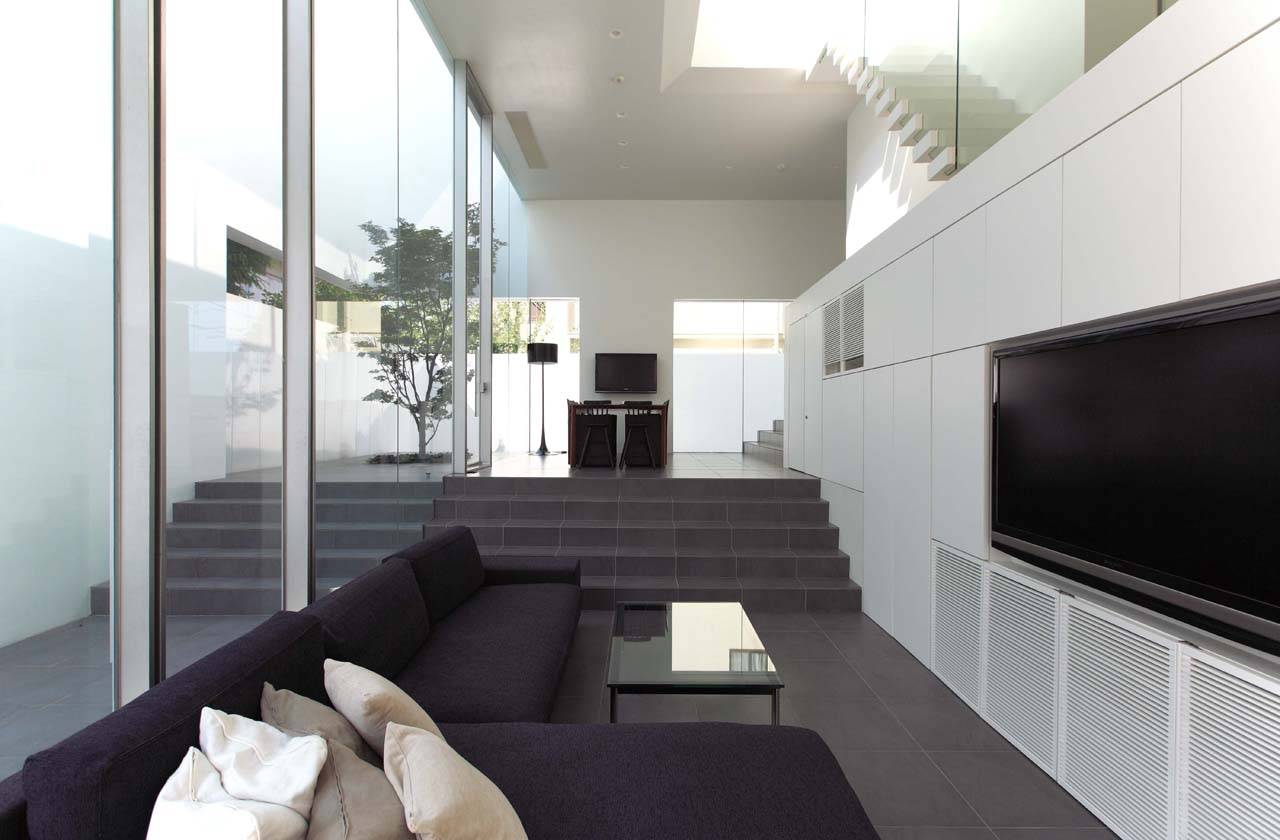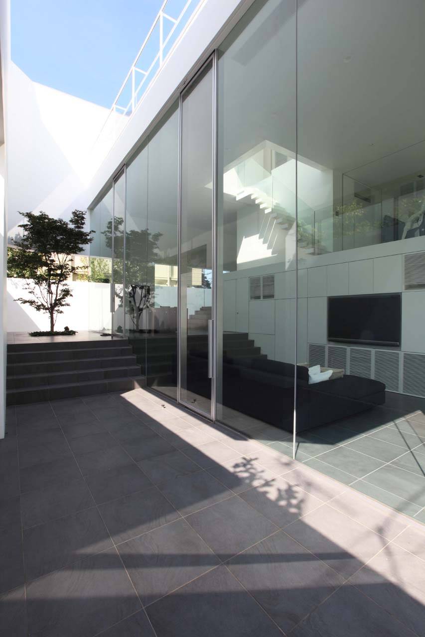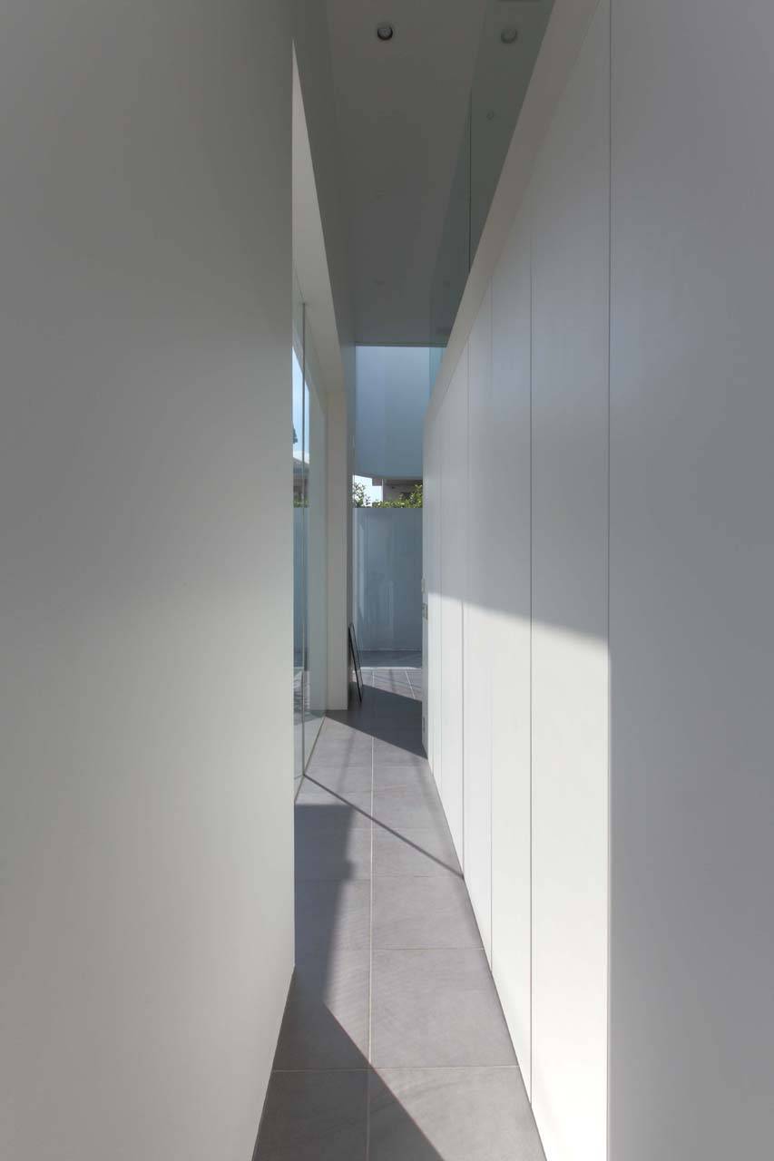 建物は外周壁によって敷地全体を取り囲み、それを構造として中央のコア部分まで床がつながることで建物全体を成立させている。外周壁は構造としての必要量と周囲からのプライバシーを考慮しながら配置されることで、テラスや前庭等の外部空間をバッファーとして建物へ取り込んでいる。階数は3階建てで、1階から2階にエントランス、リビング、キッチン、ワークスペース等のオープンな機能を、ガレージ、クローゼット等のコア部分を中心に配置されている。3階には寝室、水廻りなどのプライベートな機能を配置している。