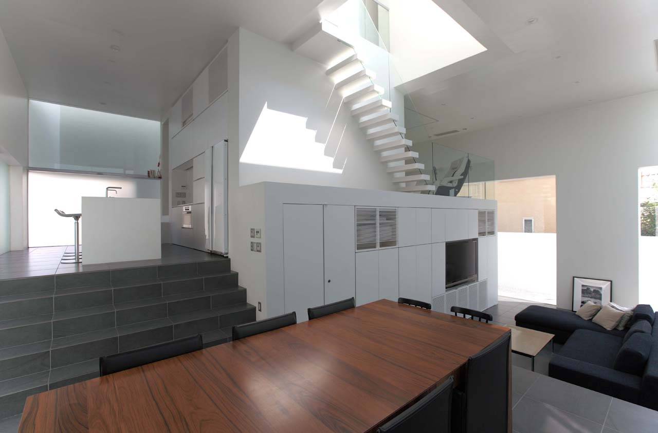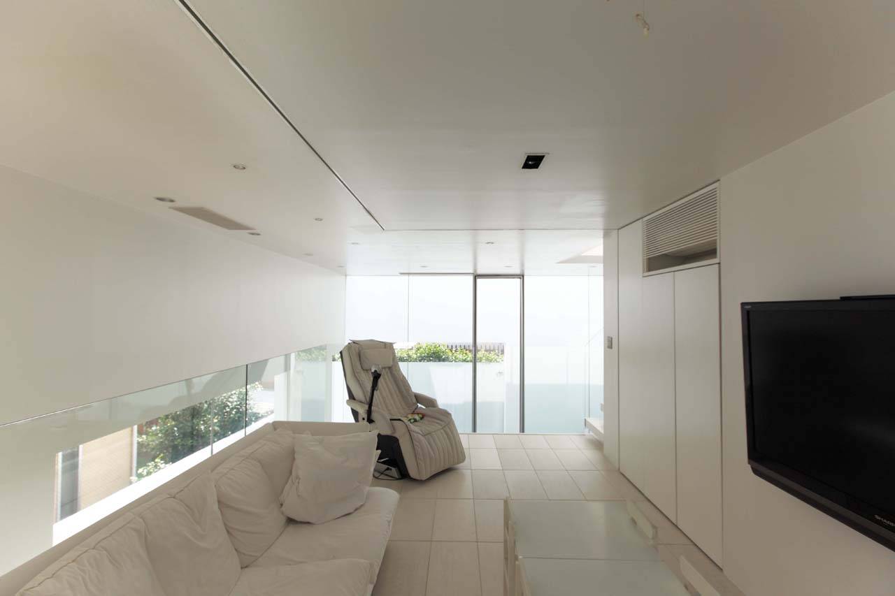諸室は、エントランス、リビングの2層分の吹き抜け空間から始まり、前庭やテラスと一体となって、ダイニング、キッチンへと段々に上がり、2階のワークスペースまで螺旋状に連続している。ワークスペースからは、リビング、ダイニング、前庭、テラスなど敷地全体を見下ろすことができる。さらにそこから、片持ちの階段を通って、3階に繋がるボイドへと空間が連続していく。3階には寝室、子供部屋、洗面・浴室が配置され、各部屋は外周壁によって囲われたプライベートなテラスに面している。