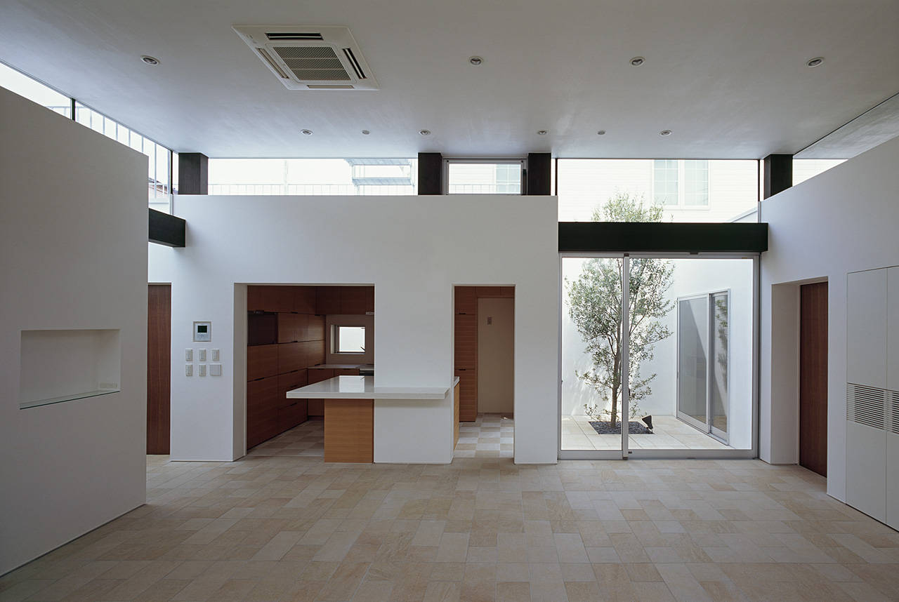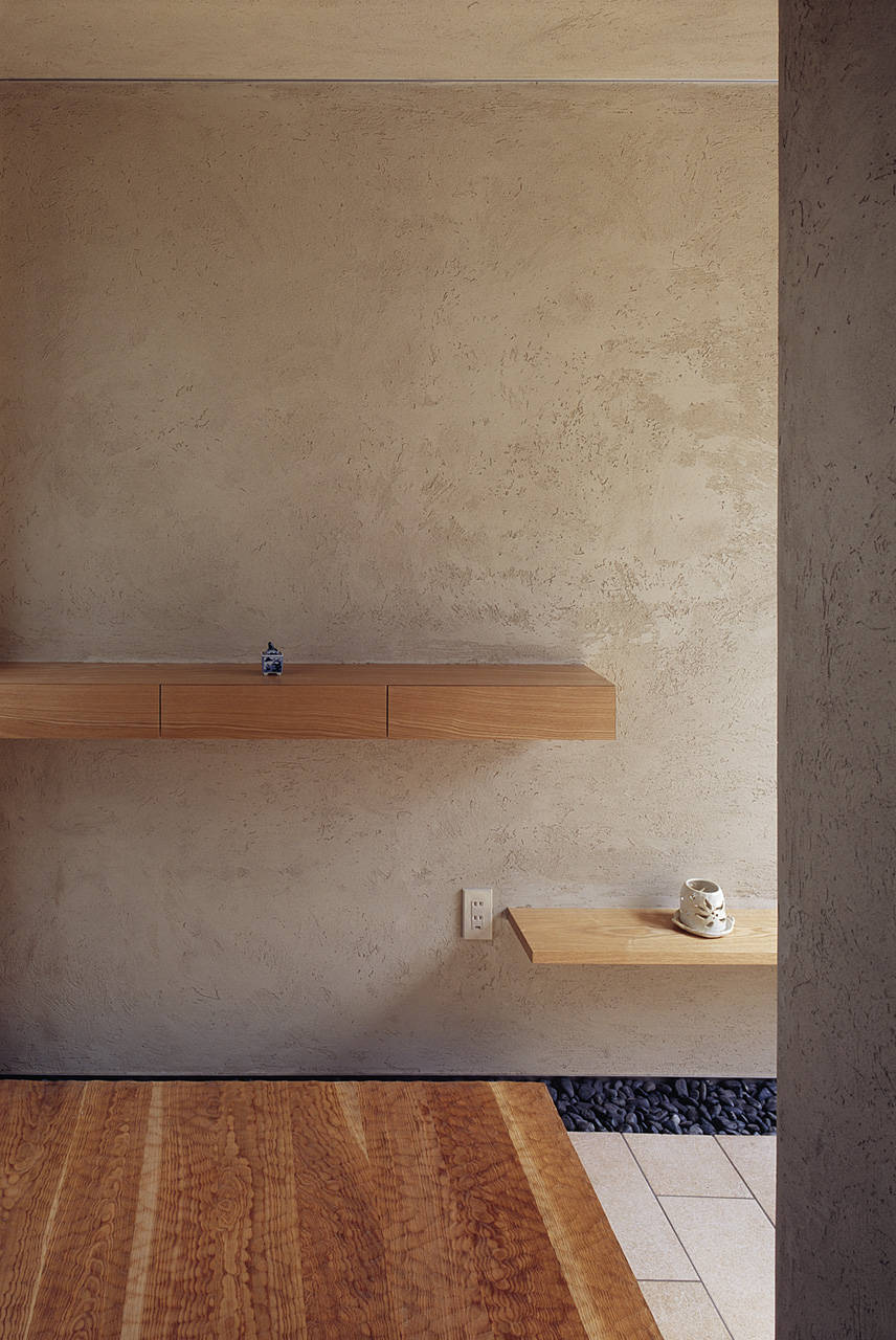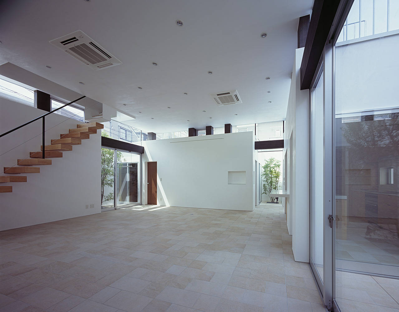 生活空間を来客、水廻り、家事、夫婦、子供の5つのゾーンに分け、子供ゾーン以外の夫婦の生活空間となる4つのヴォリュームを1階に風車状に分散配置し、内部と外部の区別なく漆喰の外壁で包んでいる。