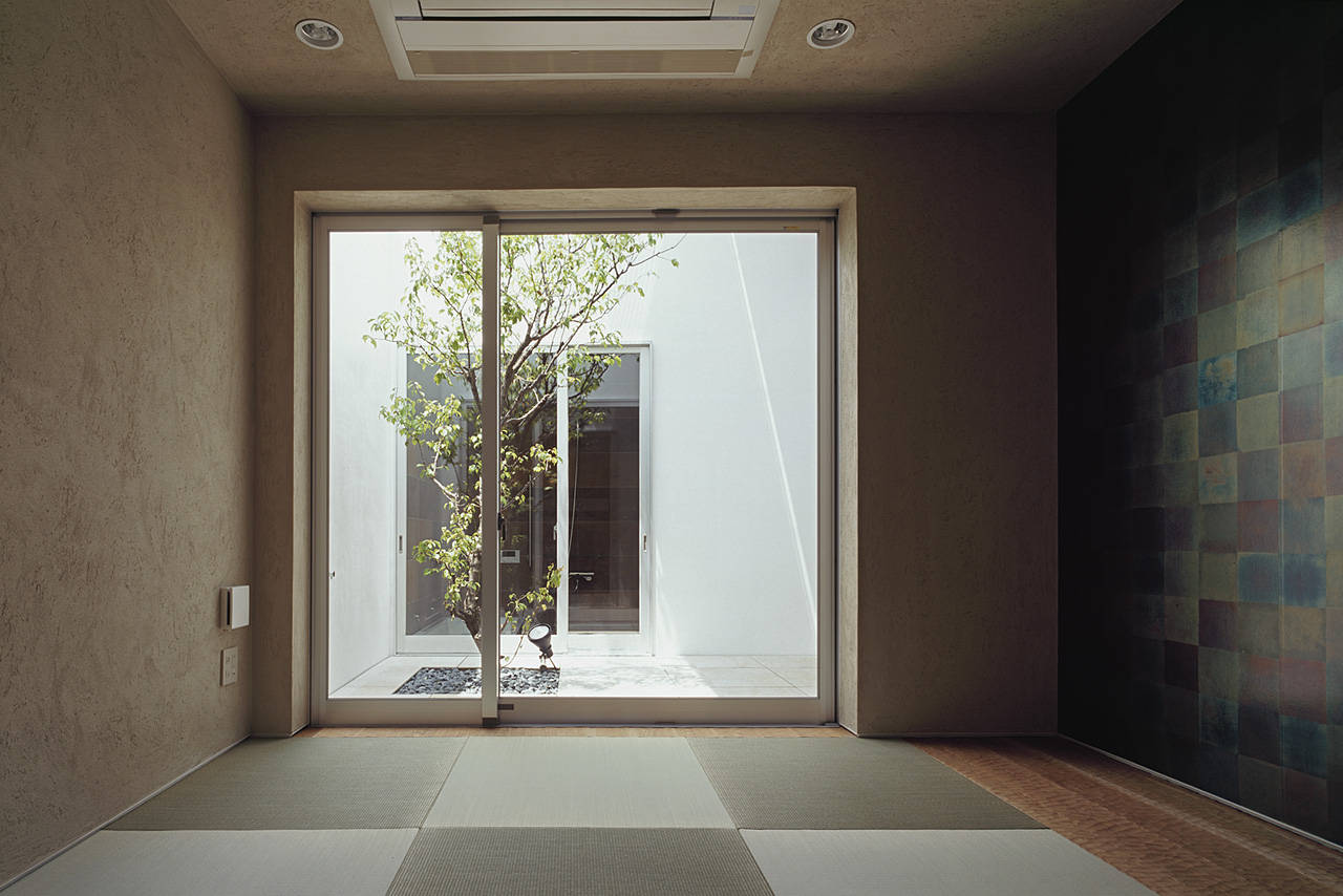 外部からは閉鎖的な一つの住宅として表れ、内部は開放的な分散型の構成となっている。