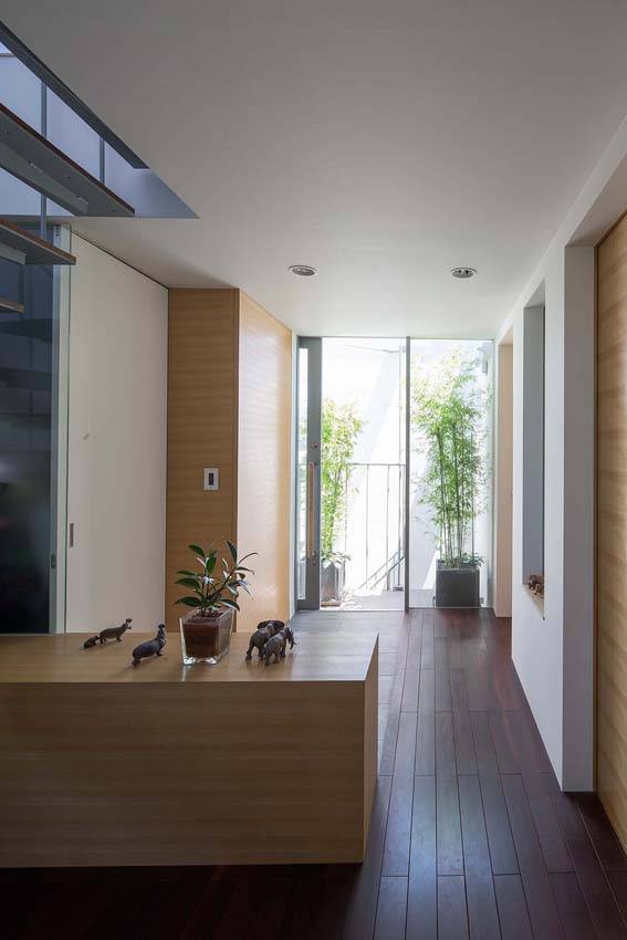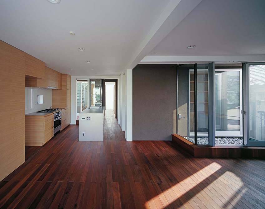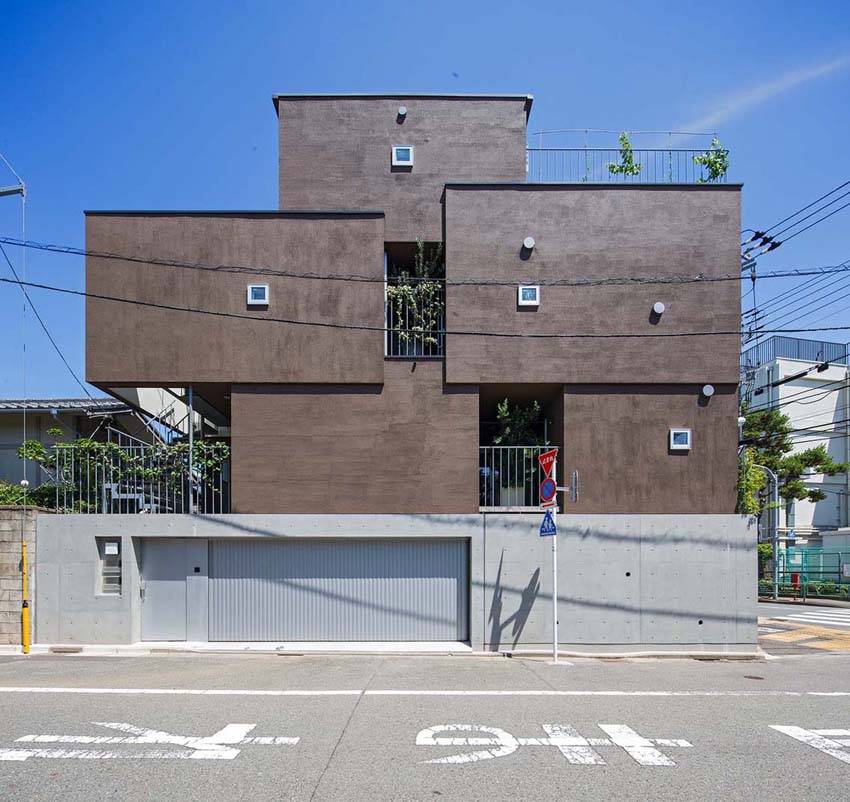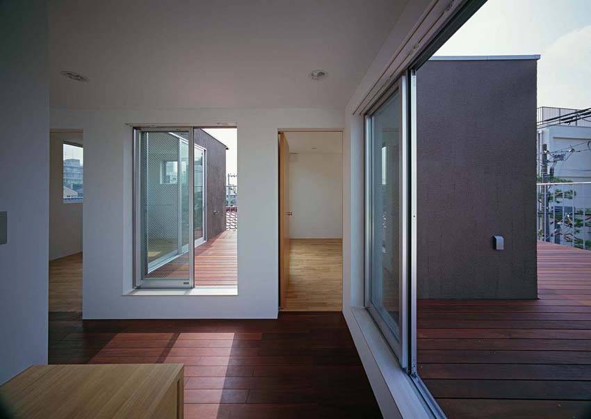 住宅の機能は、寝室、DK、L、水廻りを、それぞれ別のボリュームとして捉え、敷地いっぱいに、立体的な分散配置をさせることで、各室の独立性を高めている。また、それらのボリュームの間には、各室の庭としてのテラスを挟むことで、1階から3階までの全ての部屋が専用庭に面することとなり、3面採光と通風、プライバシーの確保を両立させている。