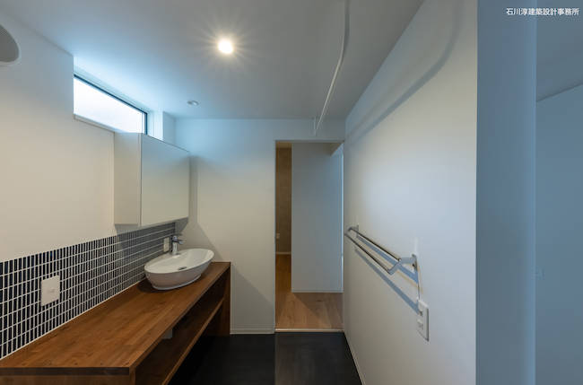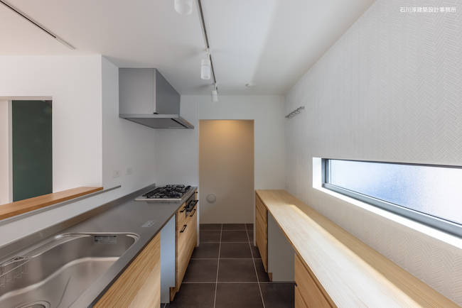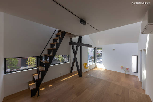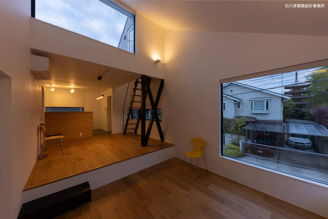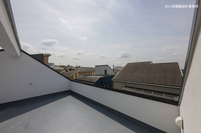 さて、道路対岸には五重塔のある小さな寺院があります。これを借景しない手はありません。大きな正方形の窓とその横に長方形の窓を連続させてコーナーサッシュとし、眺望を取り込みます。さらに、2段あがったスキップフロアにより、キッチンからも大窓を見渡しやすくなっています。当初のプレゼン案では屋上は無くて天窓がありましたが御主人のたってのご希望で屋上バルコニーに。バルコニーとリビングの間はハイサイドライト窓として、プライベートな空を見渡す事ができます。
