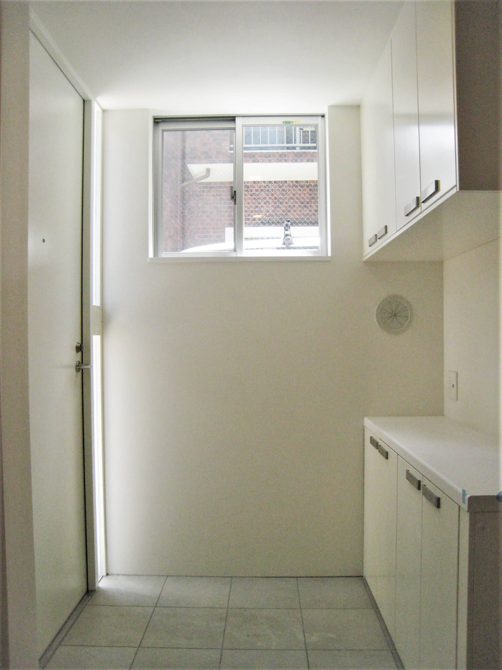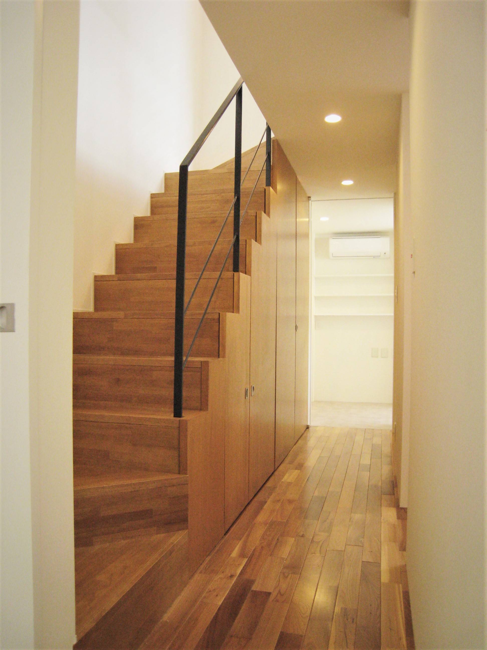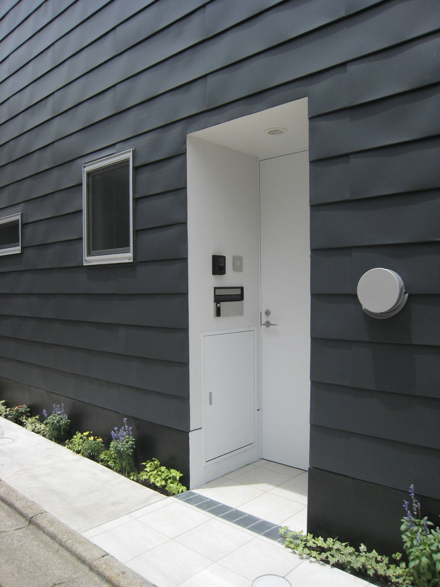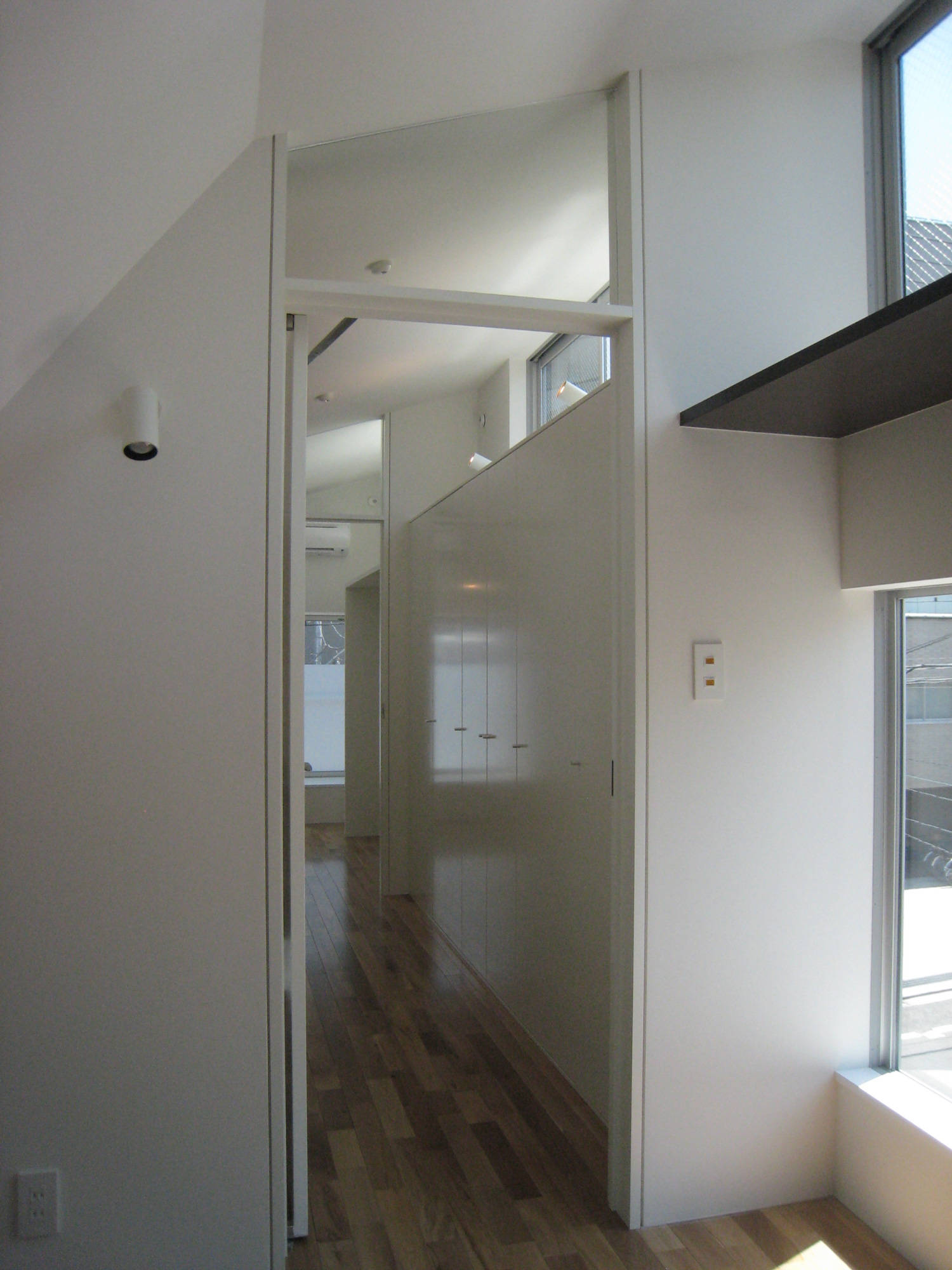 5.4mの公道と、2.7mの二項道路(私道)からなる角地のため、長手に70cmのセットバックと2mと隅切を迫られ、建蔽率、容積率を最大限使用し、出窓、天空率を使用して体積を目一杯確保しています。