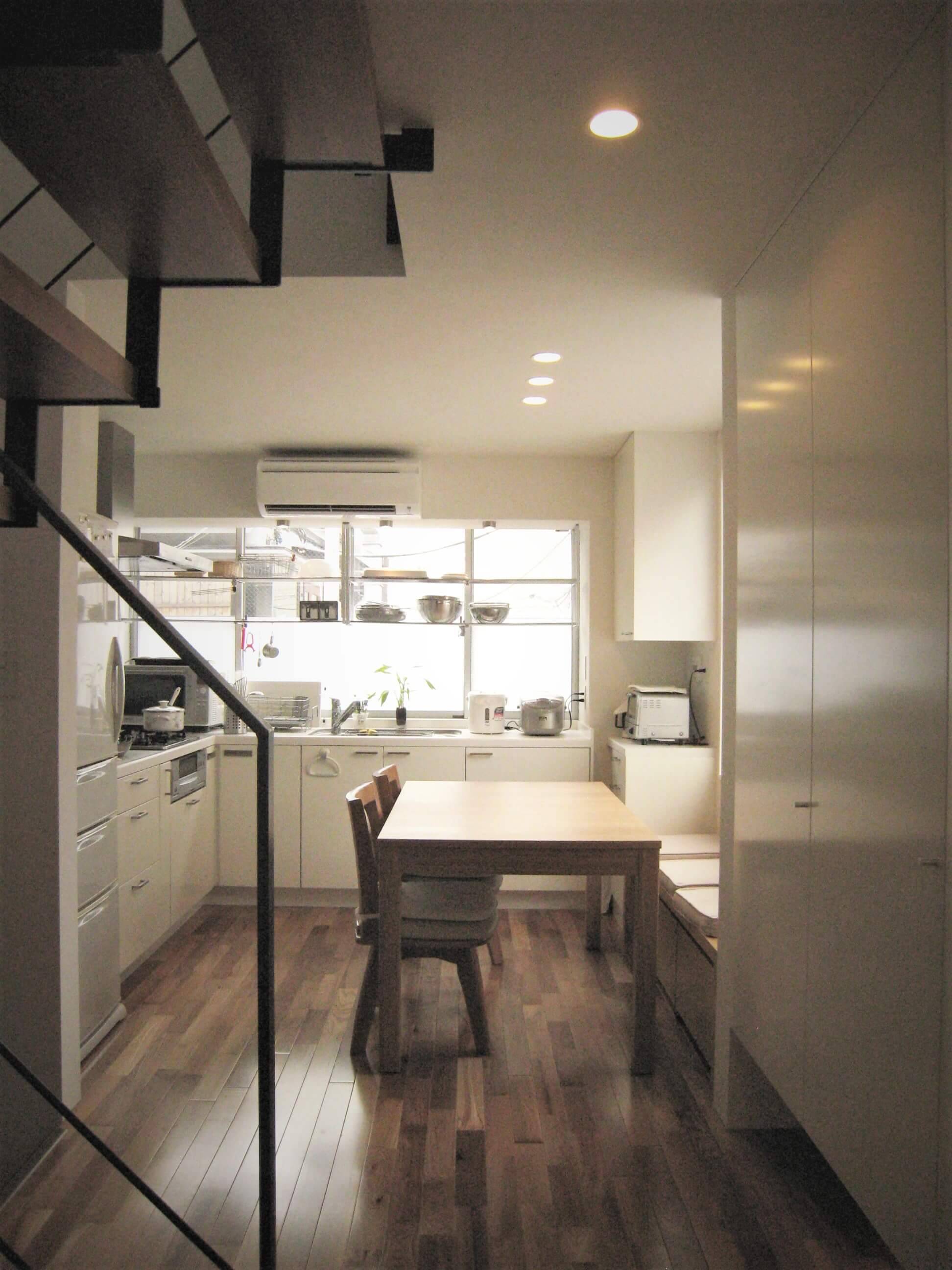 狭苦しさから解放されるように、限られた条件とコストのなか、アトリエ工房、長屋では叶わなかった各個室を確保し、明るくのびやかなLDKを中心とした家となりました。
