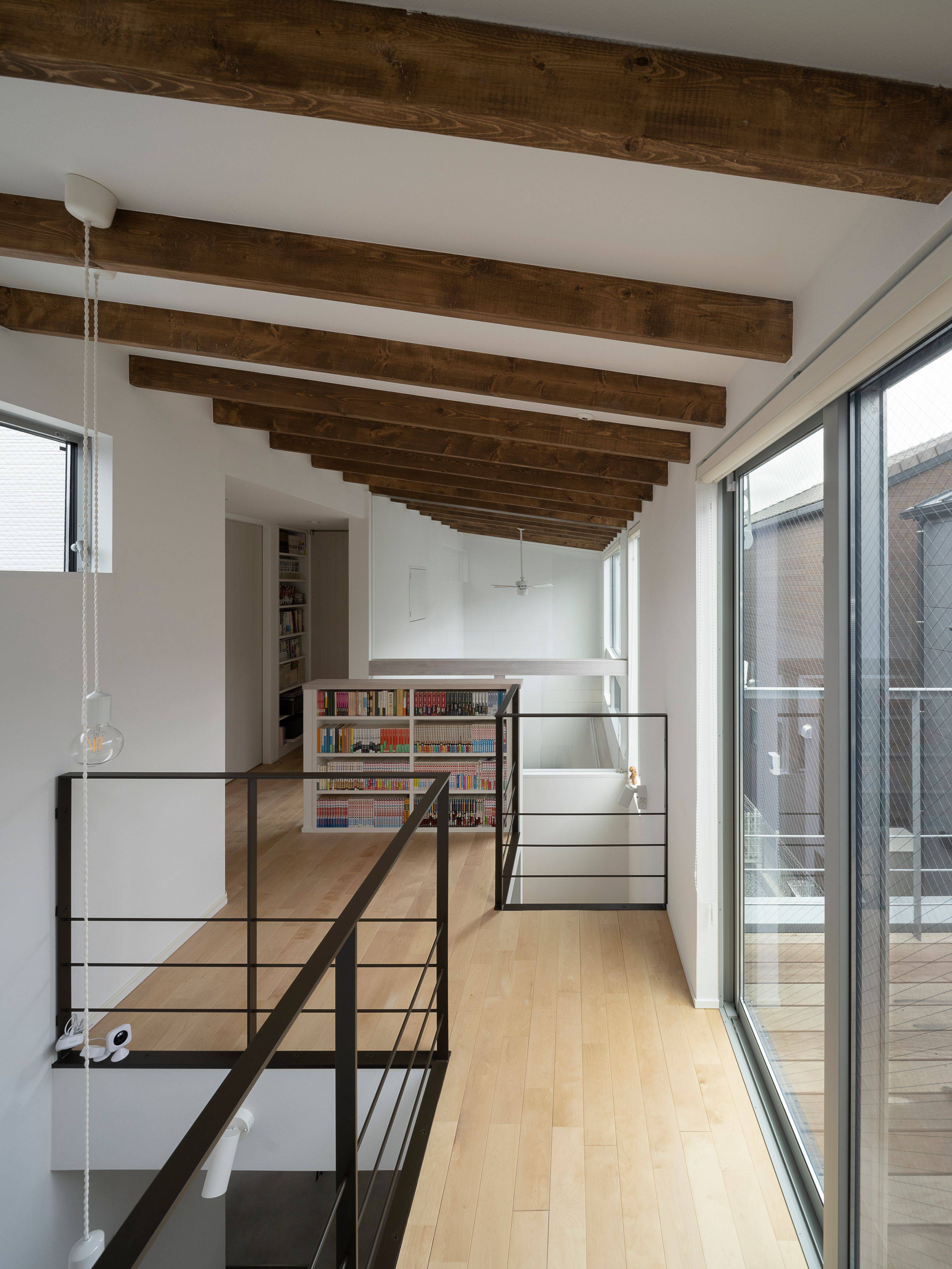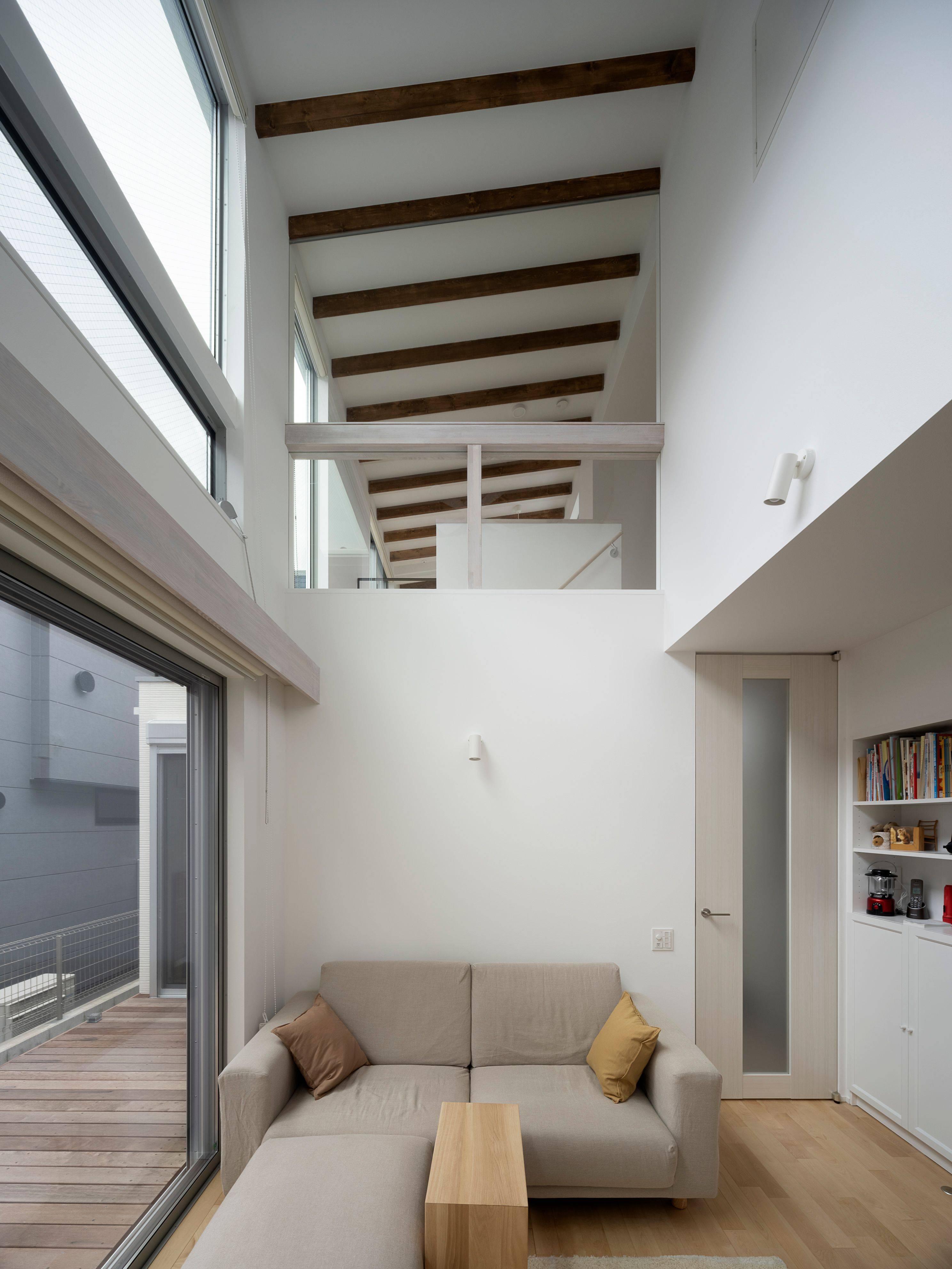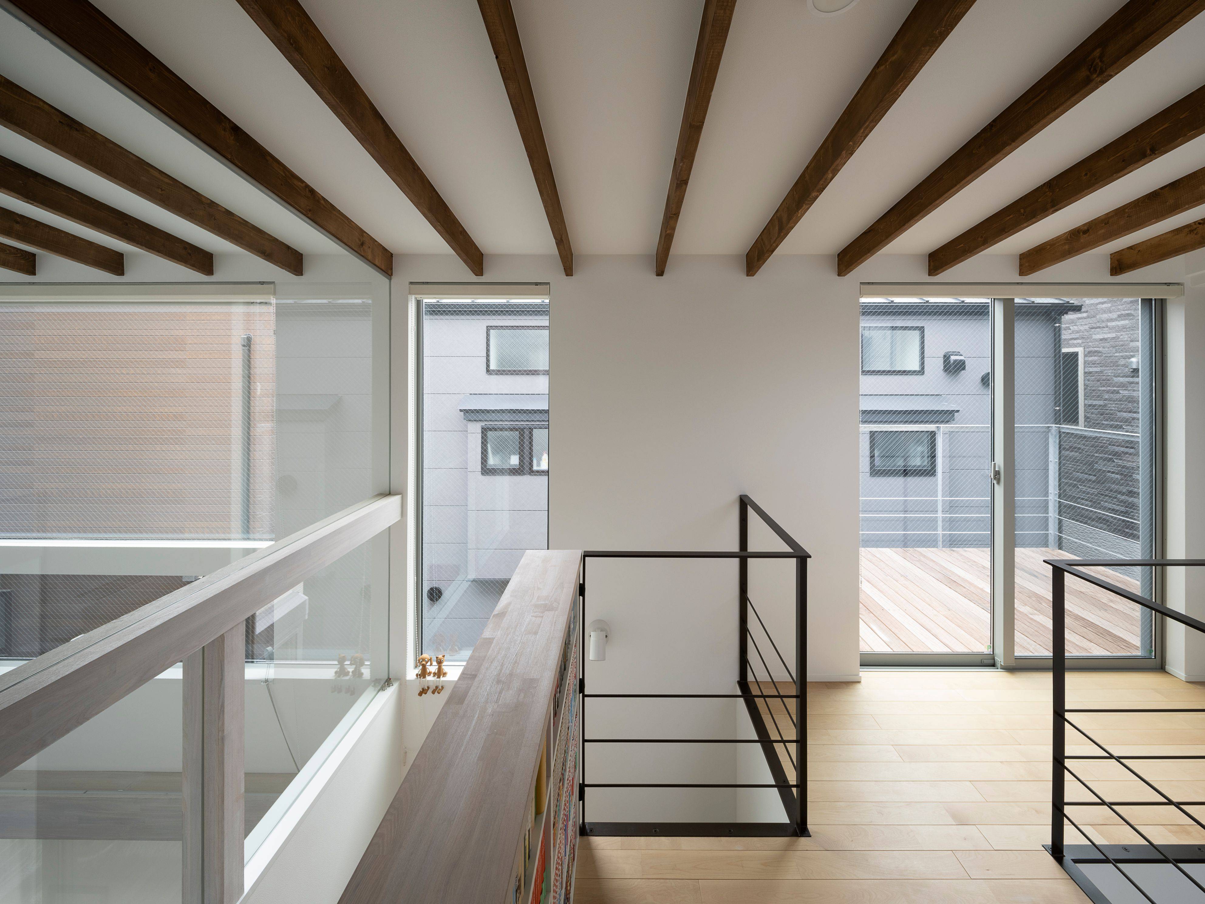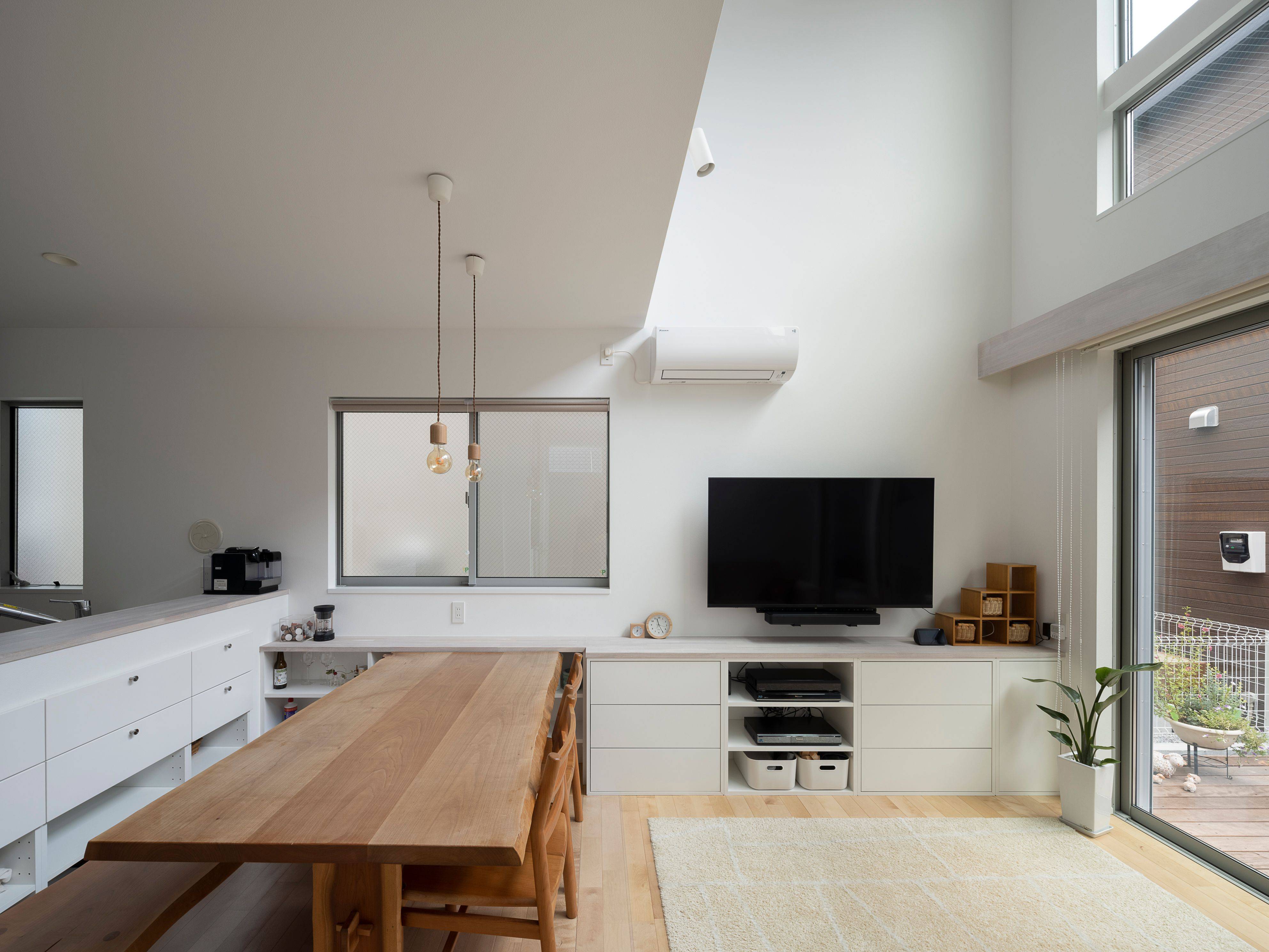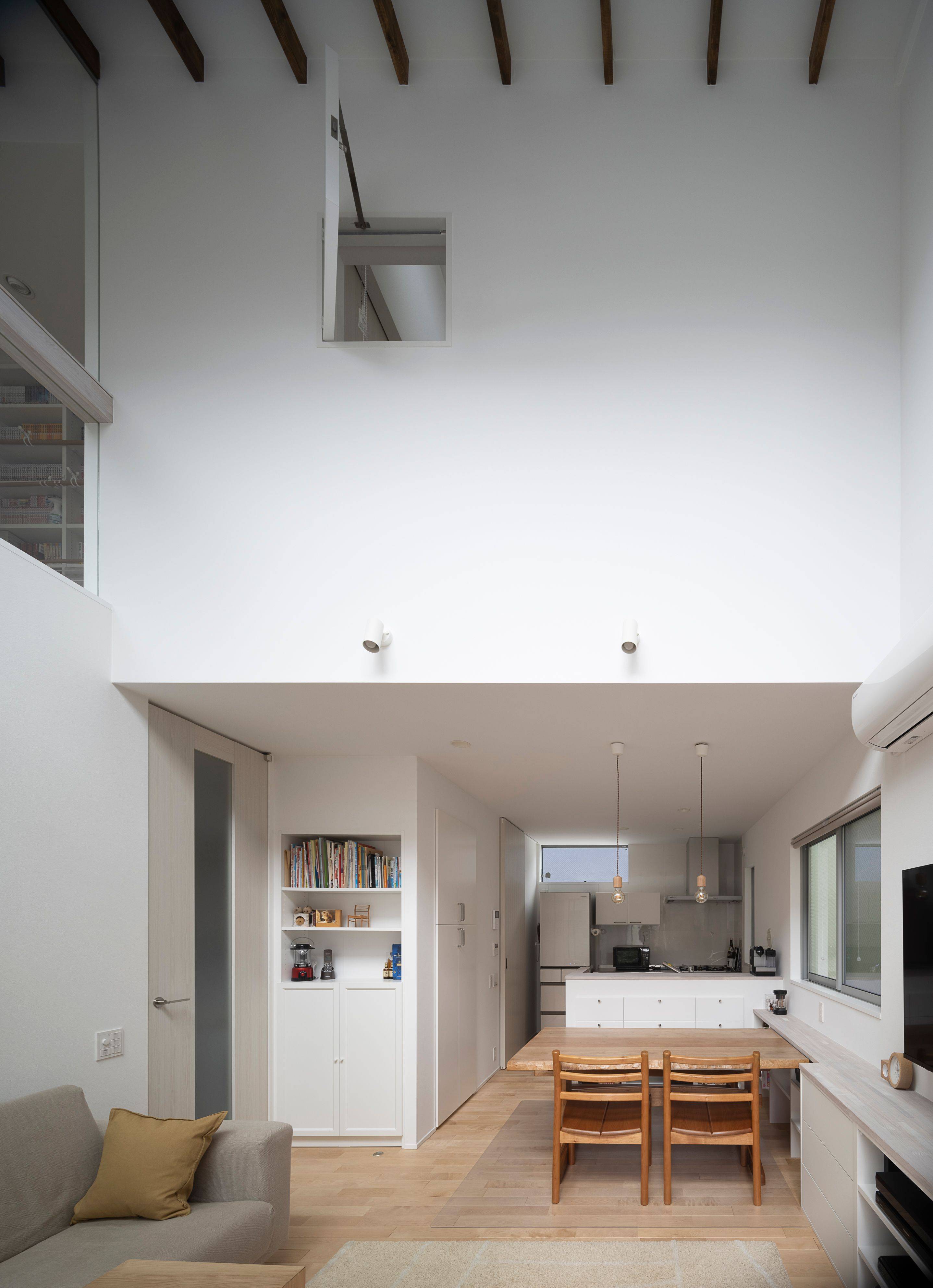 北側道路で、周囲は住宅に囲まれている環境なので、LDKや土間スペースには吹き抜けをつくり、高い位置に設置した開口からの光を取り込み、常に明るく、コンパクトながらものびやかな空間に仕上がりました。