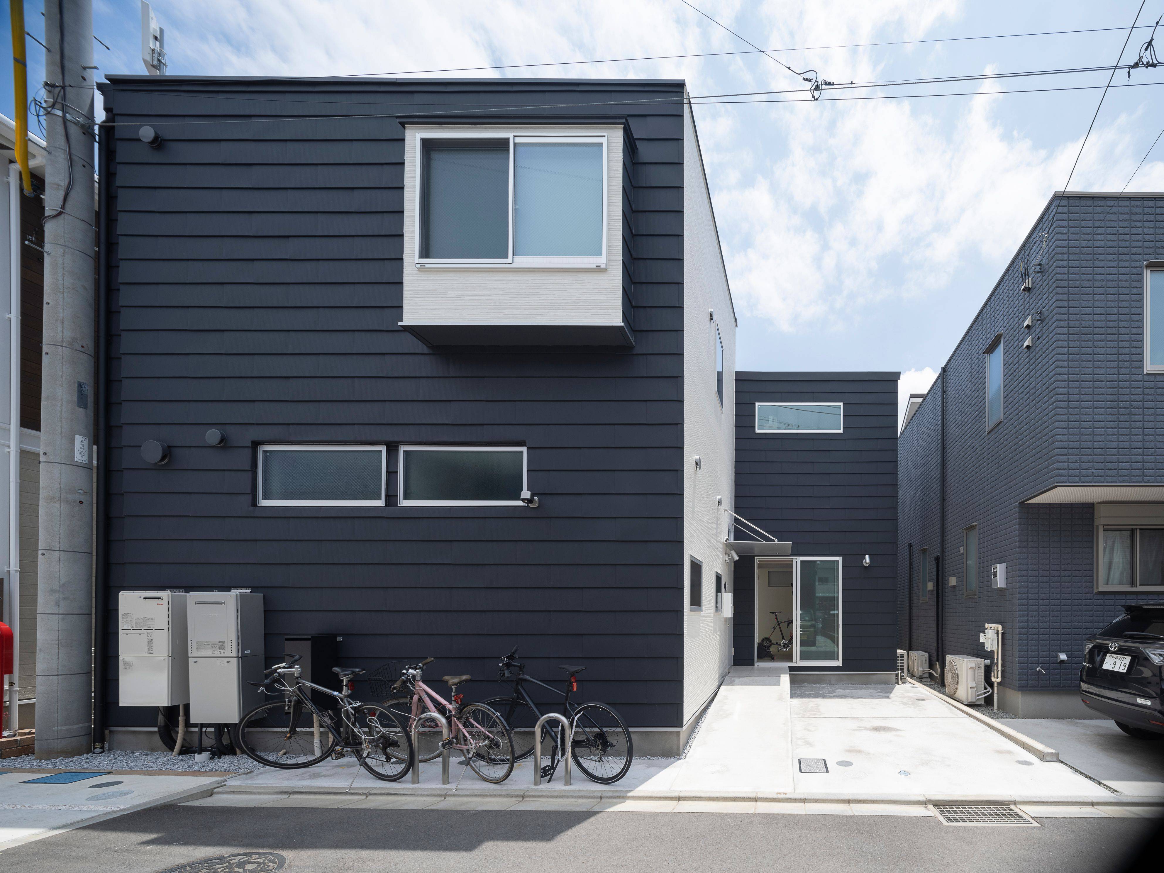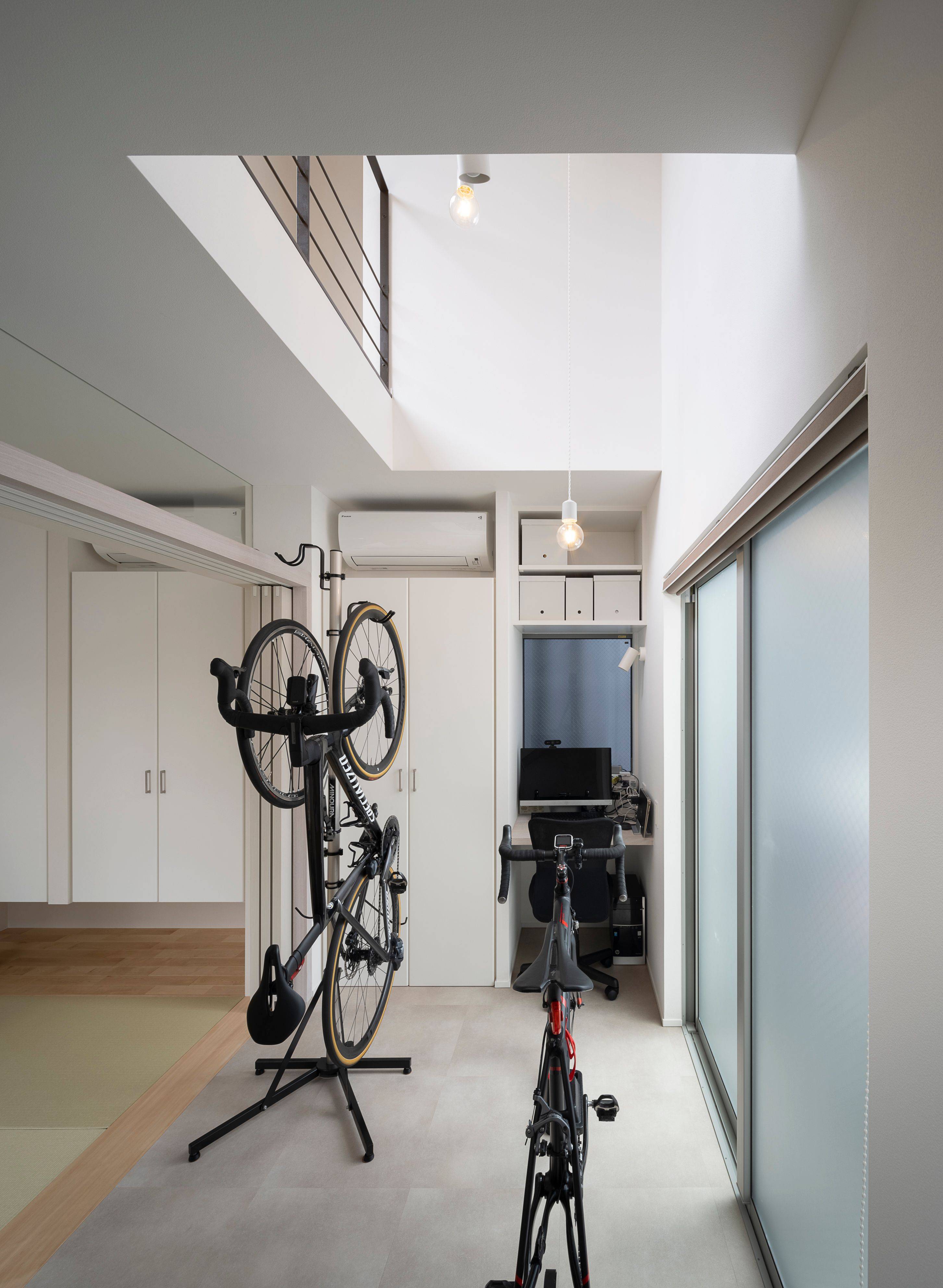 ご主人はロードレーサーなどを数台お持ちで、隙間時間にはトレーニングをされたいということで、外から直接自転車を出し入れできるように、エントランス脇に土間を設けてトレーニングルームと書斎とを兼用にしています。