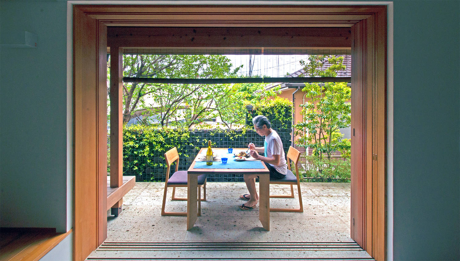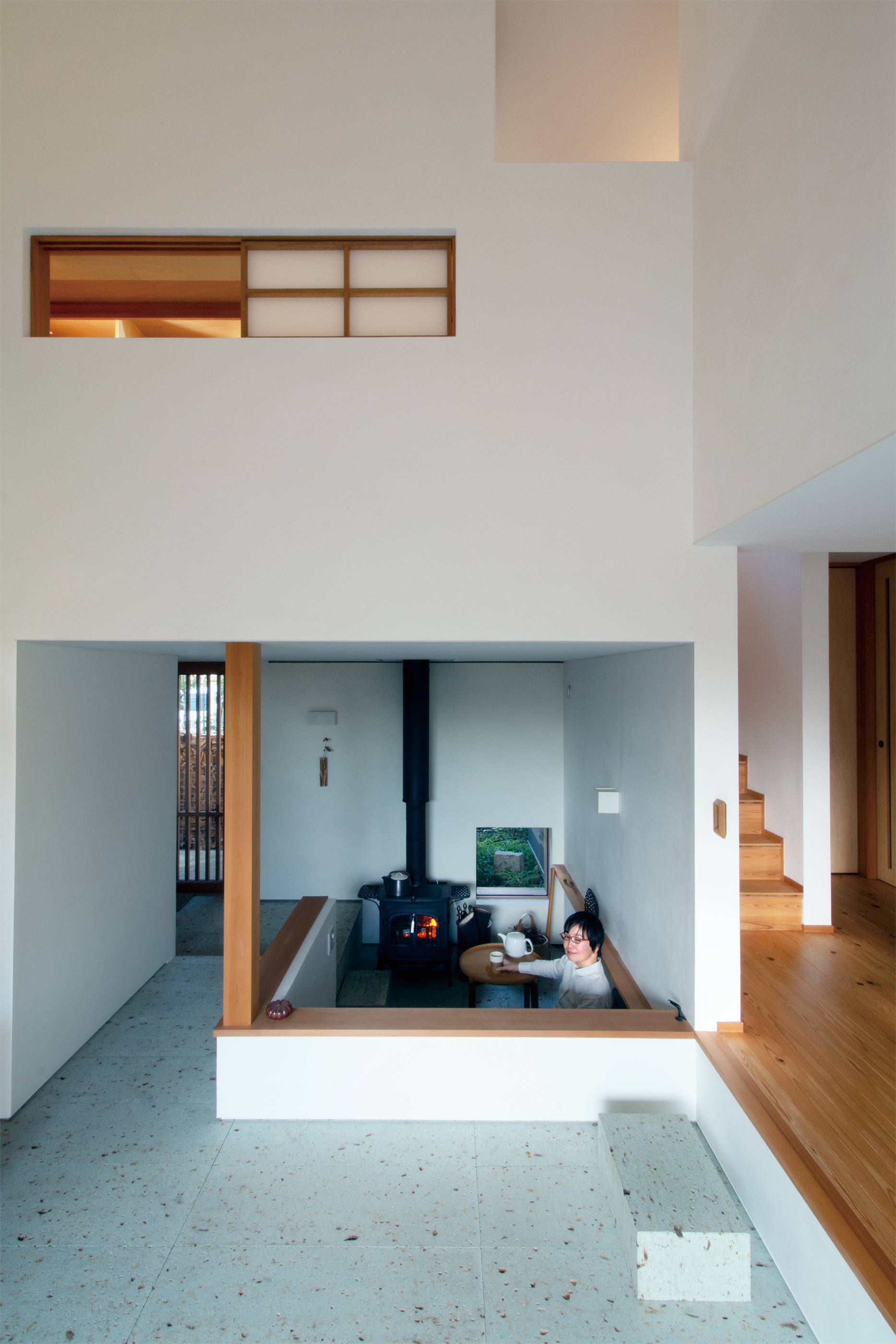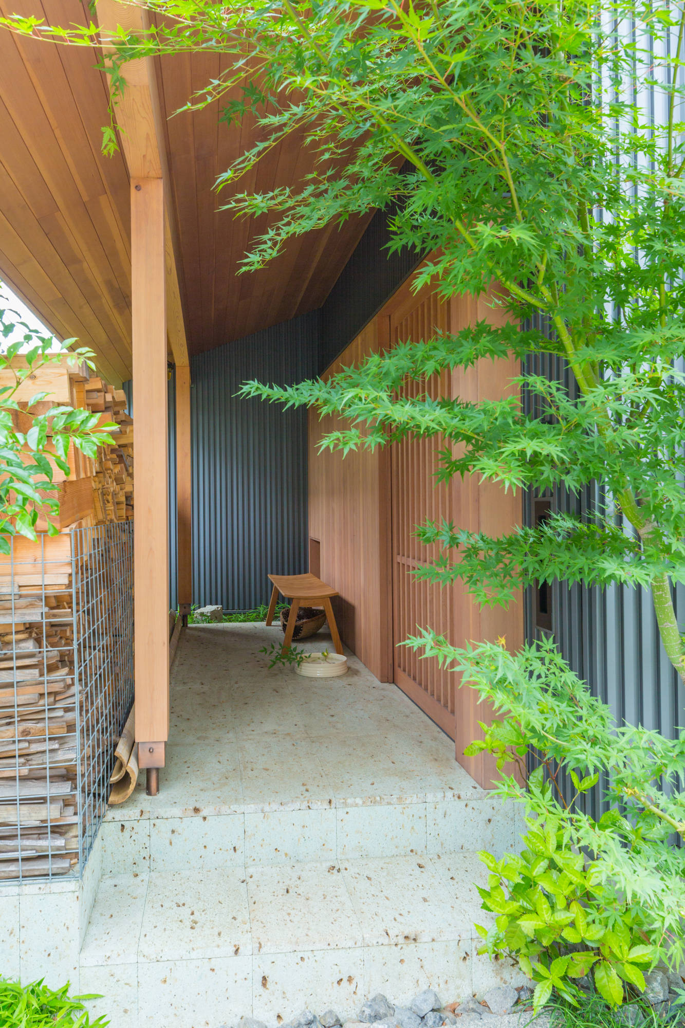 そんな通庭では、春にお花見、冬は薪ストーブを楽しみます。さらに通庭は北庭や南庭など屋外にも続きます。北庭では、薪棚で周囲と緩やかに仕切りつつ、ベンチを設けて井戸端会議ができます。南庭では、机と椅子を並べてオウチカフェを楽しみます。塀と緑で囲まれた浴室で鈴虫や鳥のさえずりに耳を傾け、半露天風呂気分を味わい、濡れ縁では夕涼みやお月見を、2階のアウトドアリビングでは打上花火が楽しめます。