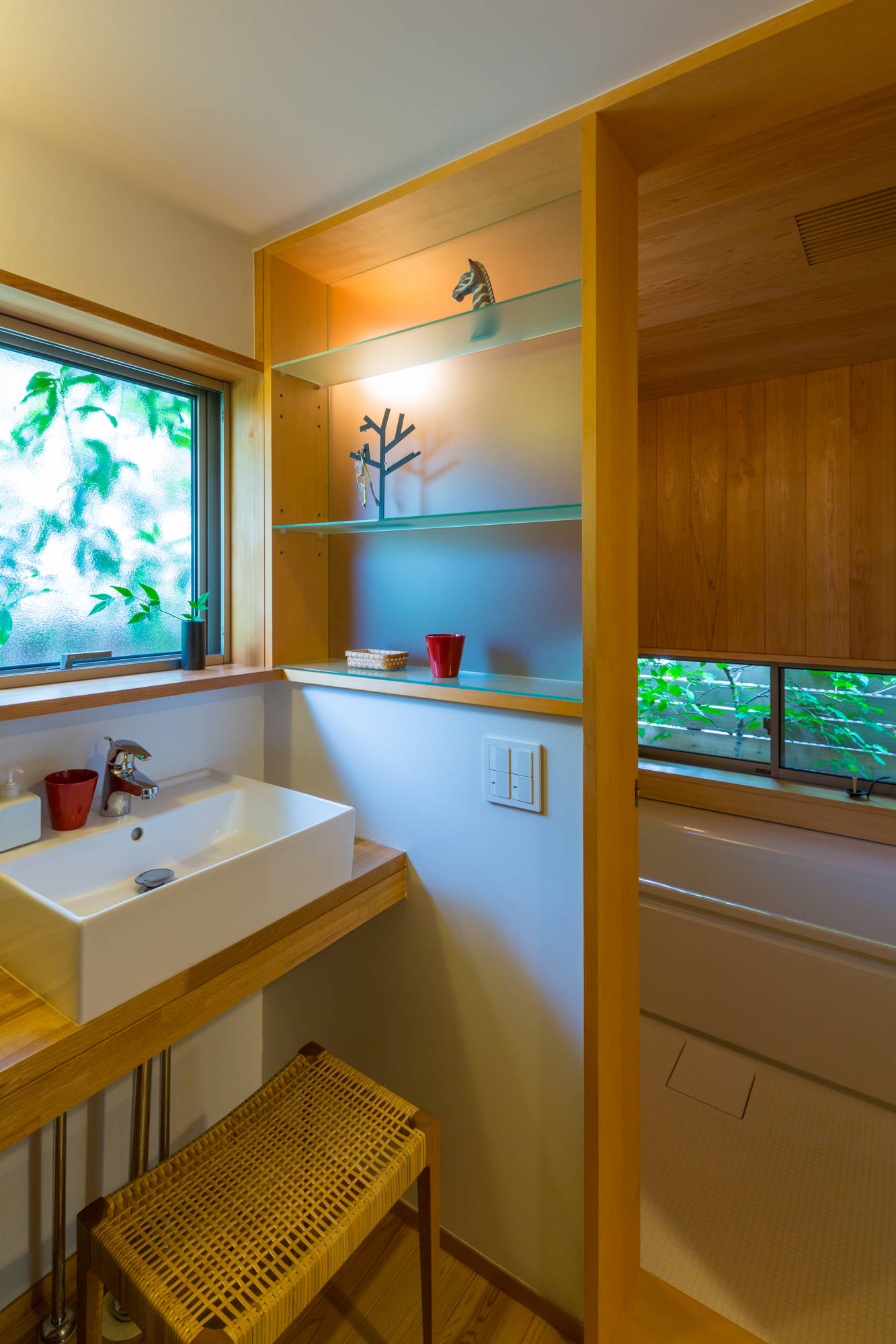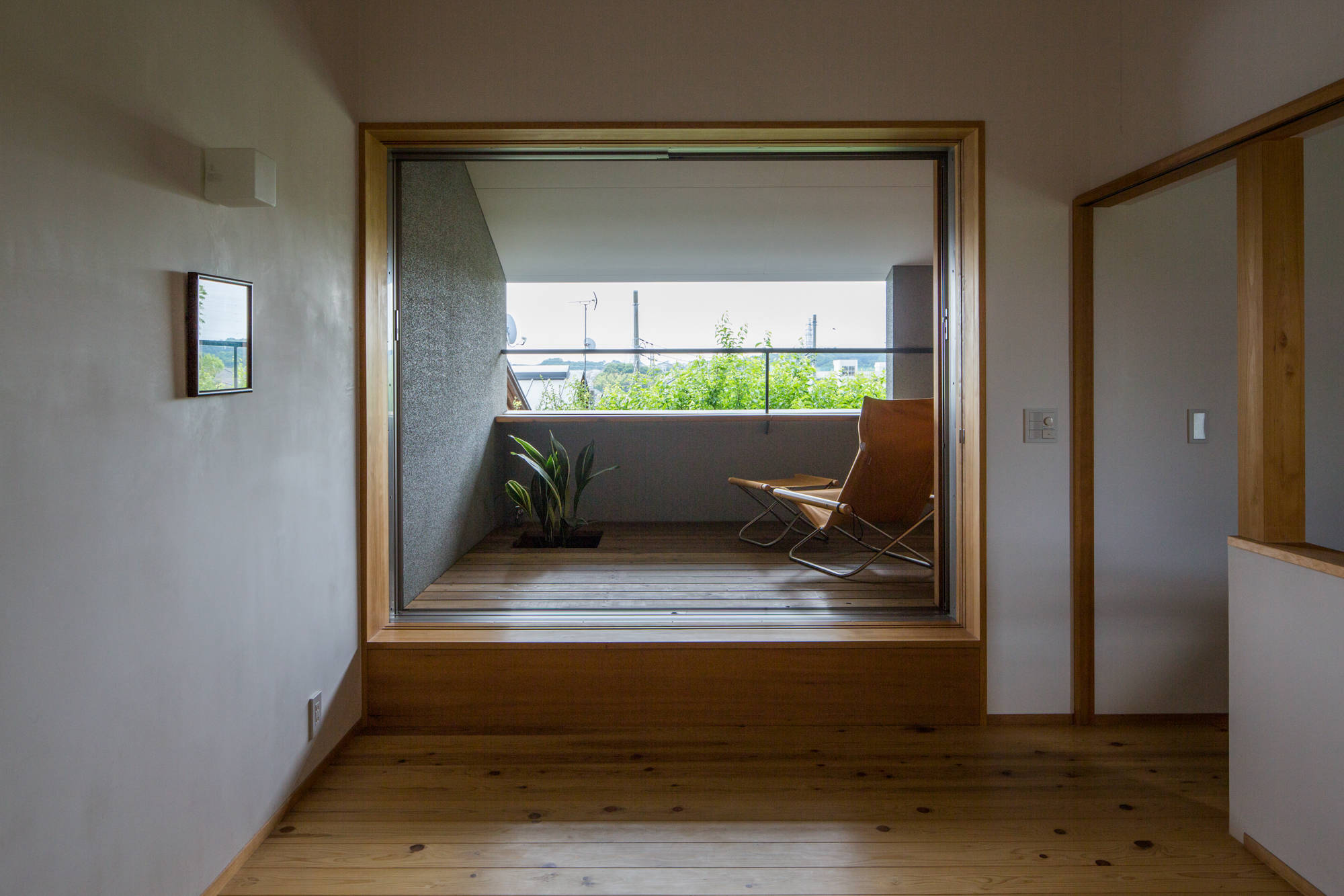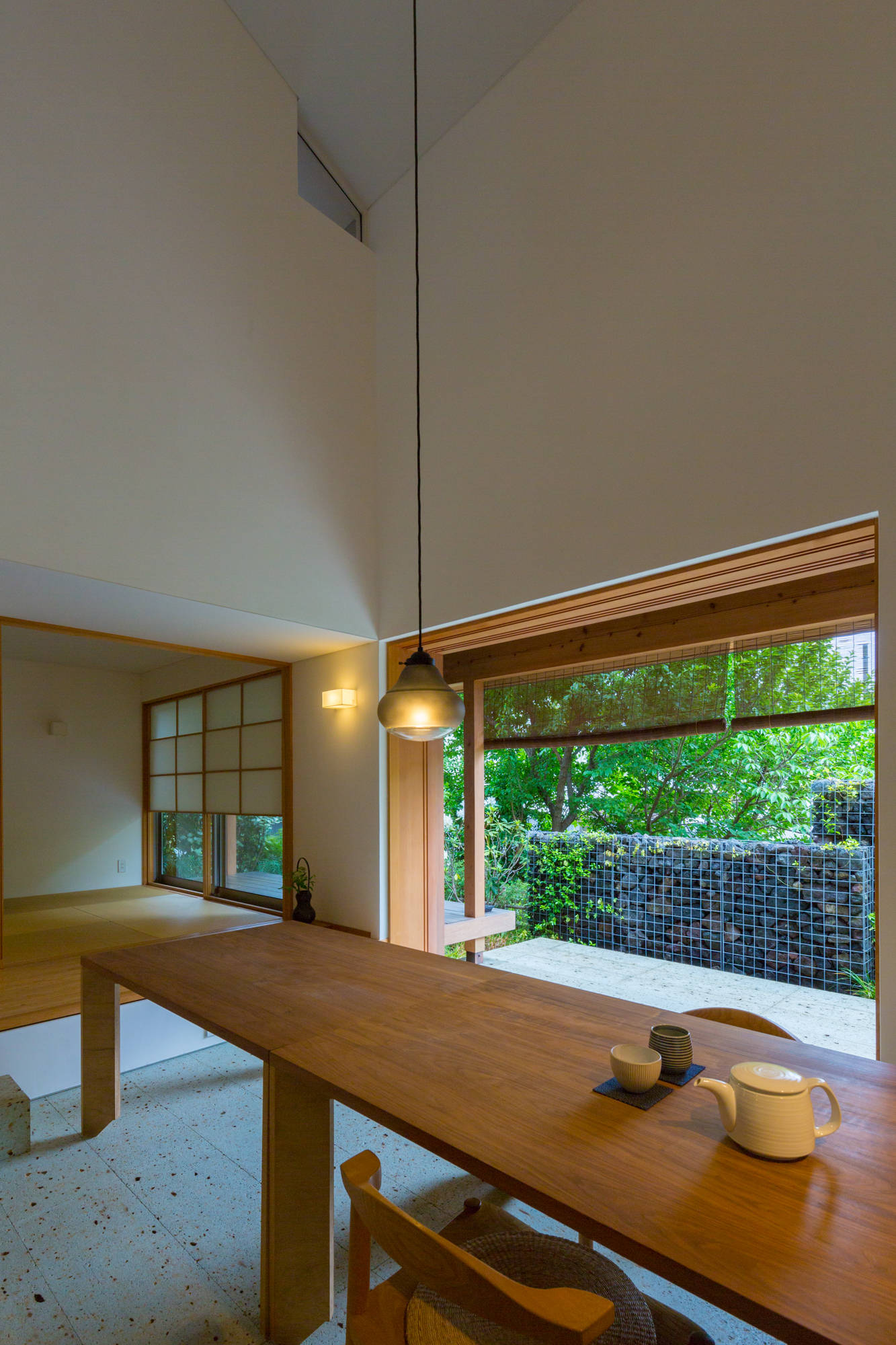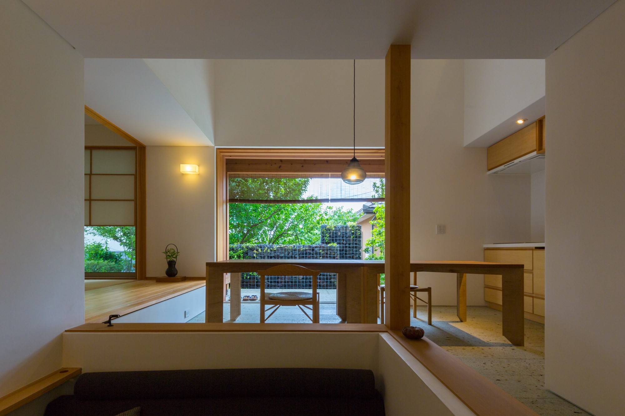 そんな通庭では、春にお花見、冬は薪ストーブを楽しみます。さらに通庭は北庭や南庭など屋外にも続きます。北庭では、薪棚で周囲と緩やかに仕切りつつ、ベンチを設けて井戸端会議ができます。南庭では、机と椅子を並べてオウチカフェを楽しみます。塀と緑で囲まれた浴室で鈴虫や鳥のさえずりに耳を傾け、半露天風呂気分を味わい、濡れ縁では夕涼みやお月見を、2階のアウトドアリビングでは打上花火が楽しめます。