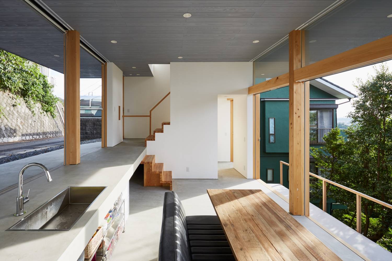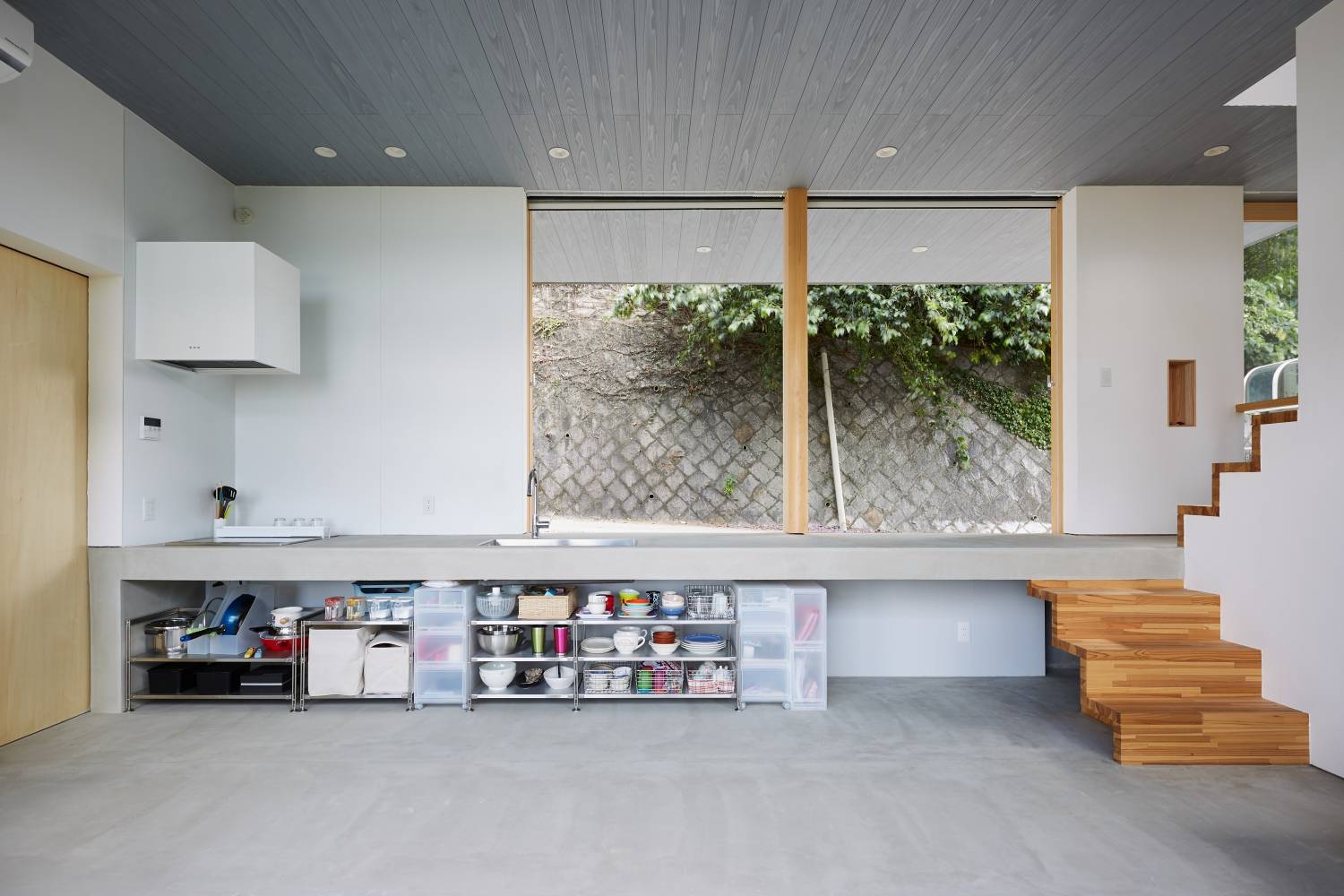 東側の最上段は道路との緩衝空間となり、そして玄関ポーチや車寄せとなる。また、この段を内側へ90cm伸ばし、道路と同レベルのキッチンカウンター、子供たちの勉強するデスク、2階への階段の踊場とした。この段差と生活の方向によって、前面道路を散歩する近隣住民の視線に対してぶつかり合う訳でも閉じる訳でもない適切な関係をつくりたいと考えた。
