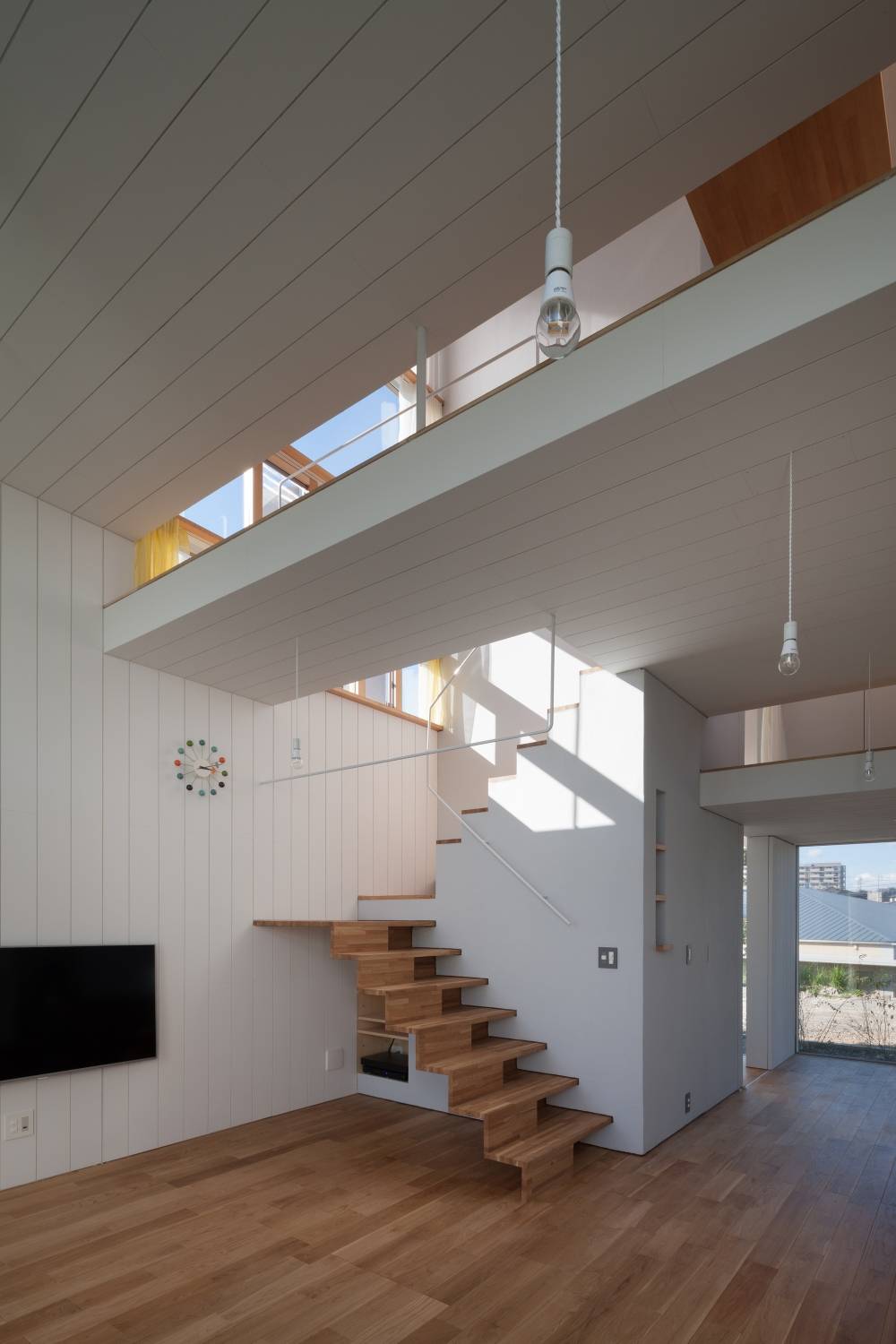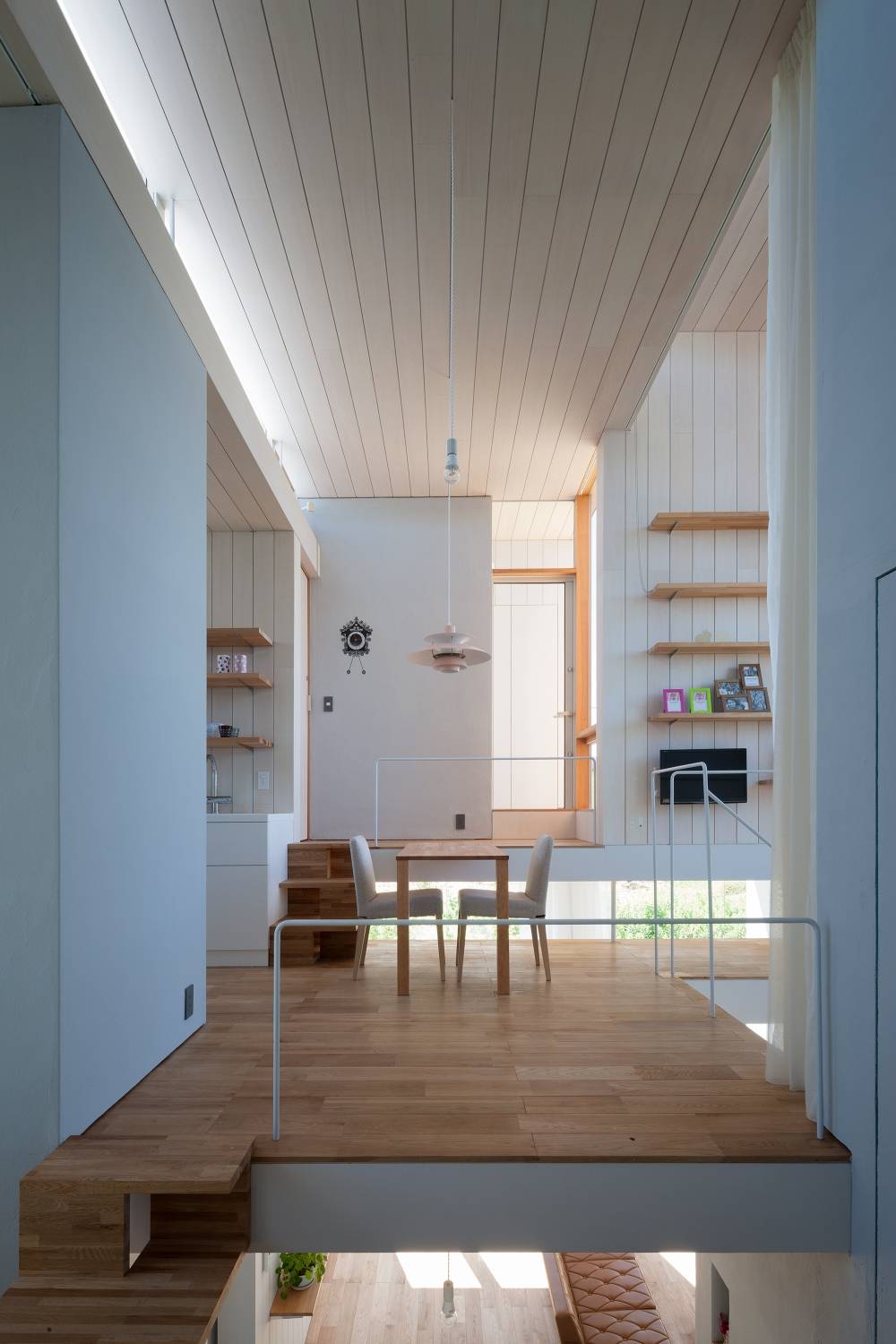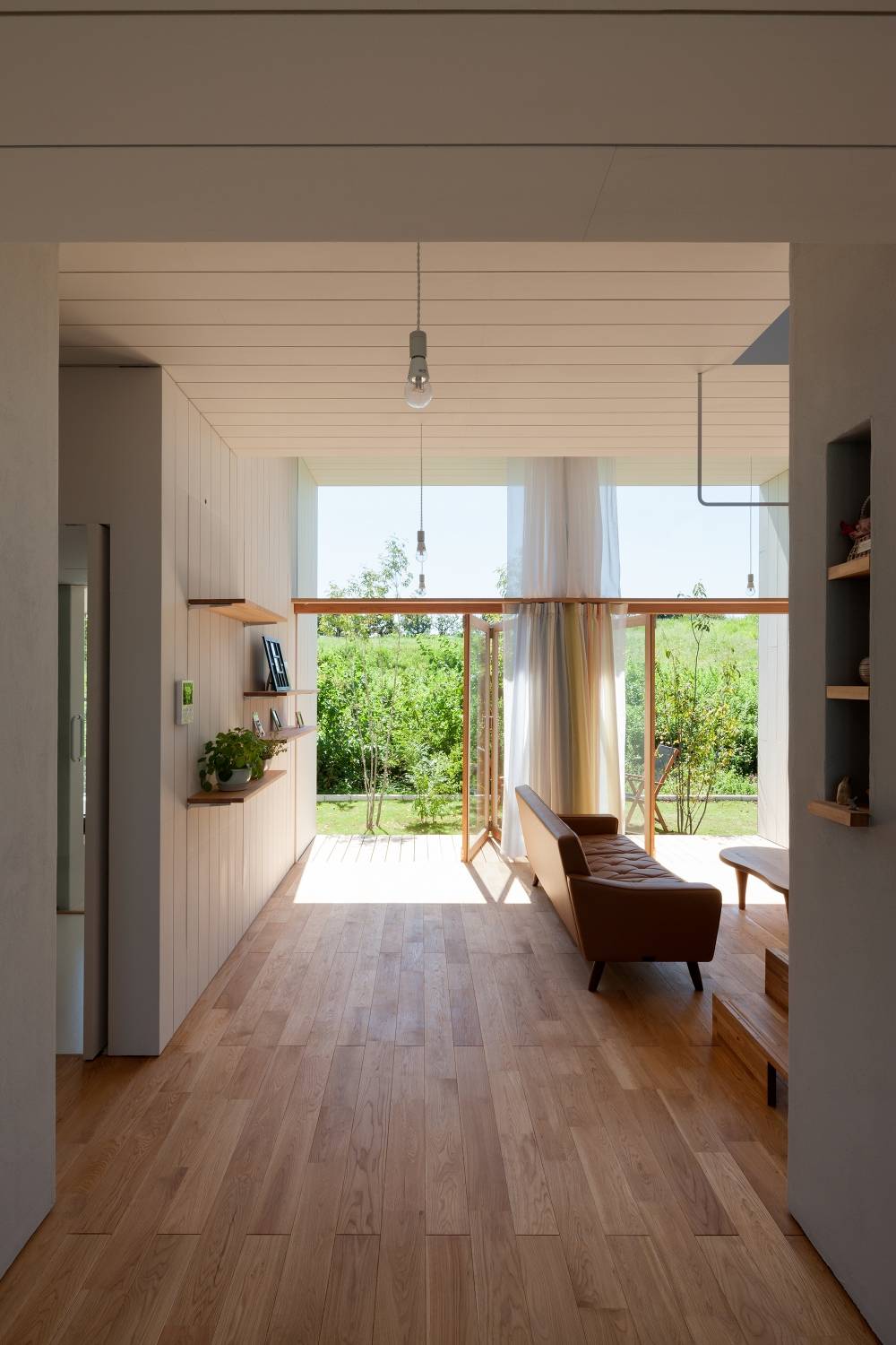 それらによってできたのは、朝の光で目覚めたり心地よい風の中でうたた寝したりしたい、どこにいても相手の気配を感じていたい、けれど収納は沢山ほしい、という建主の要望に応えた、居場所によって光も、風も、音も、空の広さも、流れる風景も異なる、そして、内外が連続する、ひとつながりの、「風景を通す家」である。