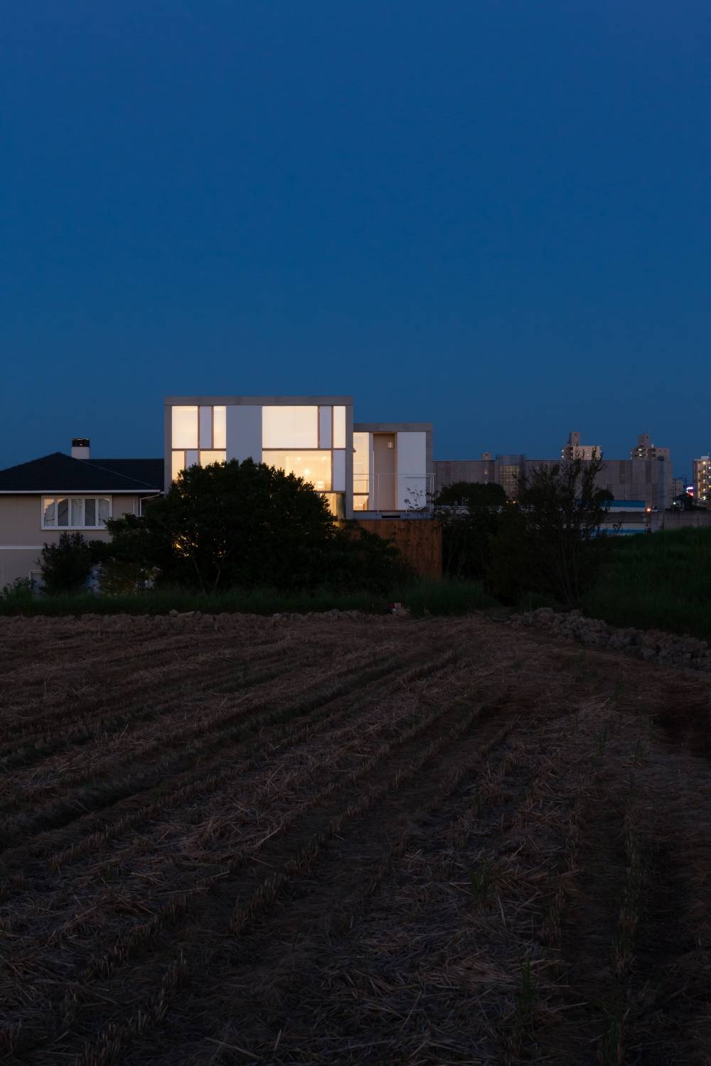 農業振興地域に指定された棚田が南と西に大きく広がる敷地に建つ、家族3人のための住宅である。
