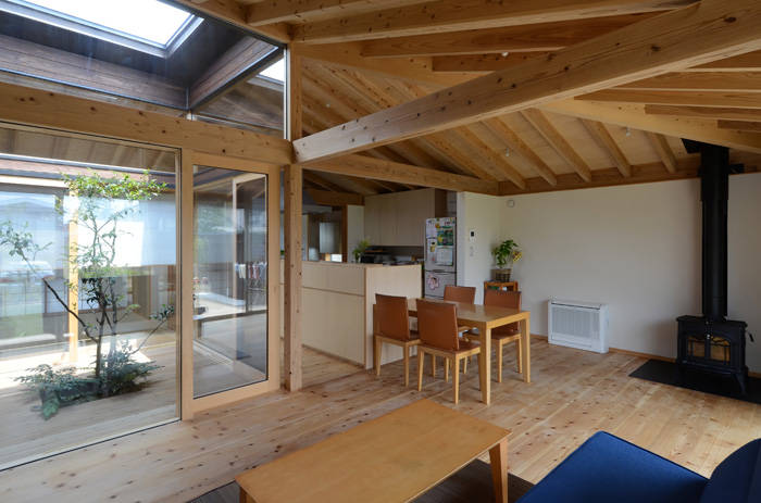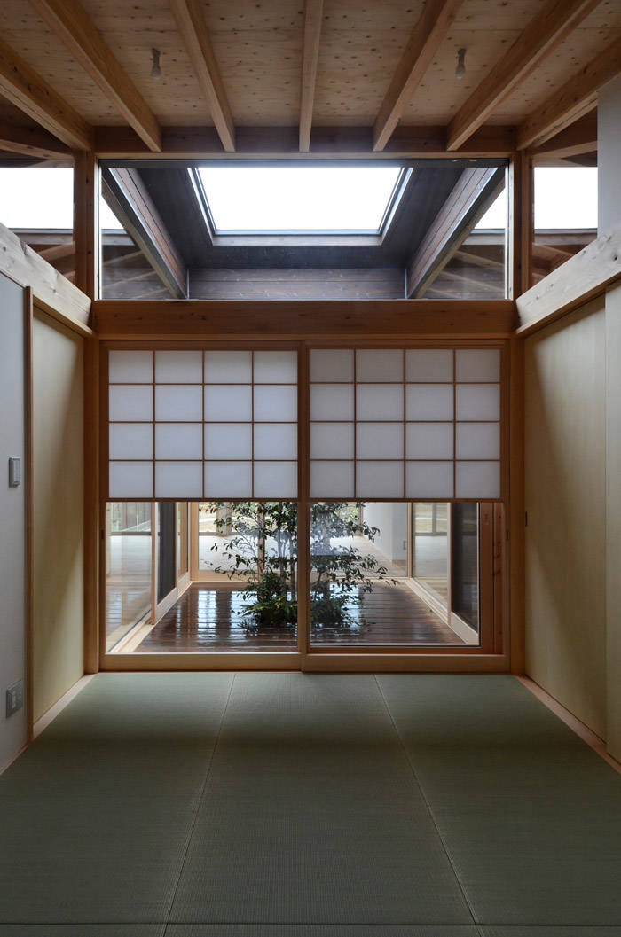 真四角のプランに方形の屋根。極めてシンプルな計画ですが、屋根の中心がトップライトのようにぽかんと抜けています。あたかも家の内部に取り込まれたような感覚を持つ中庭です。切り取られた空が四周のガラスに反射し不思議な光景を作り出し、春夏秋冬、朝昼晩で様々な表情が見られます。