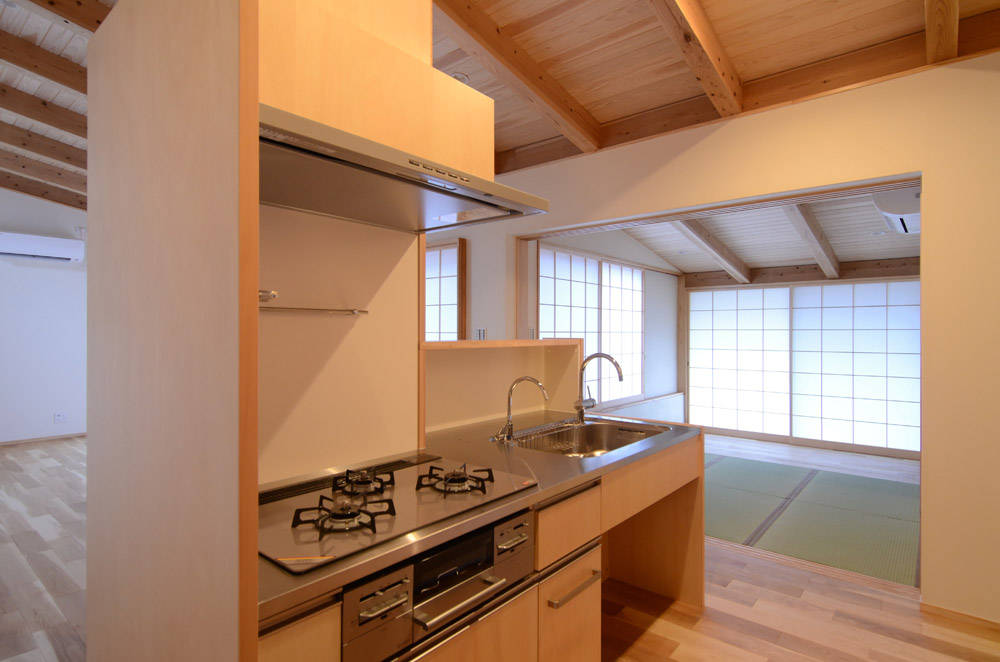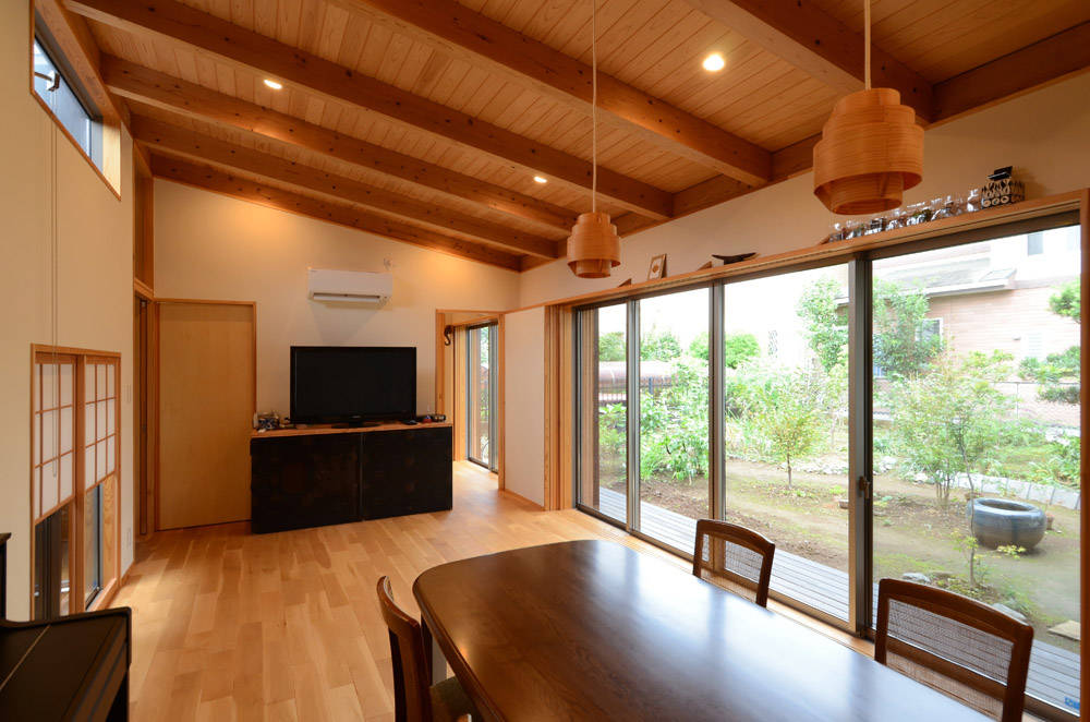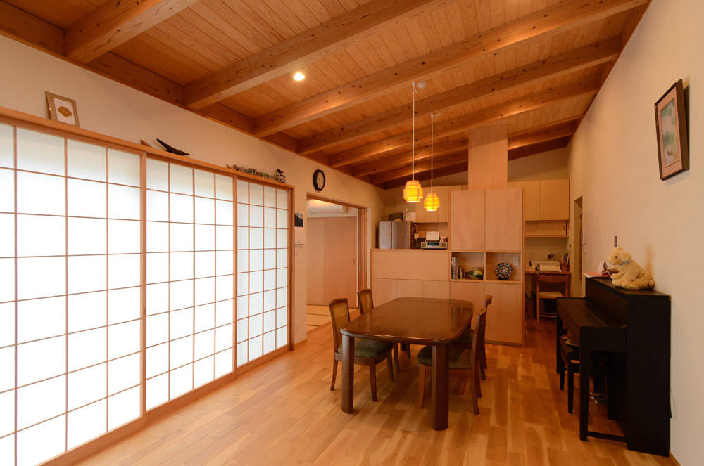 開口部が多いので温熱最優先の設計ではないですが(UA値=0.70)、庇や障子の効果もあり、床暖房もあるのにもかかわらず、実際の消費エネルギーは基準値の半分程度とかなり低く押さえられています。単に数字を追い求めるだけでない真に居心地の良い住まいです。