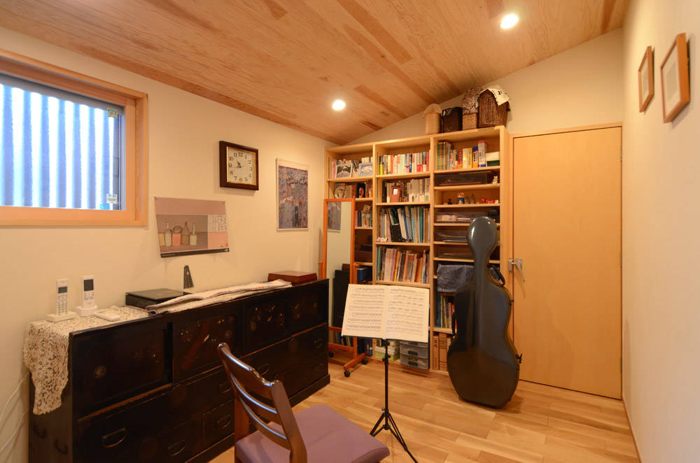 奥様がチェロを奏でる音楽室は防音の意味からも水回りを挟んで北側に配置。壁も開口部も全て二重構造になっていますが、防音室にありがちな閉塞感のある部屋ではなく、日常でも快適な全てが手作りの防音室となっています。