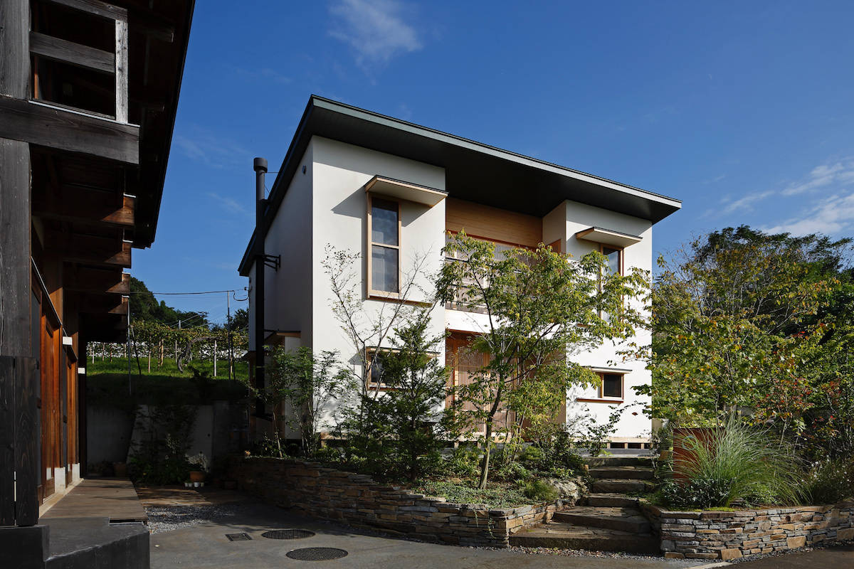 出しゃばらずに一歩引いて夫に寄り添う配置、夫より幾分低い屋根の高さ、大きな骨組みを猛々しく現した夫に対し、塗り壁の薄化粧を施して格子戸のベールを被った可憐な外観は、この家に嫁いで来た新婦の姿と考えました。