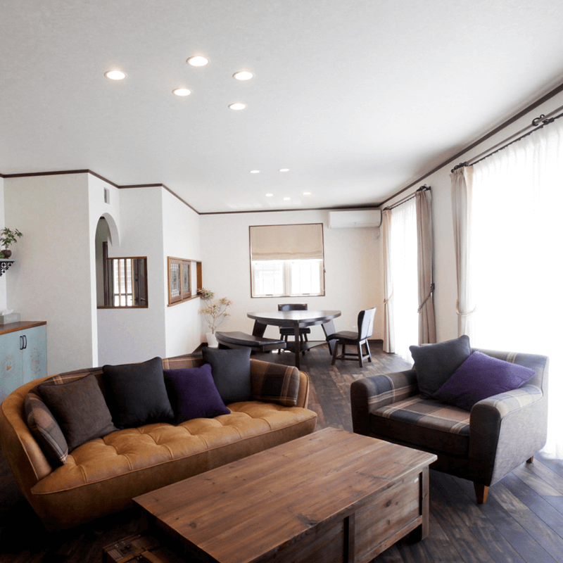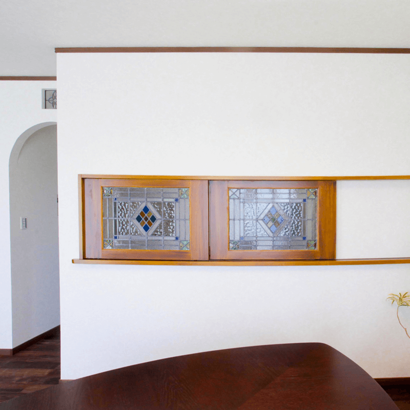 ダイニングとキッチンはステンドグラスの引戸で空間分けられます