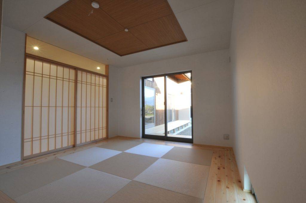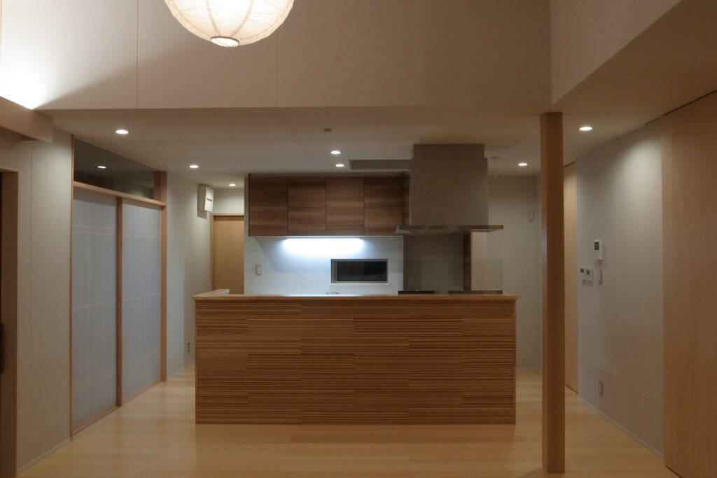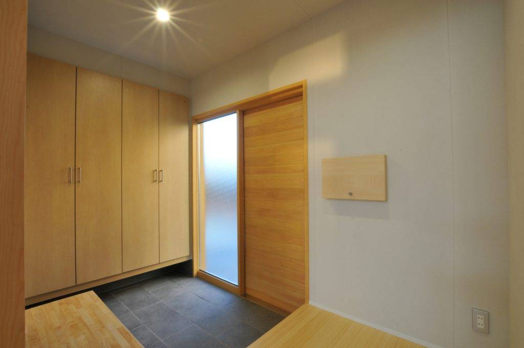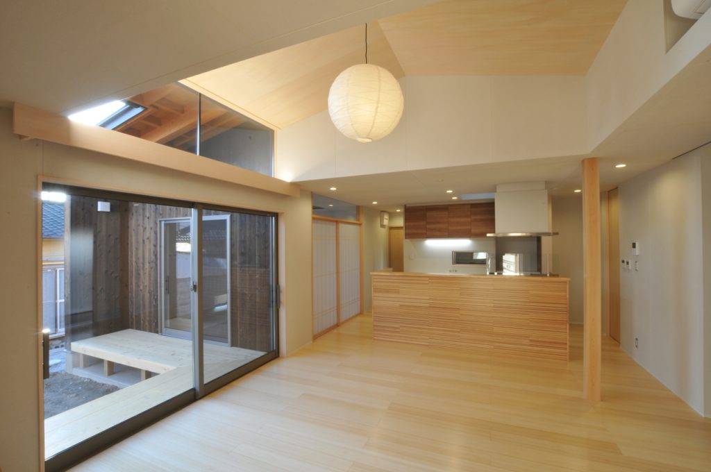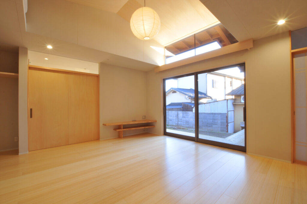 全体プランニングは、出来るだけコストダウン図るため、アプローチと駐車場部分だけ土を鋤取り、最小限の土工事として建物本体の地盤レベルは元のままにしてあります。ここで生じた段差を利用して小屋裏収納を設けています。また同時にこのレベル差によって駐車場から母屋への荷物の出し入れが容易になりました。内部は、主な部屋から南庭を望めるように配置計画しています。また完全な段差解消と引戸利用によるバリアフリー対応となっています。