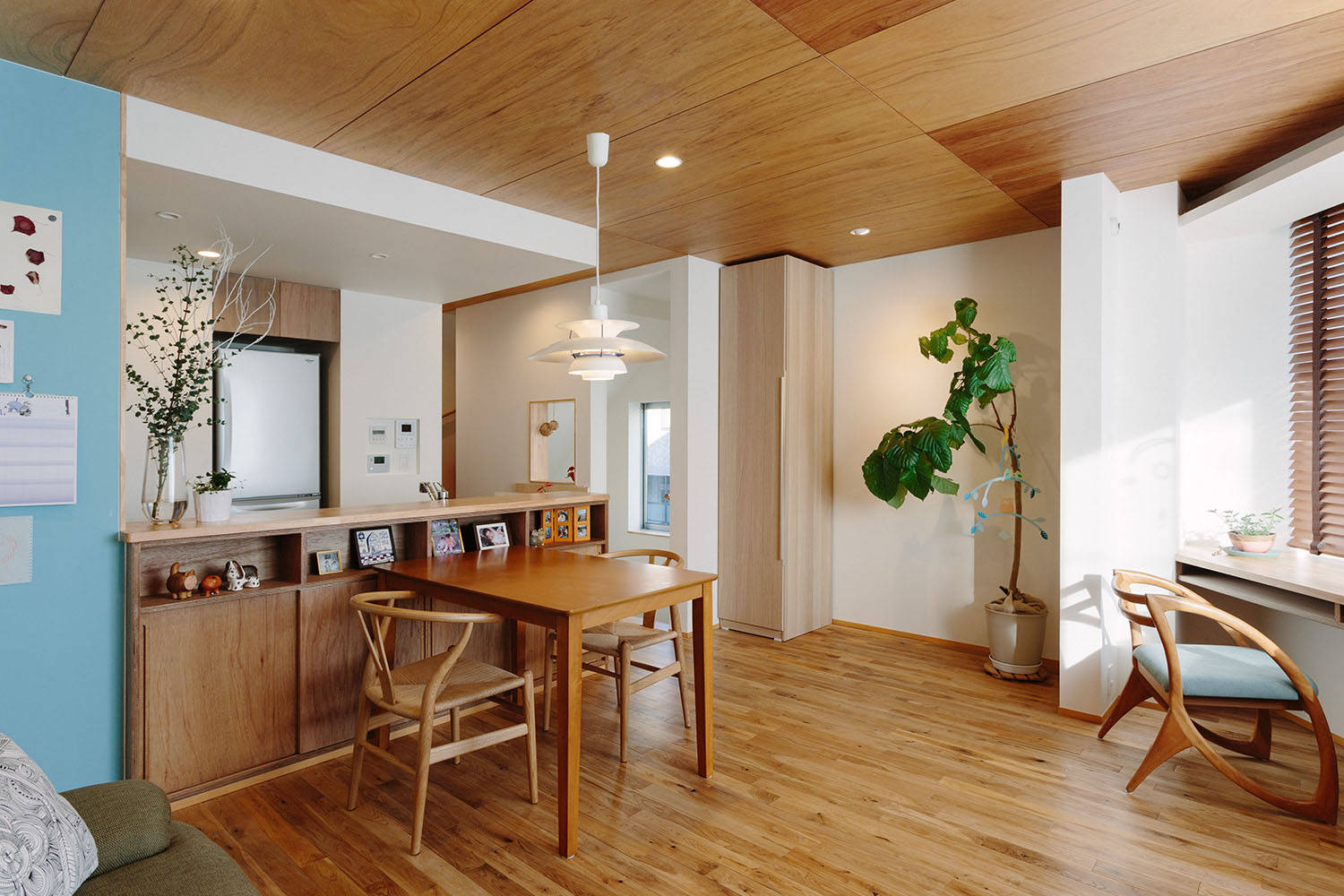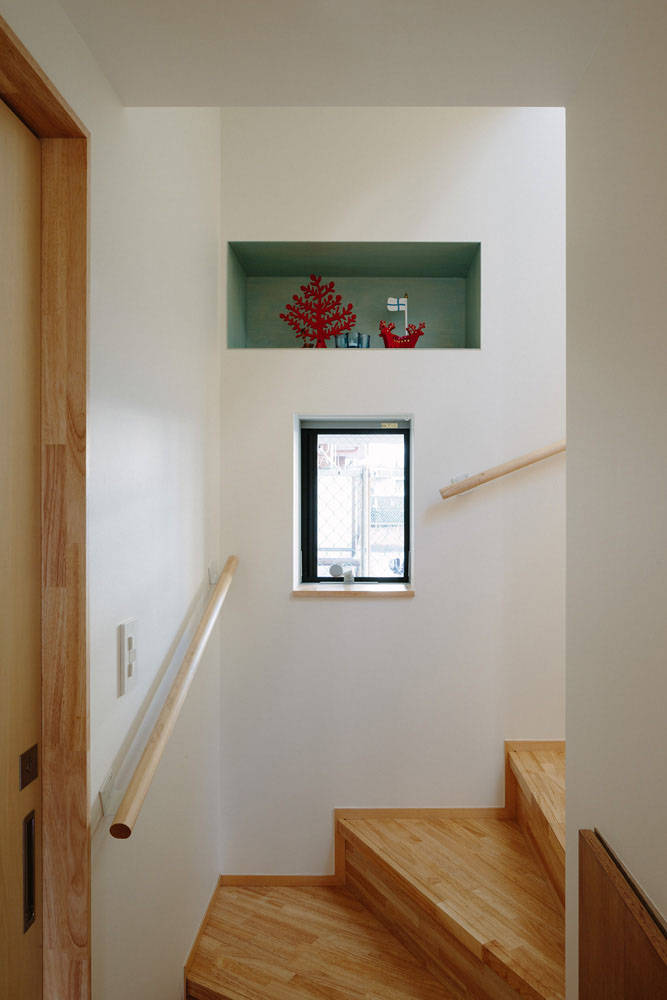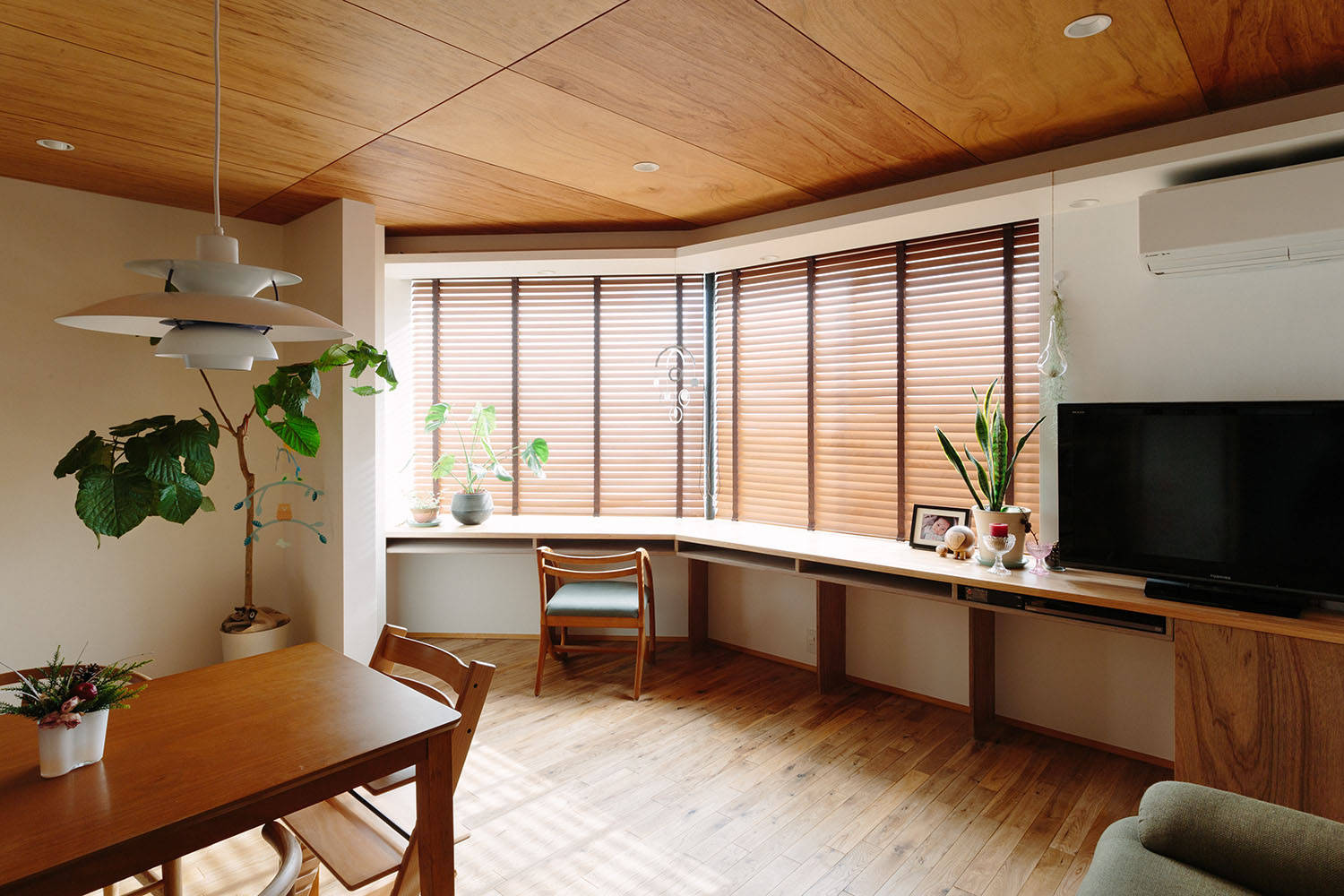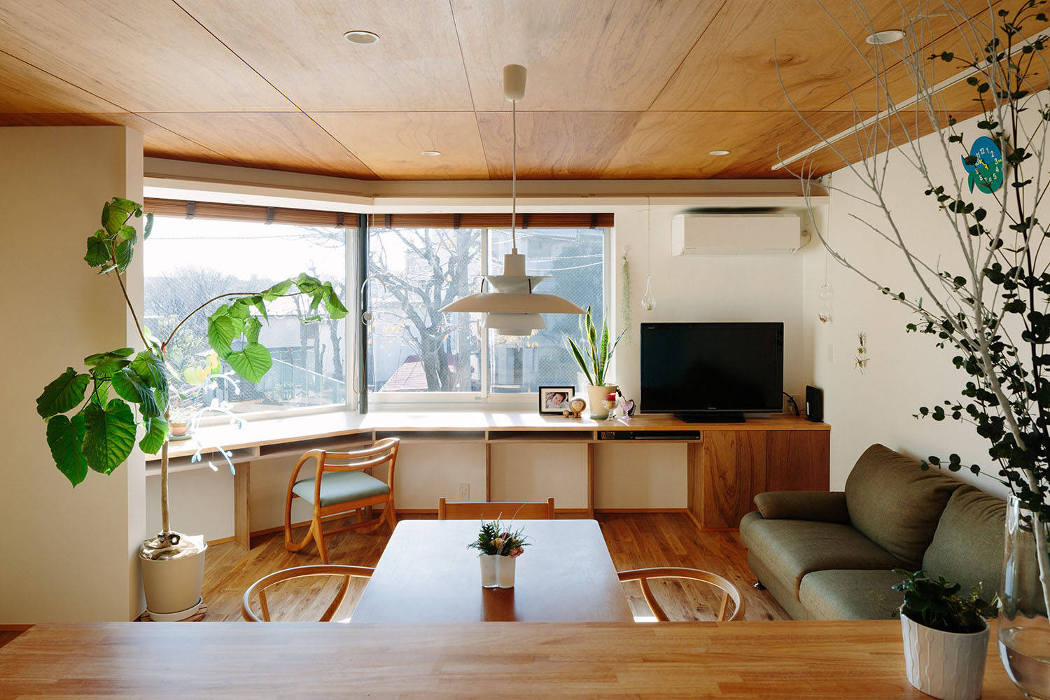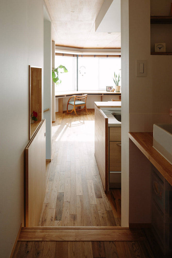 この開口部まわりには一続きの机コーナーをしつらえ、窓まわりの溜まりの空間としています。ぼんやり周囲の景色を眺めたり、家事をしたり、子どもの勉強をみたり…。この場は、外との連続を意識した縁側のような空間でもあり、内部での生活行為に伸びしろをつくる空間でもあります。