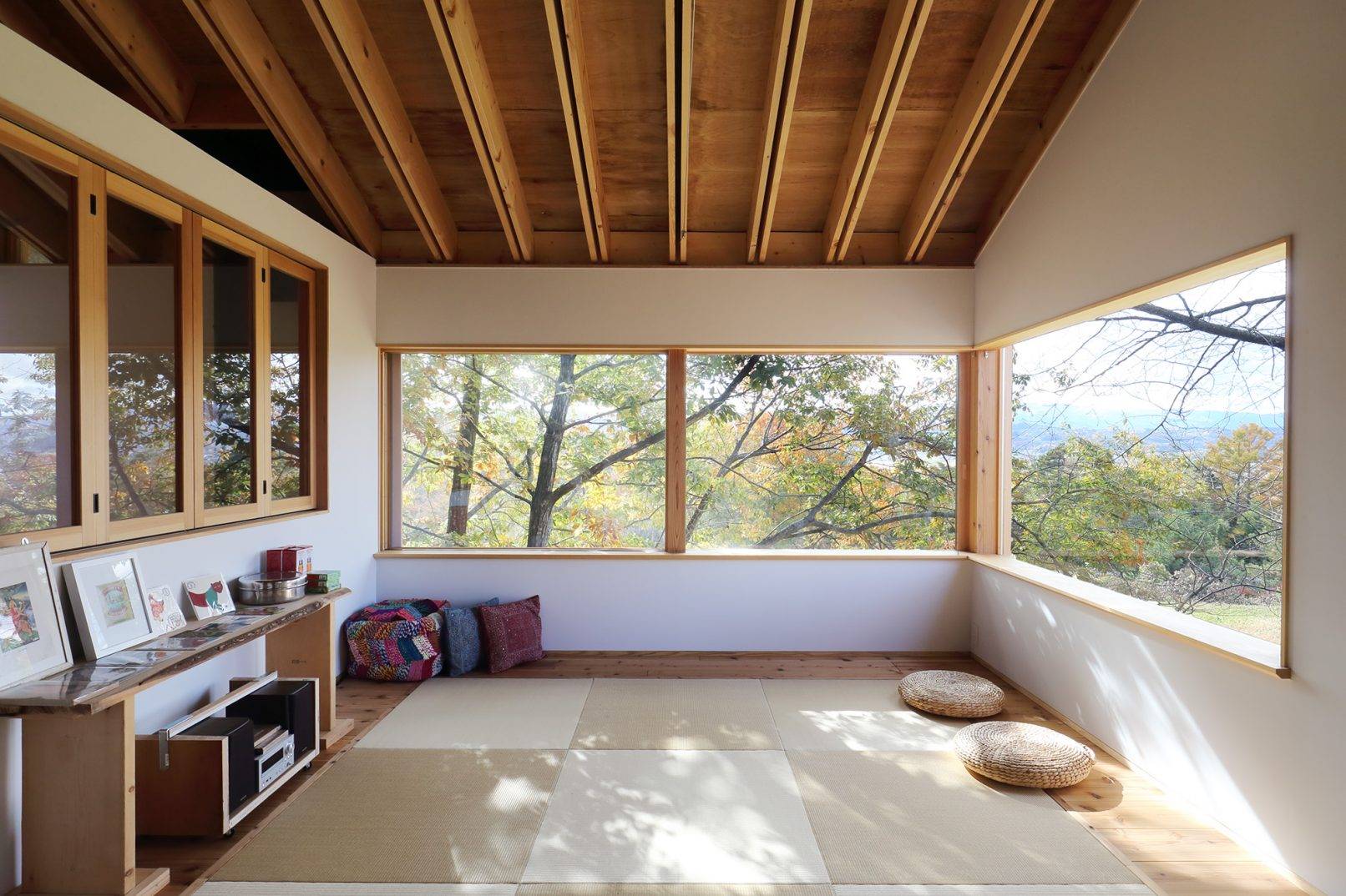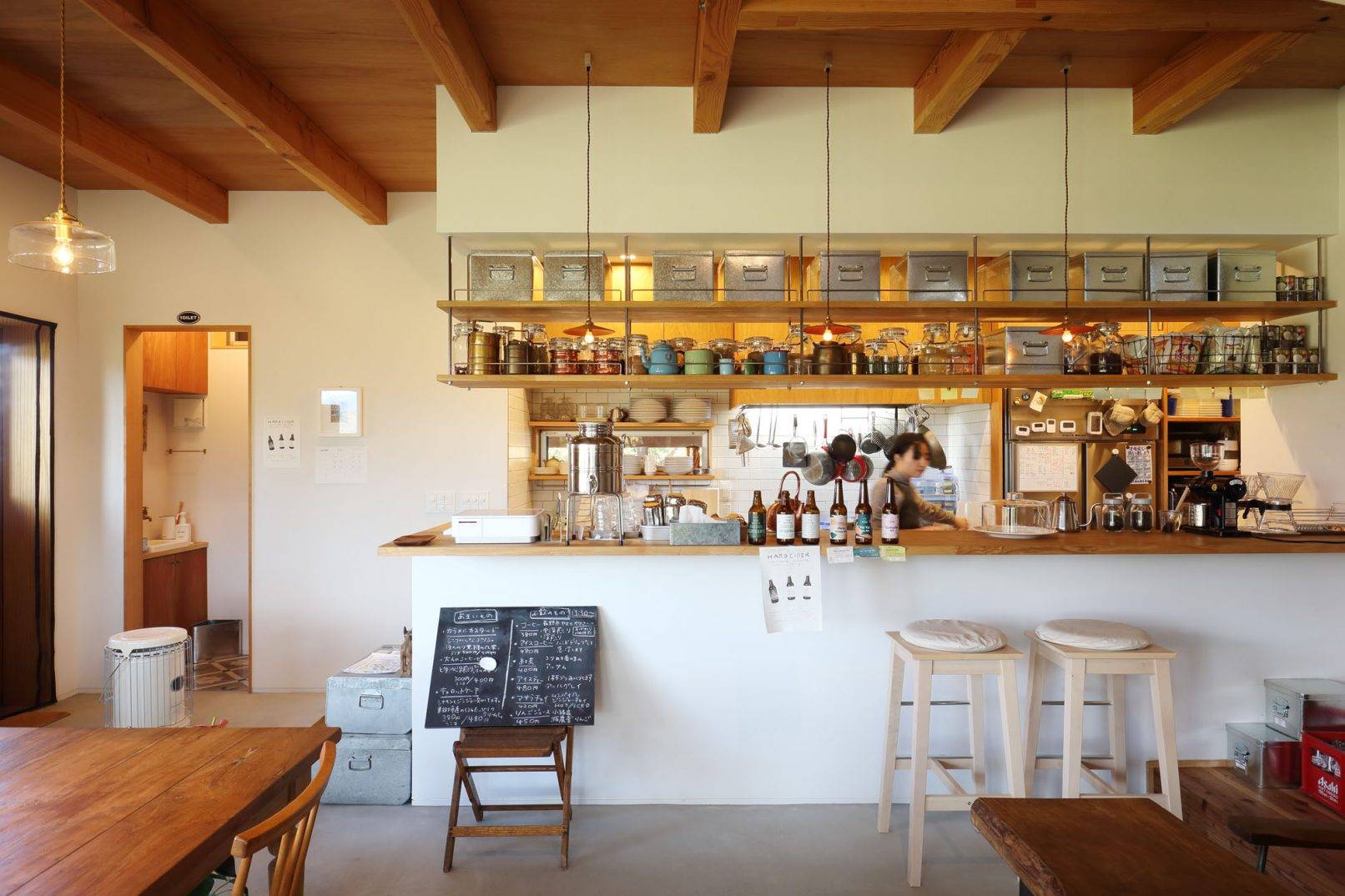 天井は仕上げをせず架工を現しとすることで、空間の気積を最大限確保すると共に、木の質感を感じる印象的を空間になっています。