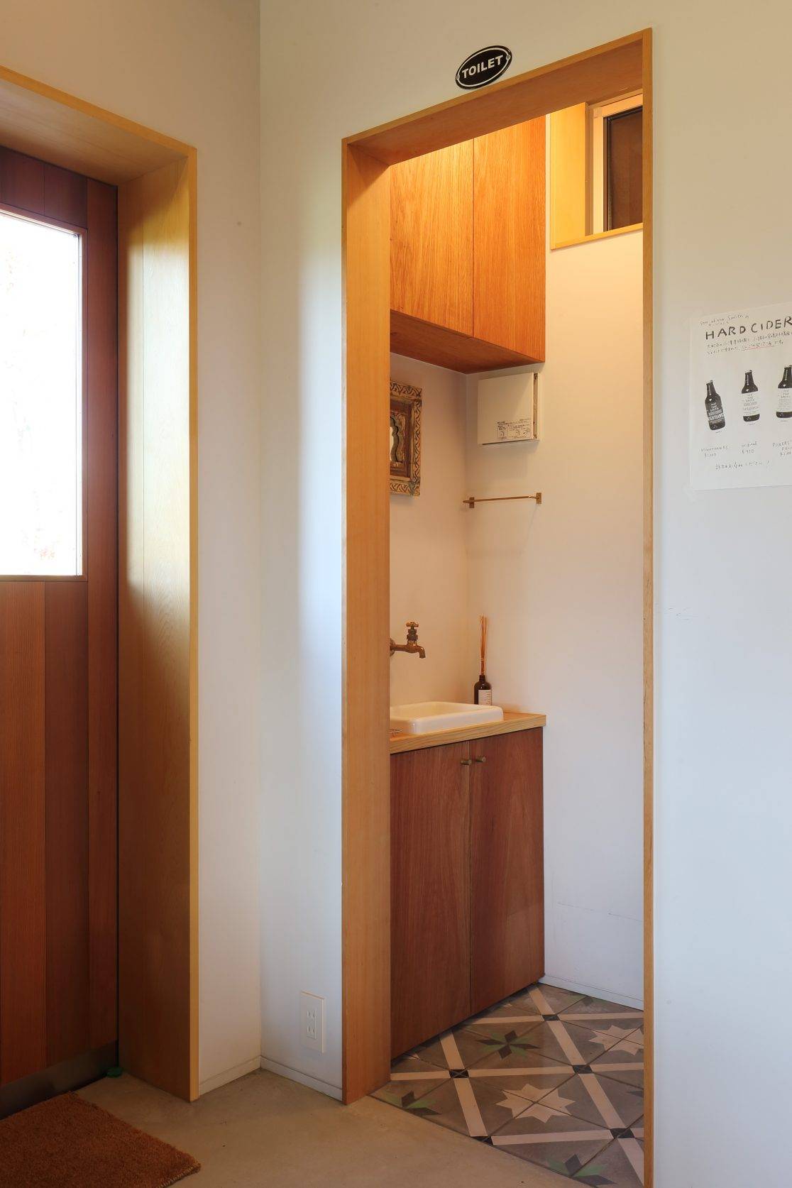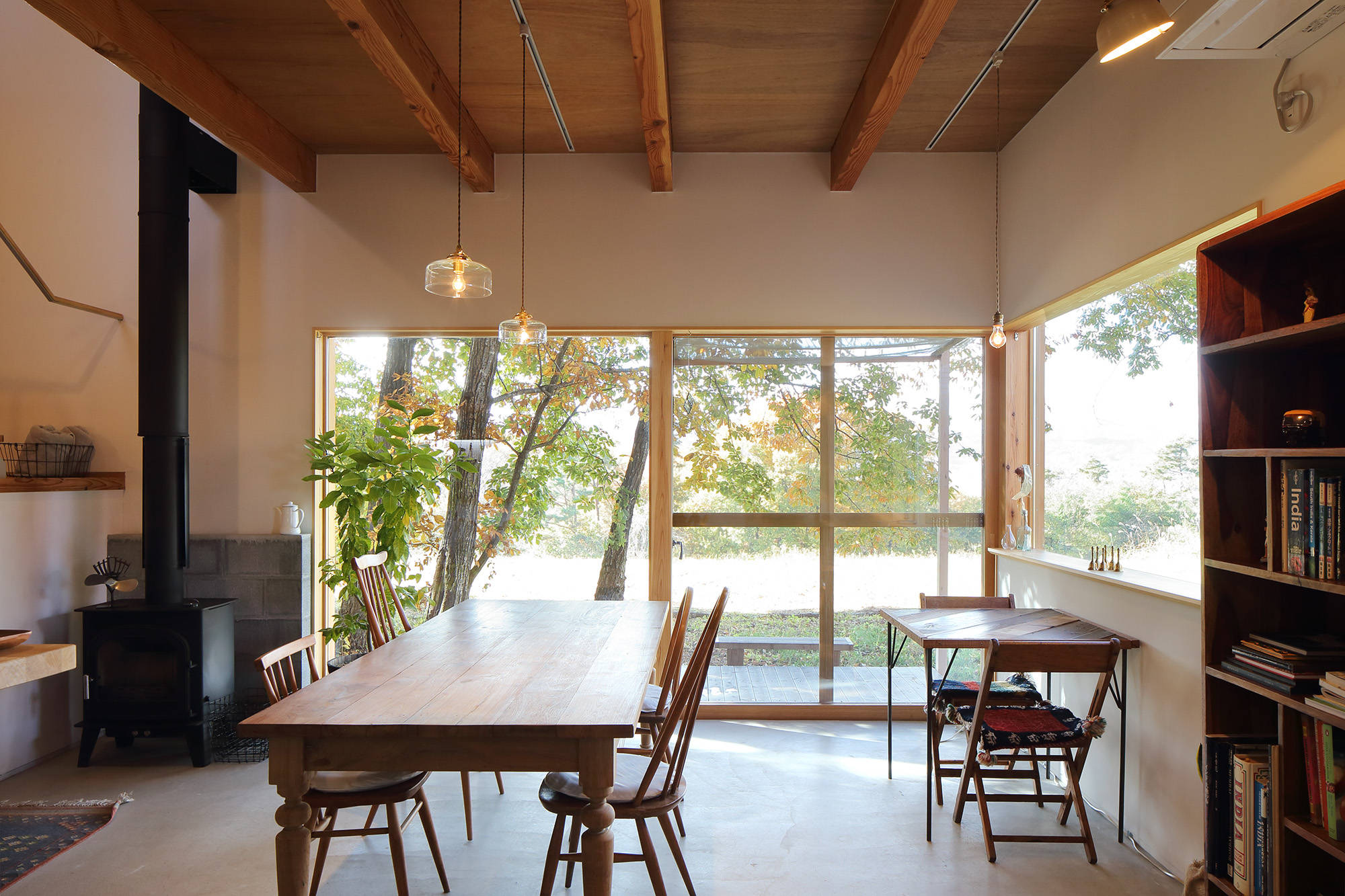 インテリアでは、セメントタイルの床仕上げやインドでつくられた本棚、テーブルなどが配置され空間を特徴付けています。