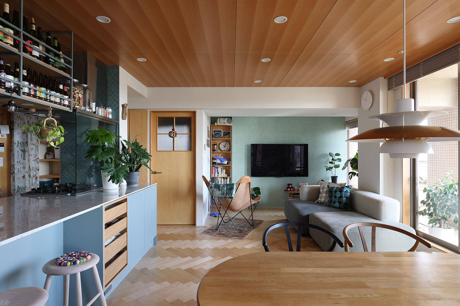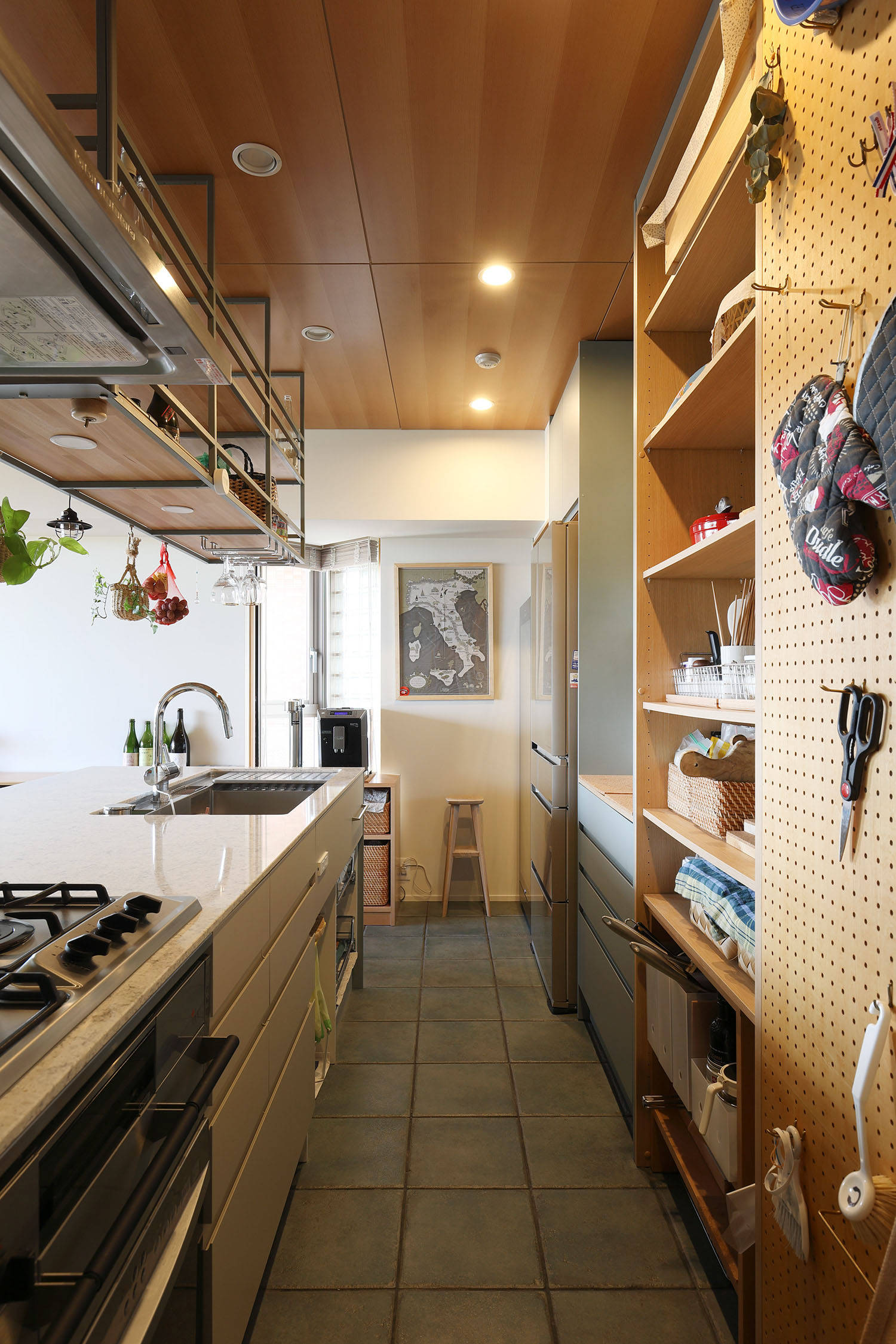 新たな間取りではアイランド型のキッチン配置とし、会話を楽しみながら料理がおこなえるようになっています。キッチン動線には回遊性を持たせています。脇にはパントリーを設け収納力が向上しました。空いた子ども部屋のスペースはリビングとして拡張され、より奥行きと採光のとることができる豊かな空間となりました。