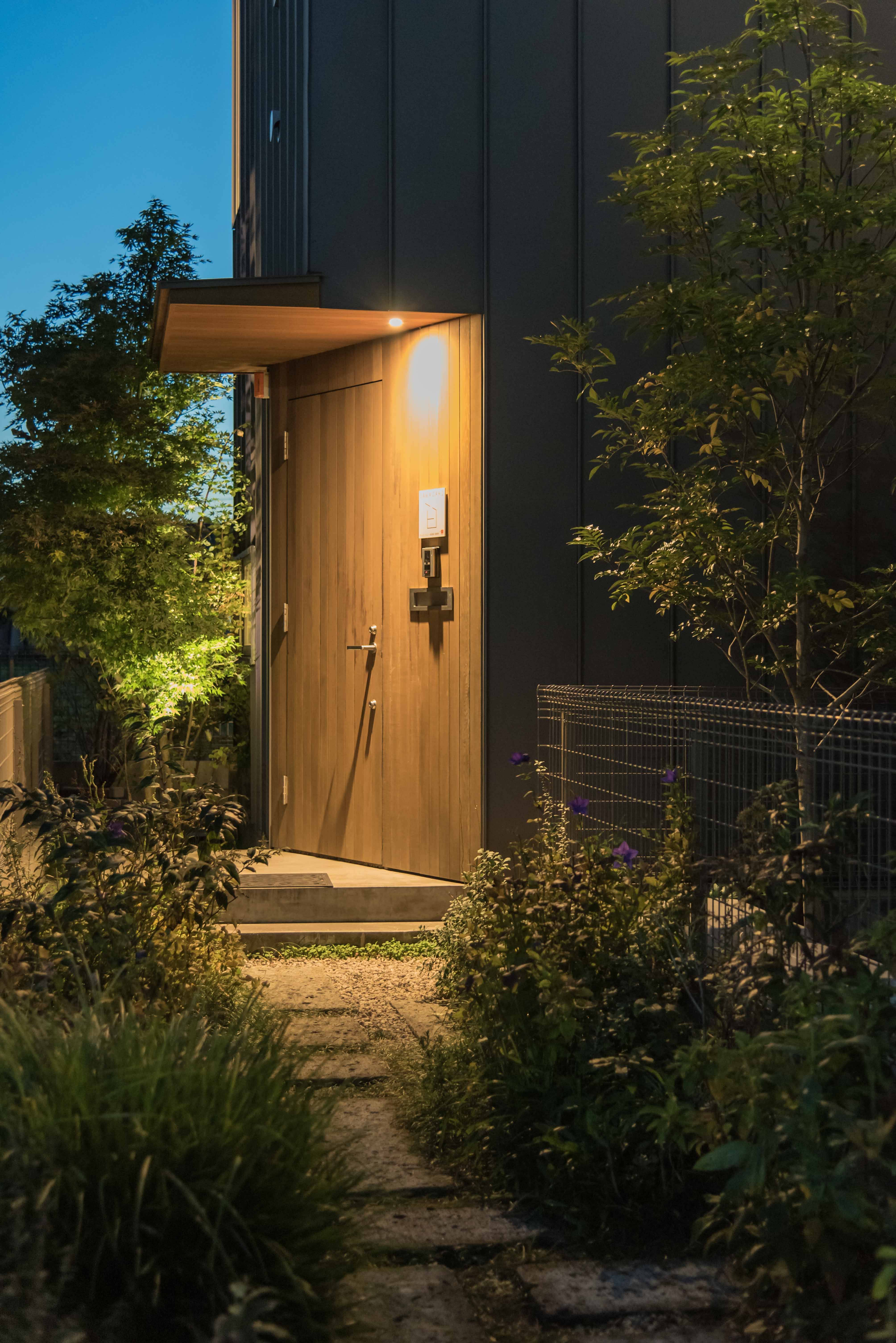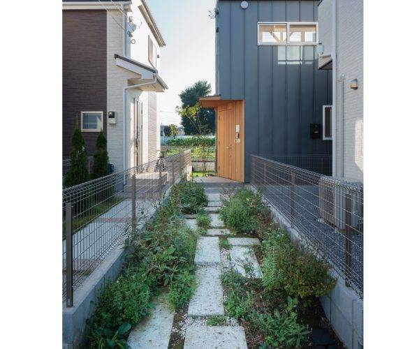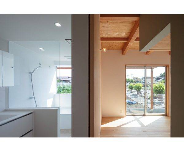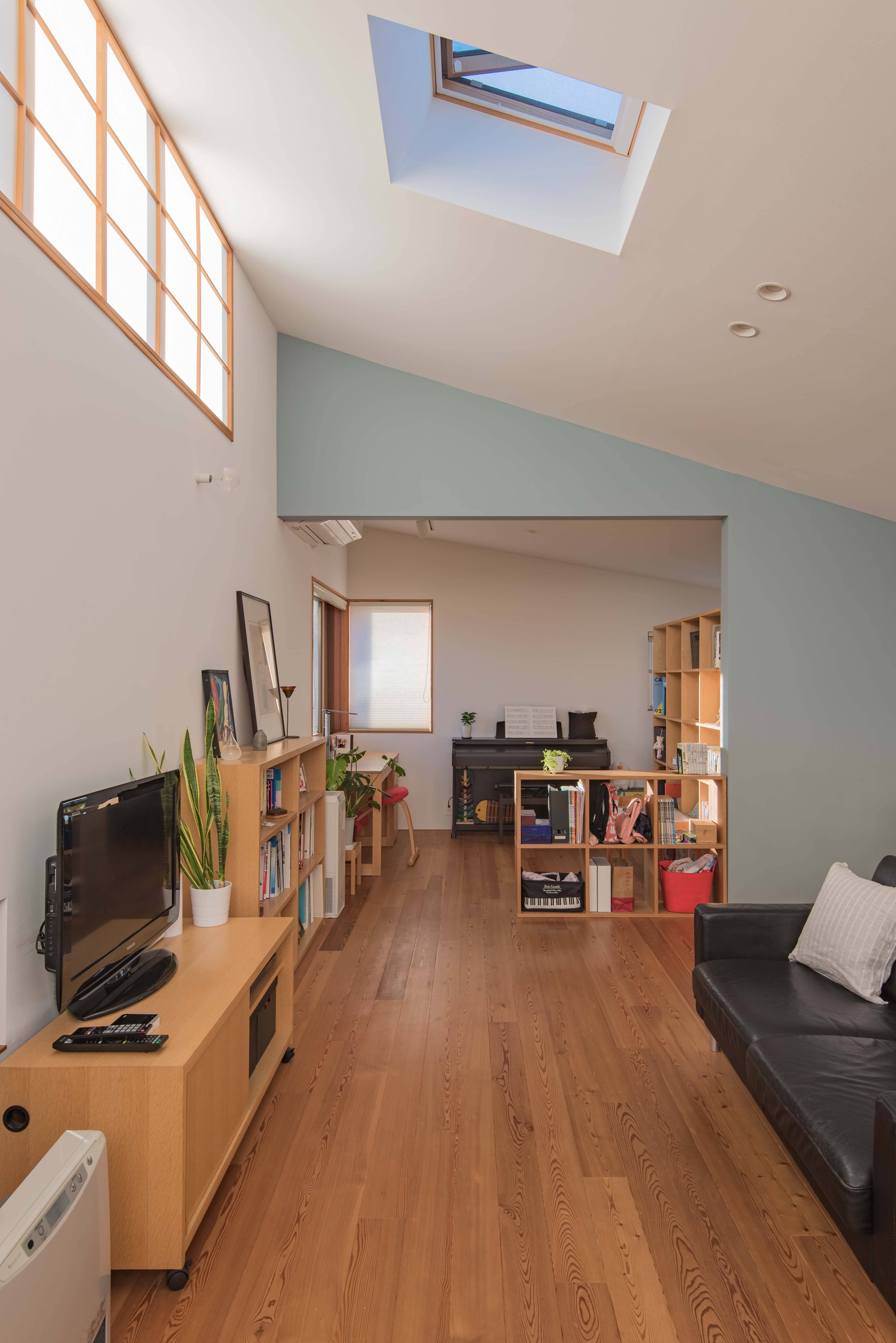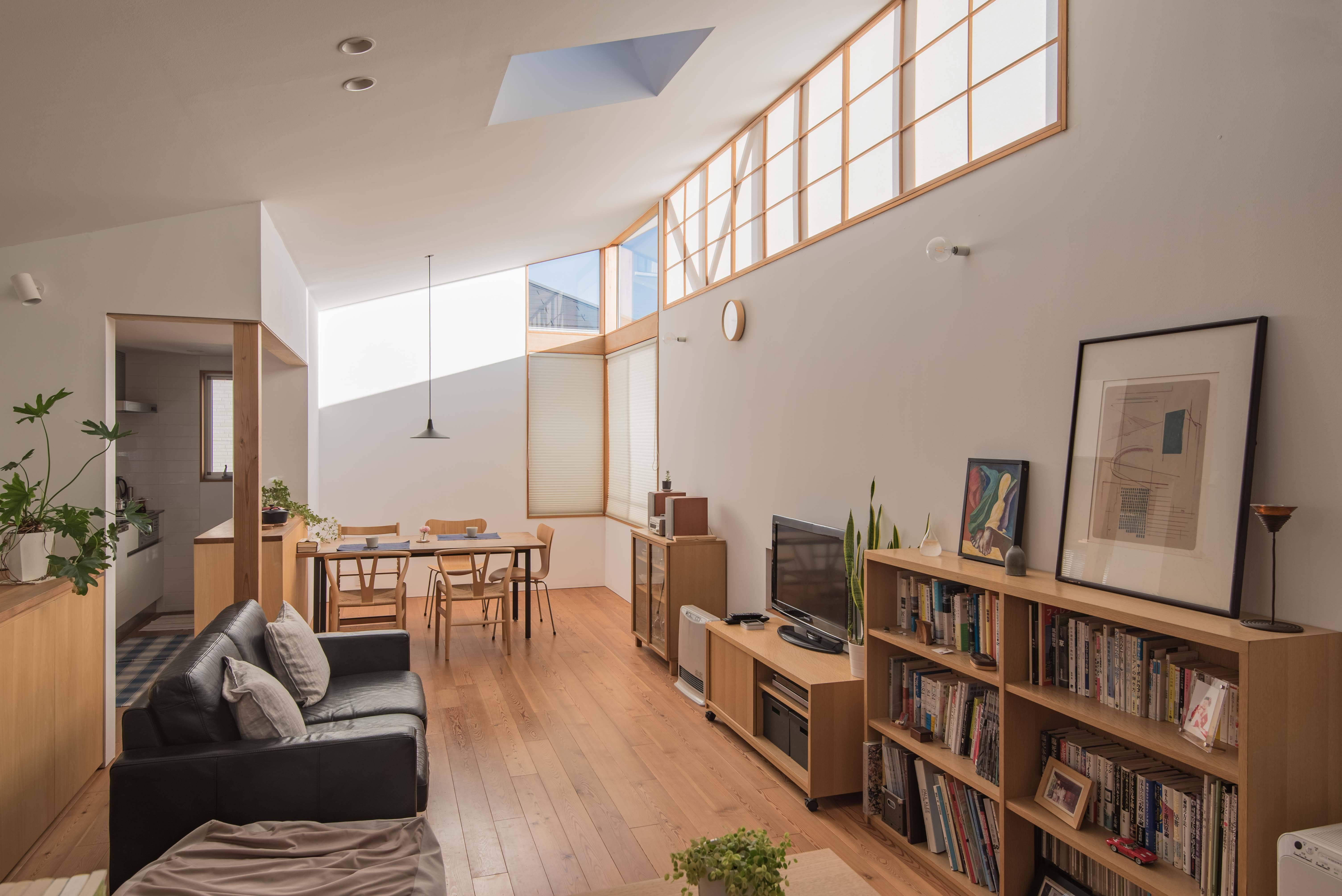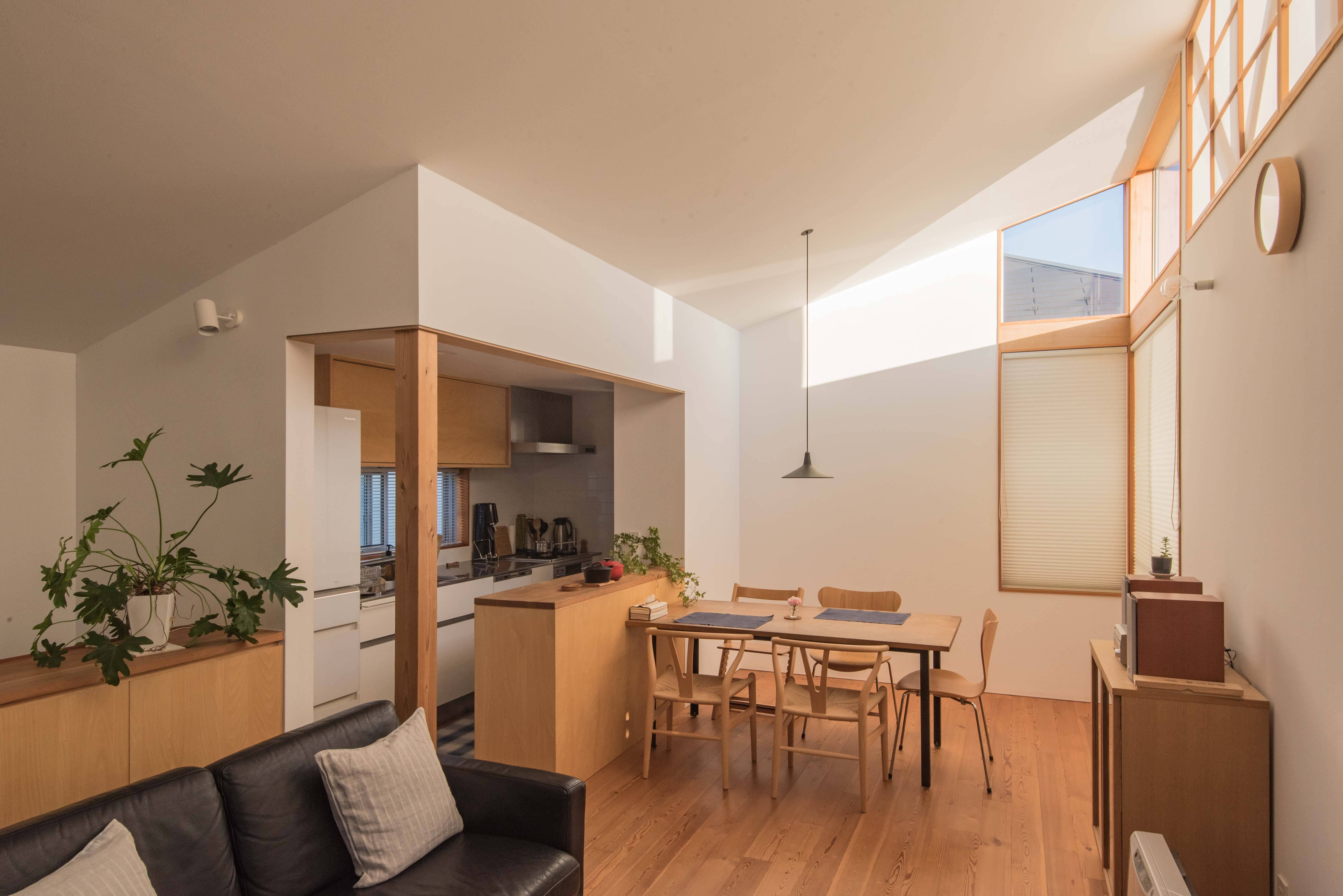 自宅兼アトリエの建物。敷地は同じようなボリュームの建物が建ち並ぶ住宅街。陽が差さないイメージの旗竿地だったが、高い位置に窓を設けることにより、まぶしいほどに明るい室内となっている。南側隣地に将来家が建つことを想定し目線には窓を設けず、左右の隅角部に開口を設けた。2階にリビングダイニングを配置したのだが、敷地長手分の幅があり、角隅の視線が抜けることによりさらに広がりを感じさせる。勾配天井が3.4m近くまで上がり、のびやかな空間となっている。建物の形状をシンプルにし、構造材を小さく抑えることによりローコストを実現している。